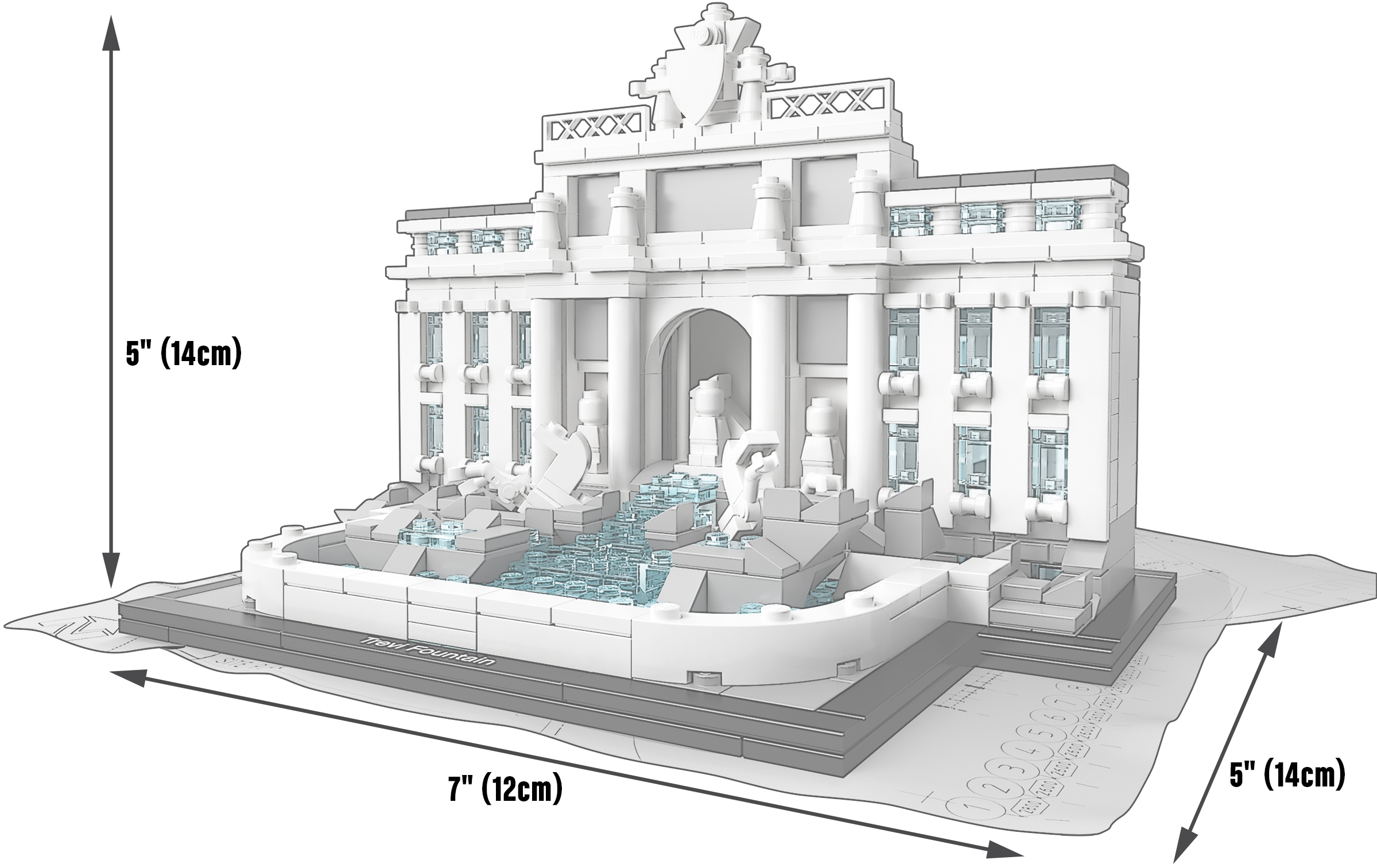 Recreate a truly iconic landmark of Rome – the Trevi Fountain! Construct a detailed LEGO® brick model of the world-famous Trevi Fountain, the largest fountain in Rome. Designed by Nicola Salvi, the ‘Fontana di Trevi’ took 30 years to build and was completed by his friend – the sculptor, Pietro Bracci – in 1762, 11 years after Salvi’s death. This stunning Baroque monument carved from Travertine stone has been the backdrop for many classic movies, including Federico Fellini’s La Dolce Vita. And, today, over 250 years later, the 49-meter-wide fountain still draws thousands of visitors to the small Trevi square.