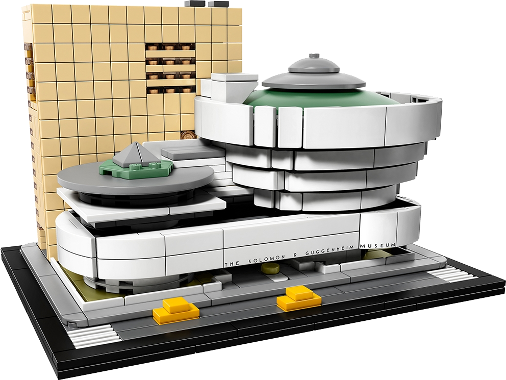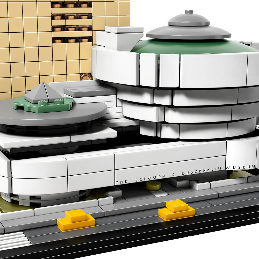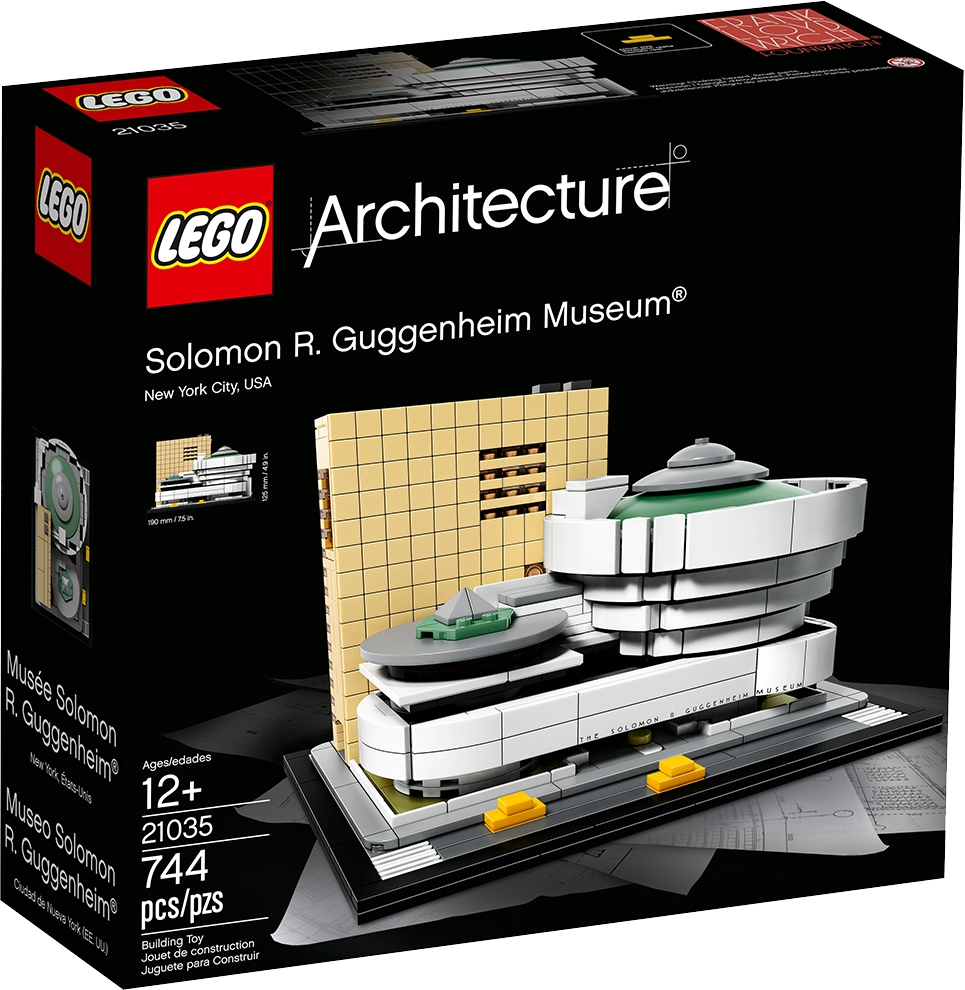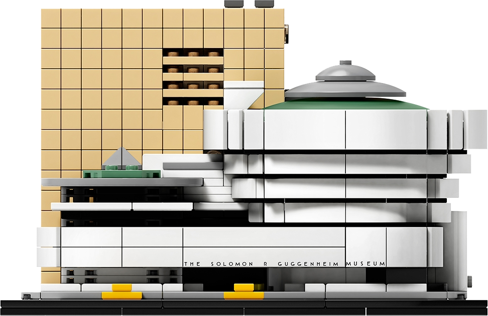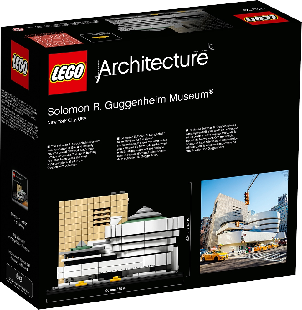 Discover the architectural secrets of Frank Lloyd Wright’s Solomon R. Guggenheim Museum®. This accurately detailed LEGO® model faithfully recreates the curves and distinctive lines that have made this building an architectural icon for the last half-century. The simple, grid-patterned facade of the annex tower complements the main building with its circular rotundas, while buildable exterior elements depict a section of New York City’s 5th Avenue Museum Mile, complete with its signature yellow cabs. The Guggenheim sign, featuring Wright’s architectural lettering, has also been recreated in a similar typeface to heighten the authenticity of the model. This LEGO Architecture model has been designed to deliver a rewarding building experience for all with an interest in architecture, travel, history and design, and is suitable for display in the home and office. LEGO® Architecture interpretation of the real-world architectural landmark, the Solomon R. Guggenheim Museum®. Features the Guggenheim’s modernist facade with its circular rotundas and distinctive lines, plus the eight-story annex tower and a section of New York City's 5th Avenue Museum Mile including scaled yellow cabs. The Guggenheim sign, featuring Wright's architectural lettering, has also been recreated in a similar typeface to complement the authenticity of the model. The included booklet contains information about the design, architecture and history of the building (English language only. Other languages available for download at LEGO.com/architecture). LEGO® Architecture celebrates the world of architecture through the medium of the LEGO brick, and is developed for all with an interest in travel, architecture, history and design. This set includes over 740 LEGO® pieces and offers an age-appropriate building experience for ages 12+. Measures over 4” (12cm) high, 7” (19cm) wide and 5” (14cm) deep.