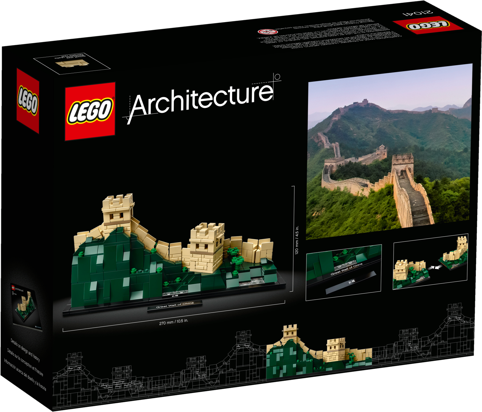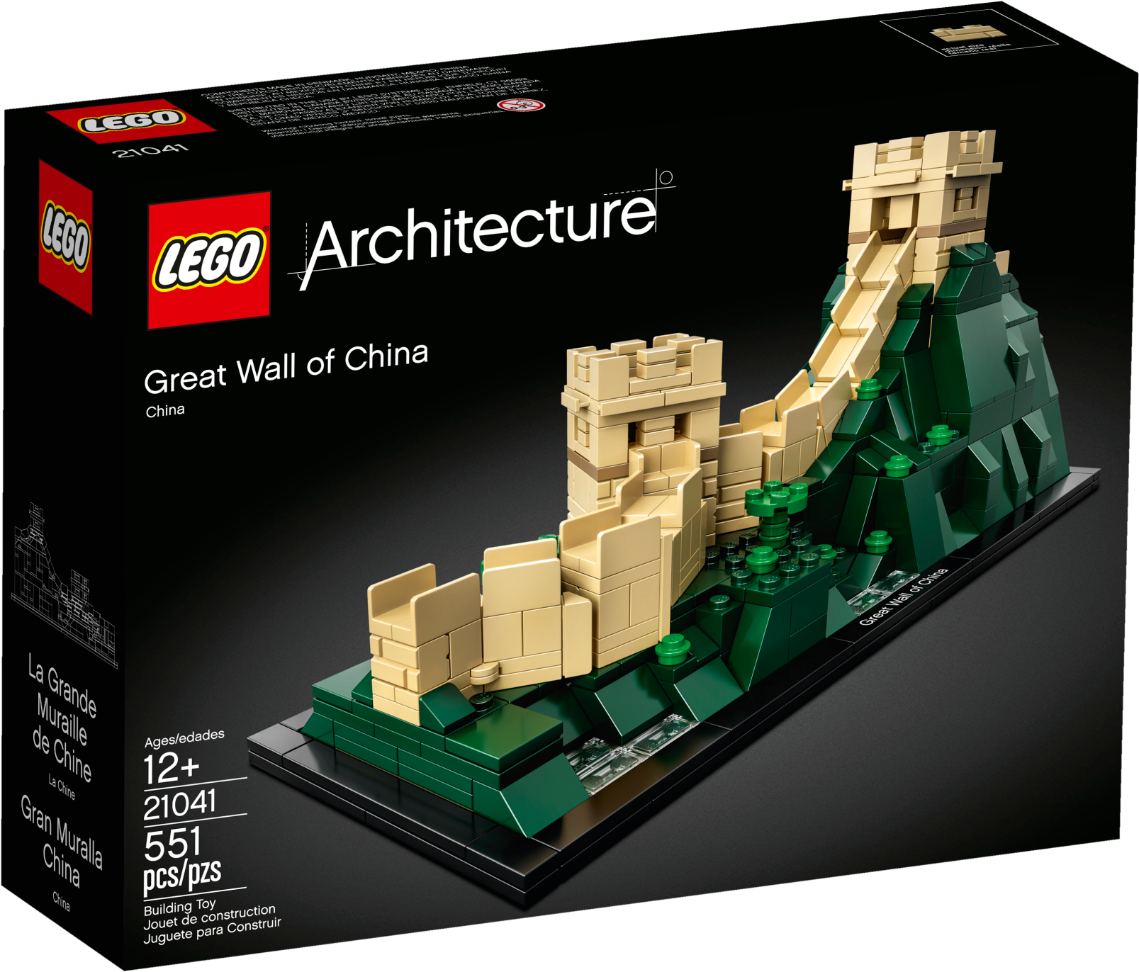 Discover the architectural secrets of the World Heritage Great Wall with this LEGO® Architecture 21041 The Great Wall of China set. Explore the ingenious building techniques that allow the structure to drape across thousands of miles of countryside, curving up, down and around mountains and rugged undulating terrain to form a harmonious blend of nature and architecture. This accurately detailed LEGO interpretation depicts 2 turrets joined by a winding section of wall atop a dark-green mountainous landscape with lush valleys, trees and lakes, and is finished with decorative English and Chinese nameplates. The model has been designed to deliver a rewarding and relaxing building experience to all with an interest in architecture, travel, history and design, and makes a truly dynastic centerpiece for the home or office. Connect multiple models to extend your Great Wall display.