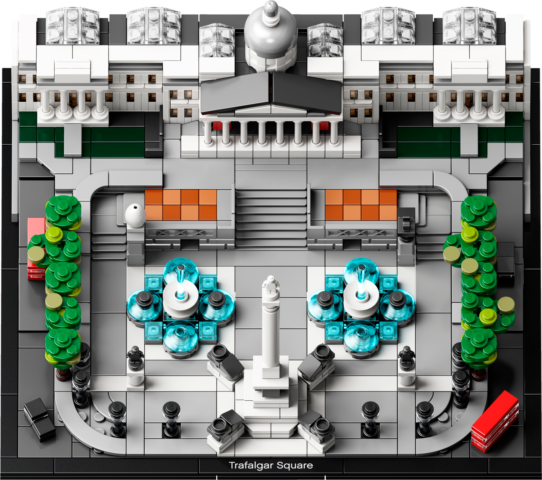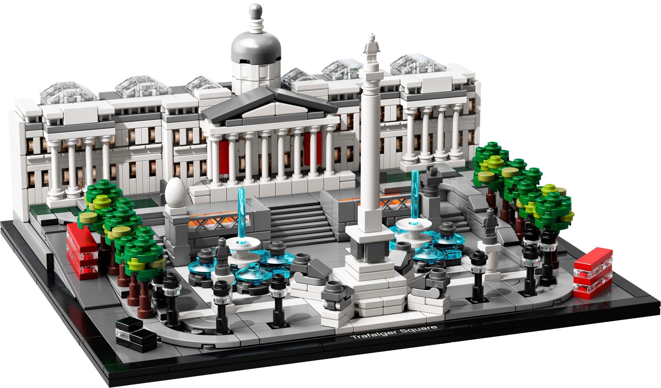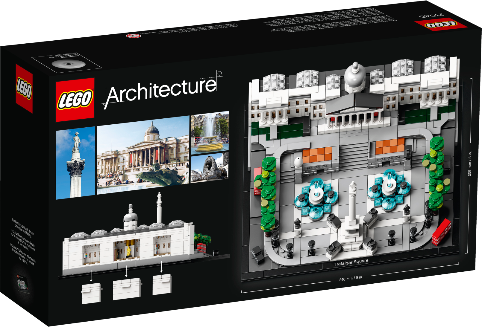 Capture the essence of a historical London landmark with the LEGO® Architecture 21045 Trafalgar Square set. Named in honor of Lord Horatio Nelson following his 1805 naval victory over Napoleon, the square has since become a popular tourist attraction and preferred location for political and community gatherings. This detailed LEGO interpretation depicts the domed National Gallery complete with columned facade, Nelson's Column flanked by 4 lions, the square's famous fountains and 4 sculpture plinths. The sections at the rear of the National Gallery structure can be removed for access to a detailed interior with brick-built statue and paintings. Tree-lined borders, ornate lampposts, 2 London buses, 2 black cabs and a tiled baseplate depicting the square and surrounding roads complete the model. Finished with a decorative nameplate, this collectible building set delivers a highly satisfying building experience to all with an interest in architecture, travel, history and design, and makes a truly iconic centerpiece for the home or office. LEGO® Architecture interpretation of the real-world London landmark, Trafalgar Square. Features the National Gallery, Nelson’s Column flanked by 4 lions, 2 fountains, 4 sculpture plinths, 10 trees, 6 lampposts, and a tiled baseplate depicting the square and road areas complete with 2 London buses and 2 black cabs. The included booklet contains information about the architecture and history of each structure, as well as historical facts about Trafalgar Square and its architectural heritage. (English language only. Other languages available for download at LEGO.com/architecture). Includes a decorative Trafalgar Square nameplate. LEGO® Architecture celebrates the world of architecture through the medium of the LEGO building brick and is developed for all with an interest in travel, architecture, history and design. This set includes over 1,190 pieces. Enjoy a pleasantly challenging and rewarding building experience with this LEGO® Architecture set. Measures over 4” (12cm) high, 9” (24cm) wide and 7” (20cm) deep.