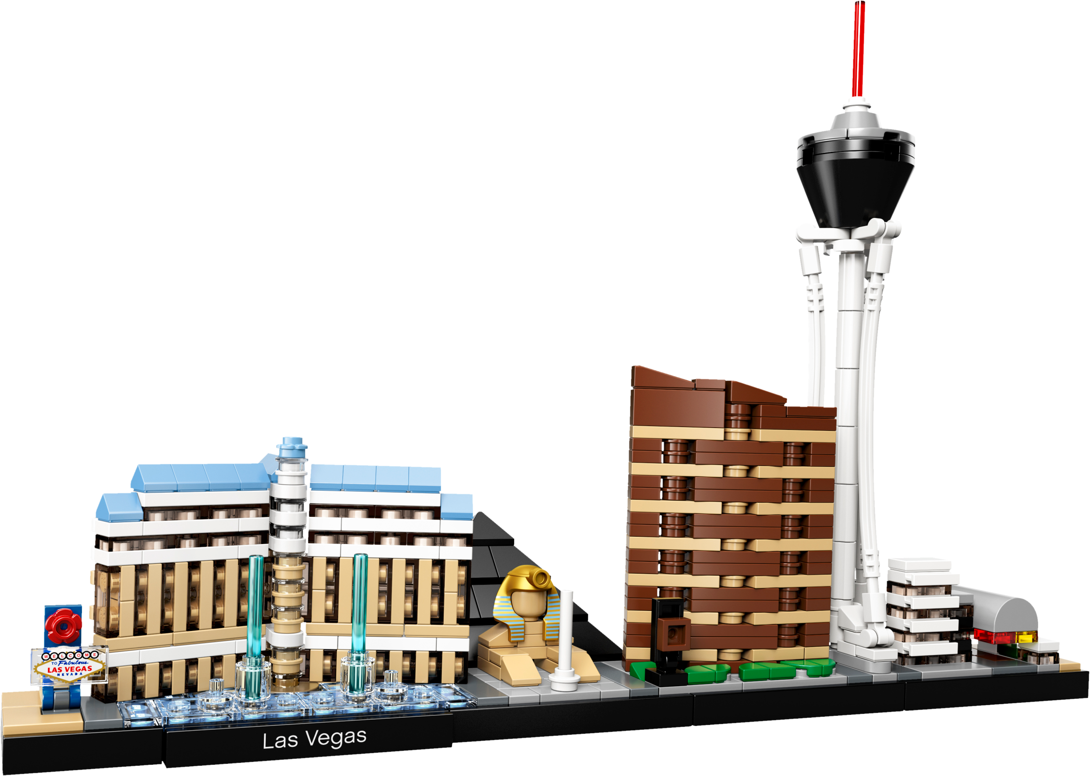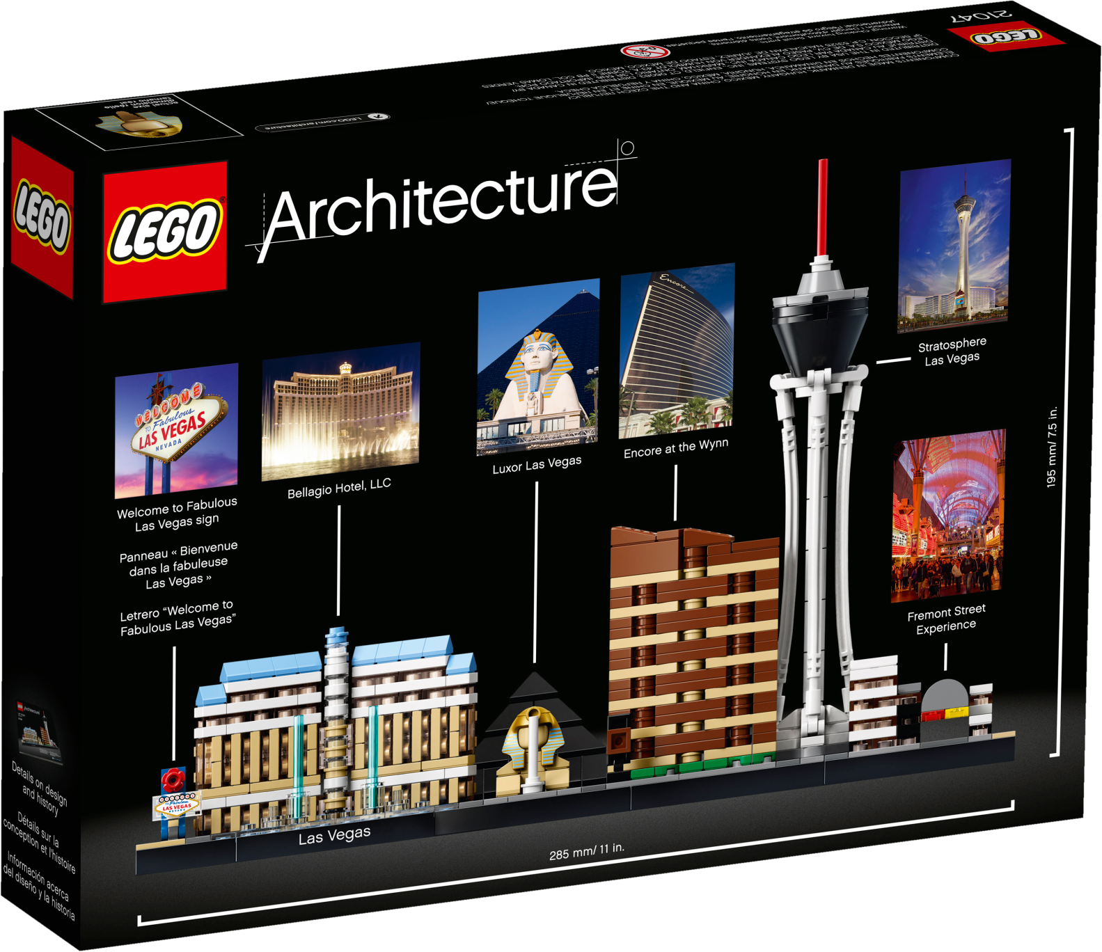 Recreate the architectural magnificence of Las Vegas, Nevada, with this realistic 21047 LEGO® Architecture Skyline Collection model. This LEGO brick collectible features iconic attractions located on and around the Las Vegas Strip, including the Bellagio Hotel, Luxor Hotel, Encore Hotel, Stratosphere Tower and the downtown Fremont Street Experience, and is finished with a decorative “Las Vegas” nameplate. LEGO Architecture Skyline Collection models are suitable for display in the home and office, and have been developed for all with an interest in travel, architectural culture, history and design. Each souvenir toy is scaled to give an accurate representation of the comparative size of each structure, with realistic color depiction.