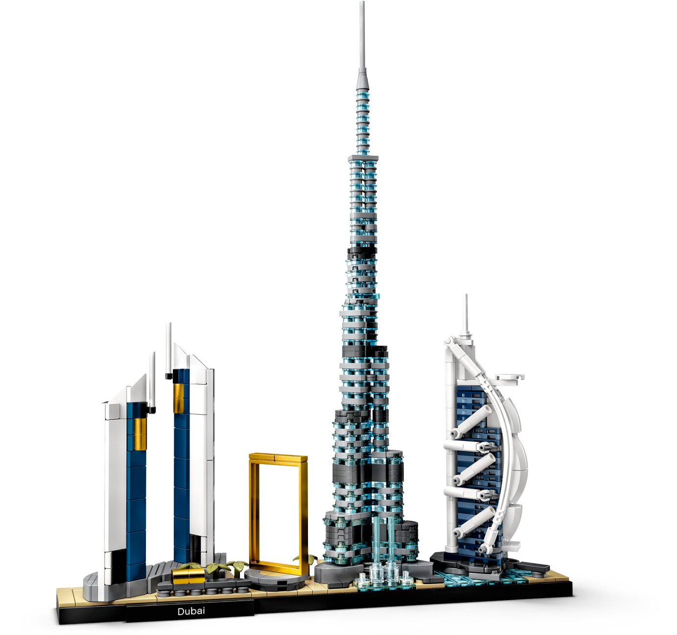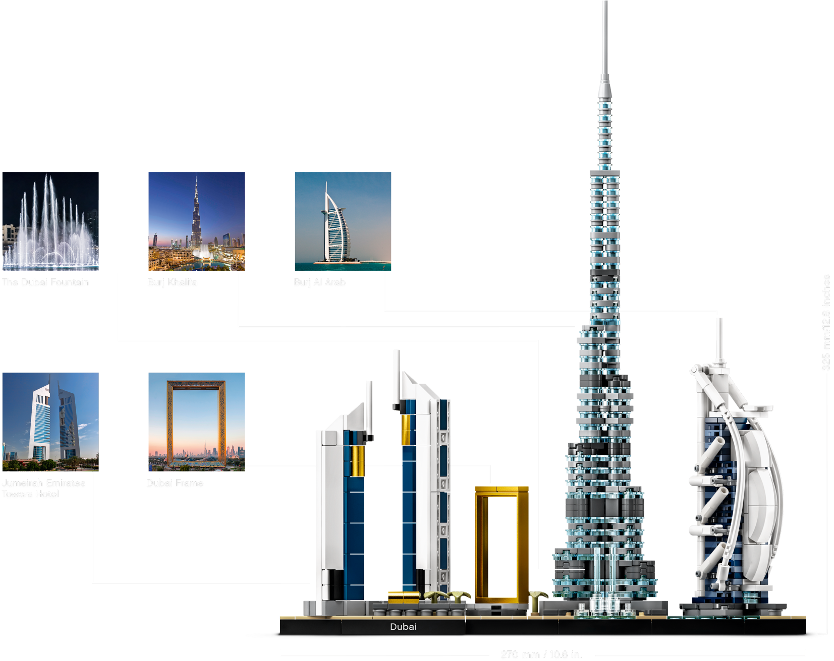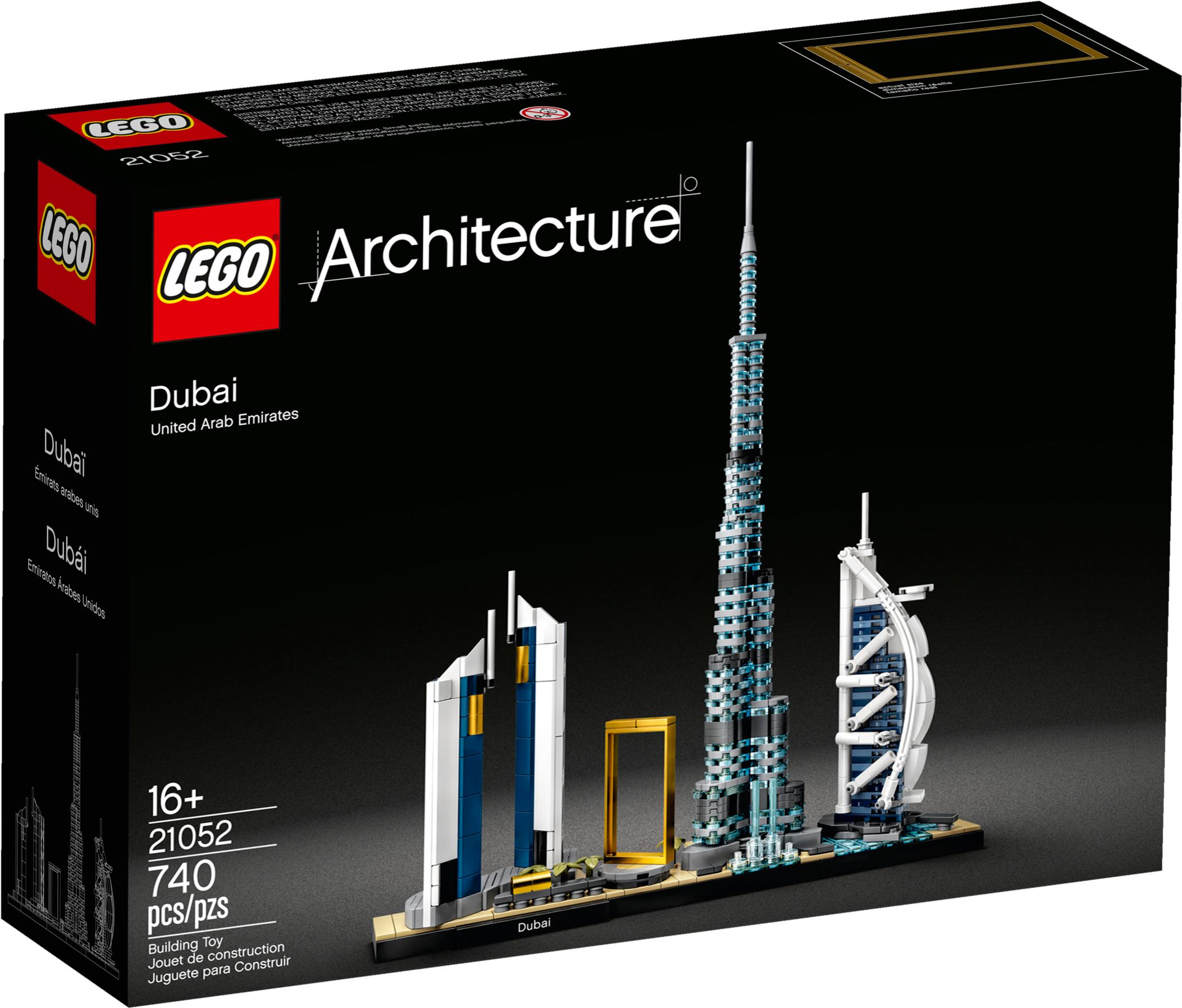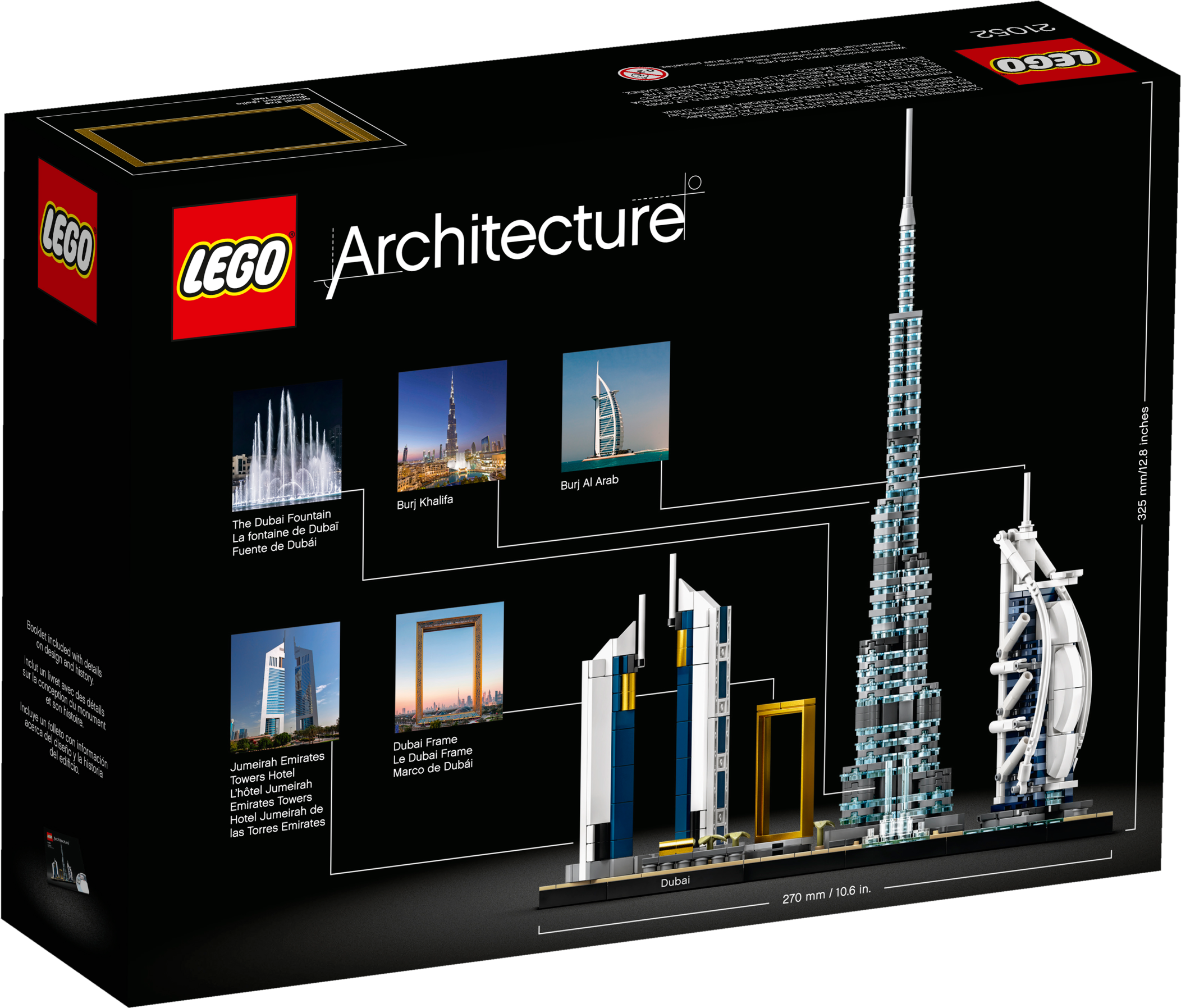 Dubai boasts some of the most spectacular buildings in the world. Now residents, tourists and all admirers of this futuristic city can recreate its iconic landmarks with this LEGO® Architecture Skyline Collection 21052 Dubai model kit.Stunning structures!This building set for adults includes scale models of Burj Khalifa, the world's tallest building on completion in 2010, the 7-star Burj Al Arab Jumeirah hotel, the Jumeirah Emirates Towers Hotel, plus The Dubai Fountain and the extraordinary Dubai Frame. With easy-to-follow instructions, even LEGO newbies will be able to build the detailed miniatures. And when displayed together on the base, this cool, collectible desk toy is sure to grab people’s attention.Introducing LEGO Architecture…From iconic landmarks to city skyline models, LEGO Architecture sets capture the essence of the world's best-known buildings, monuments and cities, so they make ideal creative gifts for anyone interested in architecture, travel, history anddesign.This spectacular LEGO® Architecture building set for adults brings together highly detailed models of iconic Dubai buildings and landmarks to inspire all admirers of this exciting, modern city.The Burj Khalifa, Jumeirah Emirates Towers Hotel, Burj Al Arab Jumeirah hotel, Dubai Frame and The Dubai Fountain are featured in this architecture model kit, a charming souvenir for anyone with an affinity for Dubai.Includes a base with a ‘Dubai' nameplate for display. And discover interesting facts about Dubai and the model designer in the booklet (English language only. Download other languages at LEGO.com/architecture.)This easy-to-build construction set is suitable even for first-time LEGO® architects. It makes a cool creative gift for adults aged 16+ who live or have lived in Dubai, holidayed there or dream of visiting one day.This compact Dubai skyline model measures over 12” (33cm) high, 10” (27cm) wide and 2” (7cm) deep – it might not take up much space, but it will make a big visual impact wherever you choose to display it!Building this battery-free construction kit for adults is an immersive, peaceful way to relieve stress. So relax, find your building Zen and create an awesome architecture model!Thinking of buying this collectible Dubai souvenir as a gift for a budding architect who is new to LEGO® building bricks? No worries. It comes with easy-to-follow, printed instructions in the box.LEGO® Architecture construction sets of iconic landmarks and city skyline models deliver rewarding building experiences for anyone interested in architecture, travel, history and design.Ever since 1958, LEGO® building bricks have met the highest industry standards, which means that they are consistent, compatible and connect and pull apart easily every time.LEGO® bricks are rigorously tested to ensure that every LEGO Architecture building set meets the highest safety and quality standards, so your beautiful Dubai souvenir will stand the test of time.