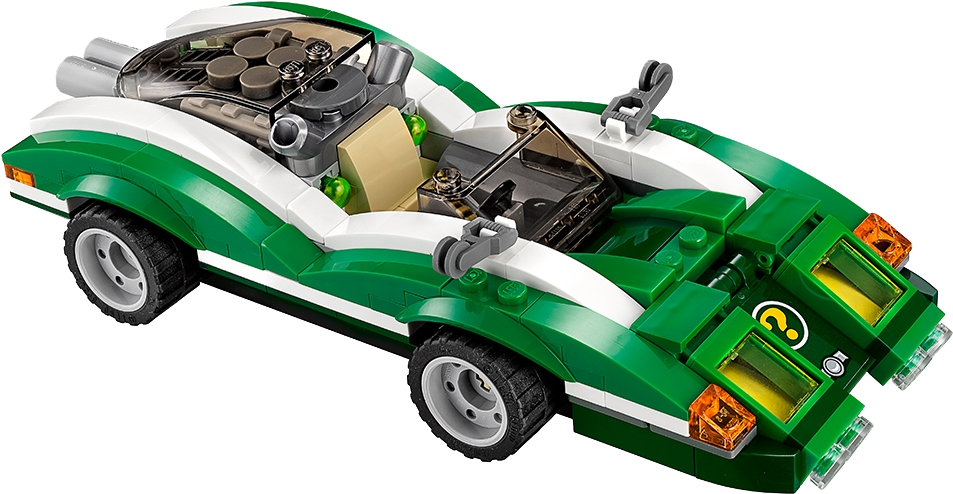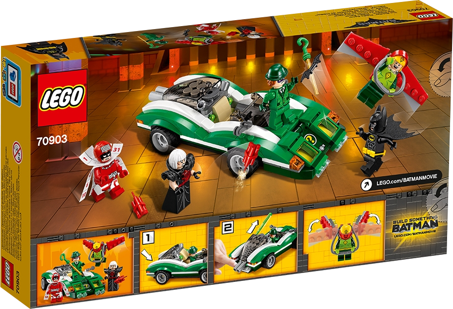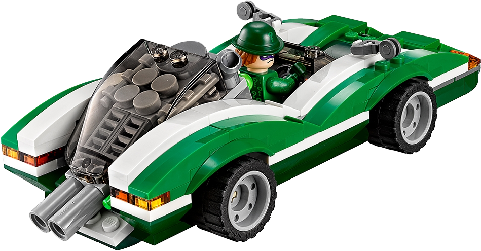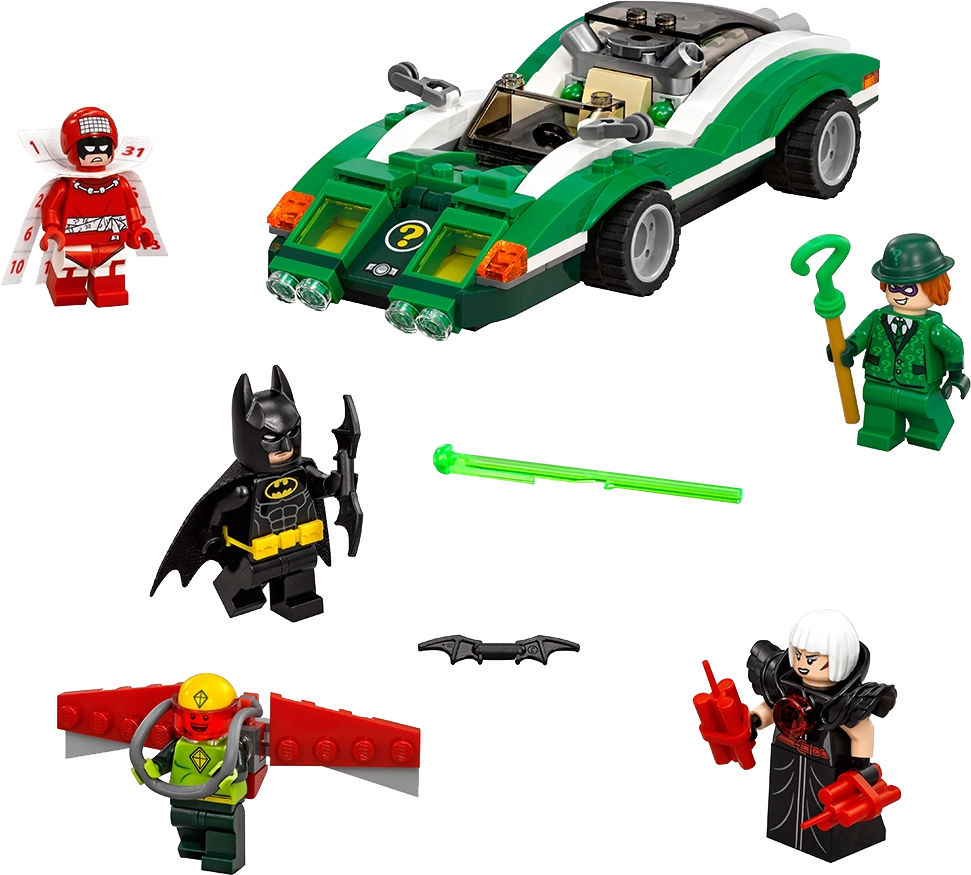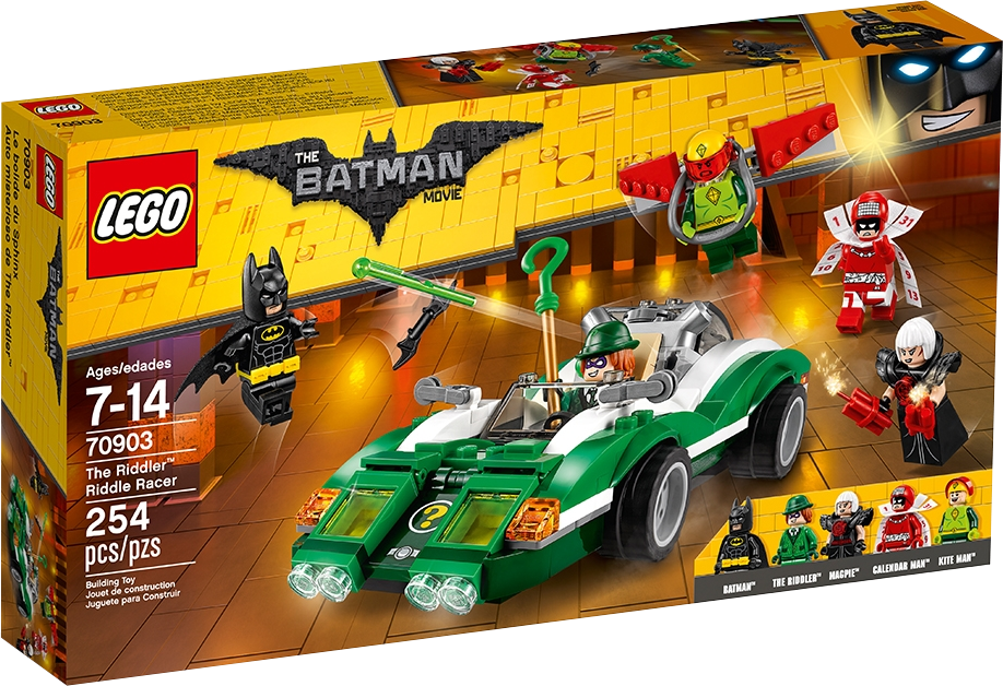 Take on four Super-Villains at once in THE LEGO® BATMAN MOVIE: The Riddler™ Riddle Racer set, featuring the Riddle Racer vehicle with two hidden flip-up spring-loaded shooters. Team up with Batman™ to defeat The Riddler™, Kite Man™, Magpie™ and Calendar Man™. Also includes Kite Man’s detachable glider pack with posable wings, Batman’s Batarang, Magpie’s dynamite elements and other role-play-inspiring weapons and accessory elements. Includes five minifigures. Includes five minifigures: Batman™, The Riddler™, Magpie™, Calendar Man™ and Kite Man™ The Riddle Racer features a dual exhaust with two flip-up, spring-loaded shooters, secret front compartment with two hidden guns, an open minifigure cockpit, plus wing mirror and translucent headlight/indicator light-style elements. Press down the dual exhaust to flip up the engine and fire the hidden spring-loaded shooter. Attach Kite Man's glider pack with posable wings to take the action to the sky. Weapons include Batman’s Batarang, and Magpie’s two dynamite elements. Accessory elements include Batman’s cape and new-for-spring-2017 molded utility belt, The Riddler’s top hat and cane, Magpie’s armor, Calendar Man’s calendar cape, and Kite Man's kite and helmet. This set offers an age-appropriate build and play experience for ages 7+. Riddle Racer measures over 1” (3cm) high, 7” (18 cm) long and 2” (7cm) wide. Kite Man's kite measures over 3” (8cm) wide.