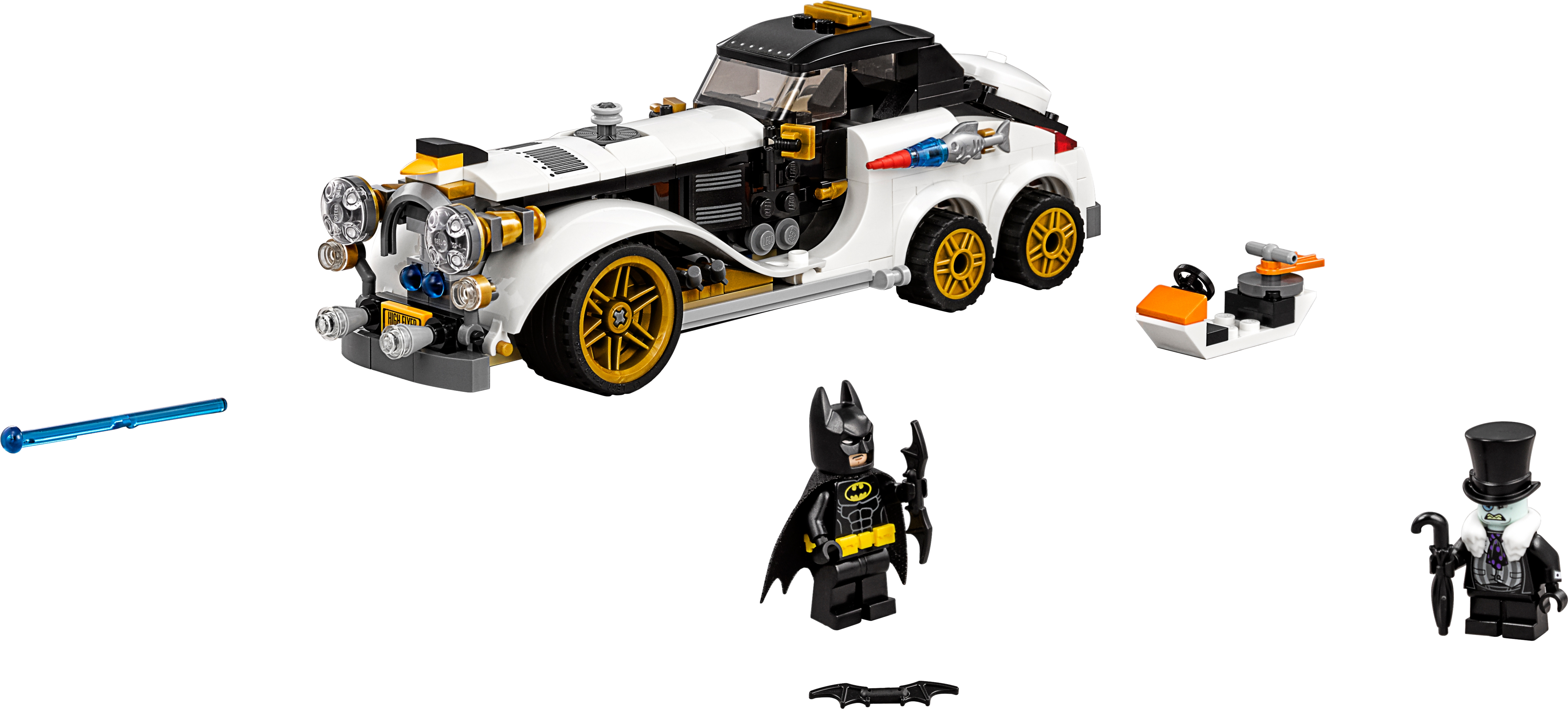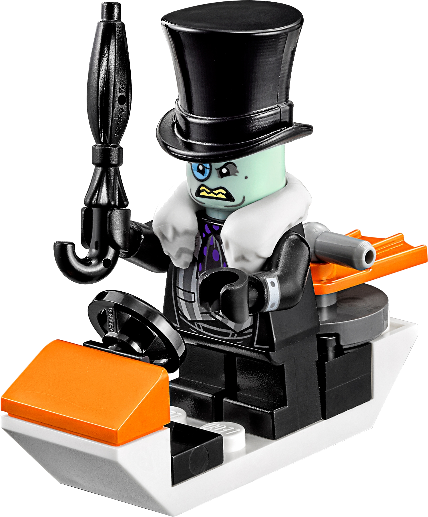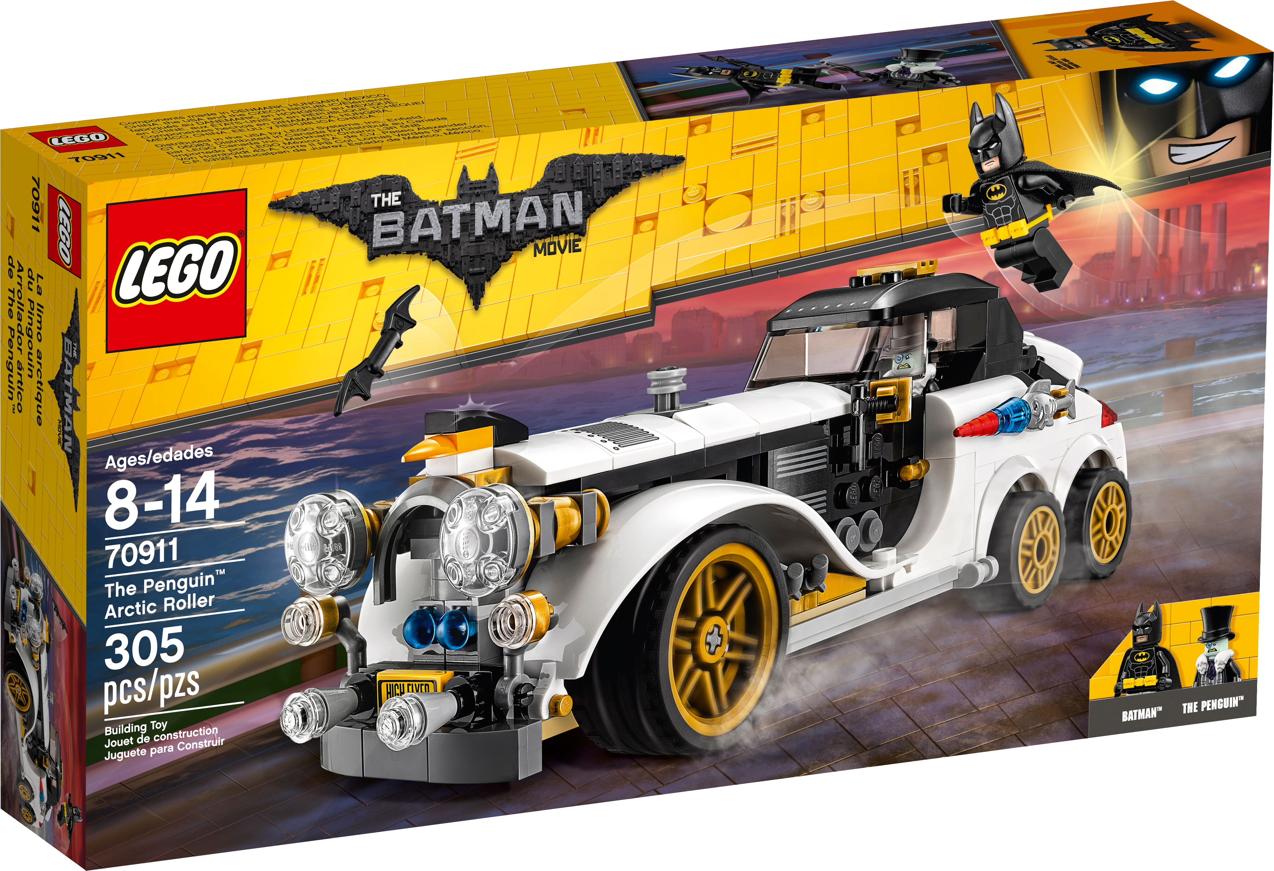 Join Batman’s pursuit of The Penguin in THE LEGO® BATMAN MOVIE: The Penguin™ Arctic Roller set. The Arctic Roller vehicle features a minifigure cockpit with removable roof, dual spring-loaded shooter and loads of quirky penguin details. Add an extra dimension to the chase by opening the trunk and placing The Penguin™ on his penguin mini escape pod. Includes two minifigures. Includes two minifigures: Batman™ and The Penguin™. The Arctic Roller features a minifigure cockpit with removable roof, six wheels with rubber tires and golden-colored trims, dual spring-loaded shooter, an opening trunk with penguin mini escape pod, fish missile details on either side of the car, penguin-head hood ornament and translucent headlight-style elements. Press the button on the hood to fire the spring-loaded shooters. The penguin mini escape pod has an open minifigure cockpit, steering wheel element and penguin details. Includes Batman’s Batarang. Accessory elements include Batman’s cape and new-for-spring-2017 molded utility belt, and the Penguin’s collar, top hat and umbrella. This set offers an age-appropriate build and play experience for ages 8+. Arctic Roller measures over 2” (7cm) high, 8” (22cm) long and 2” (7cm) wide.
