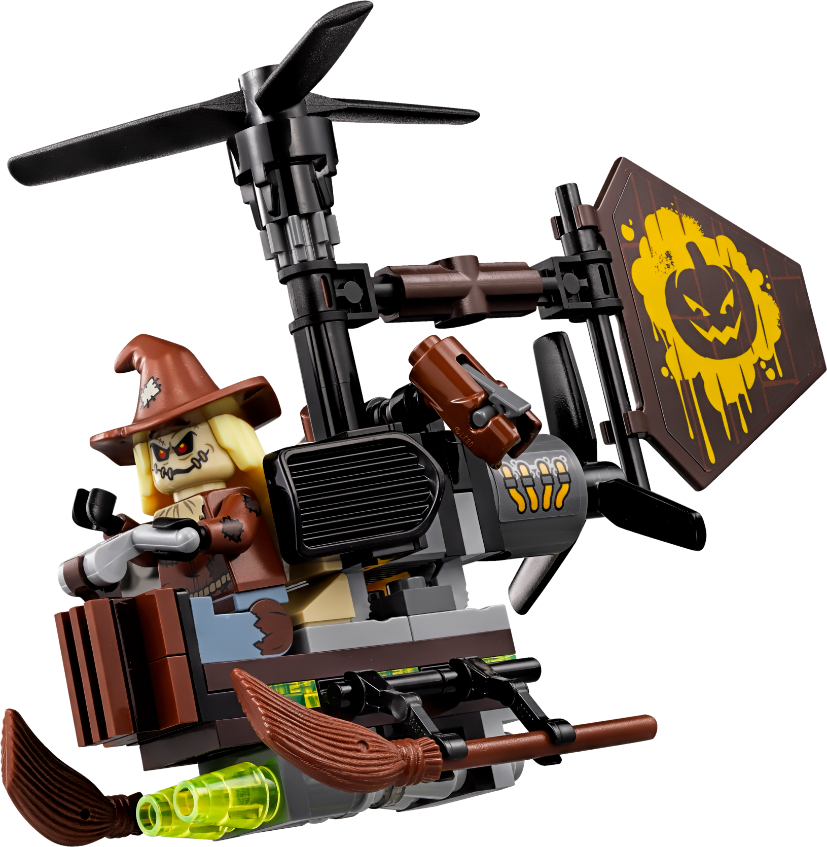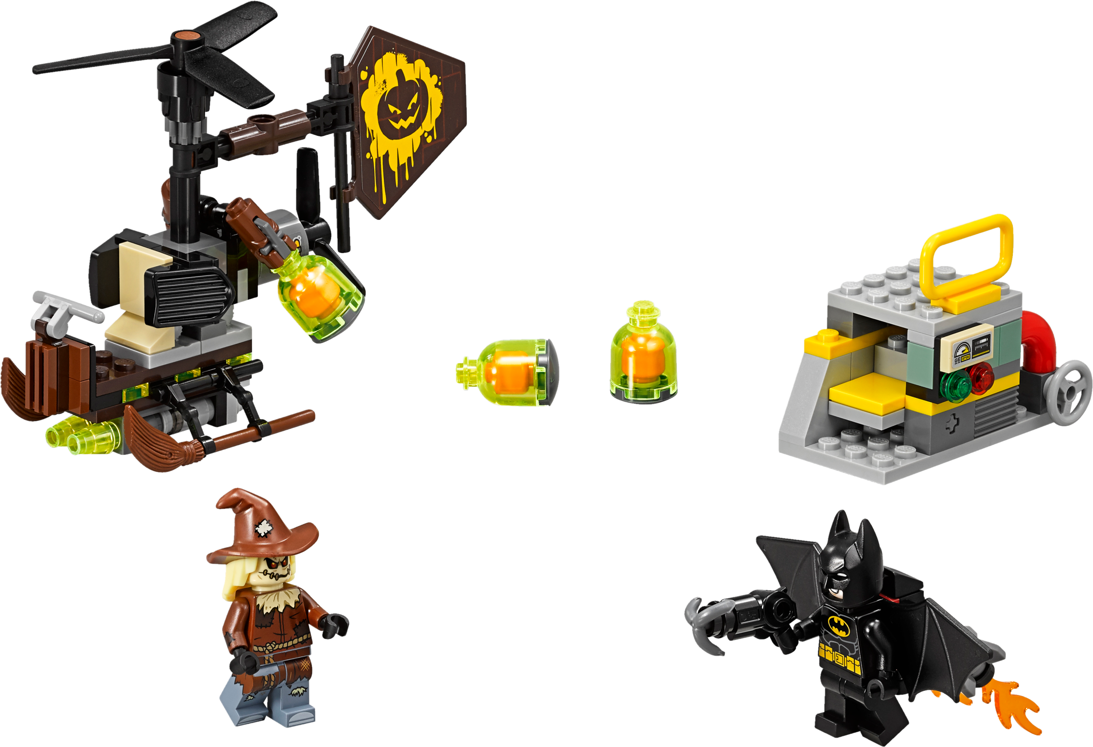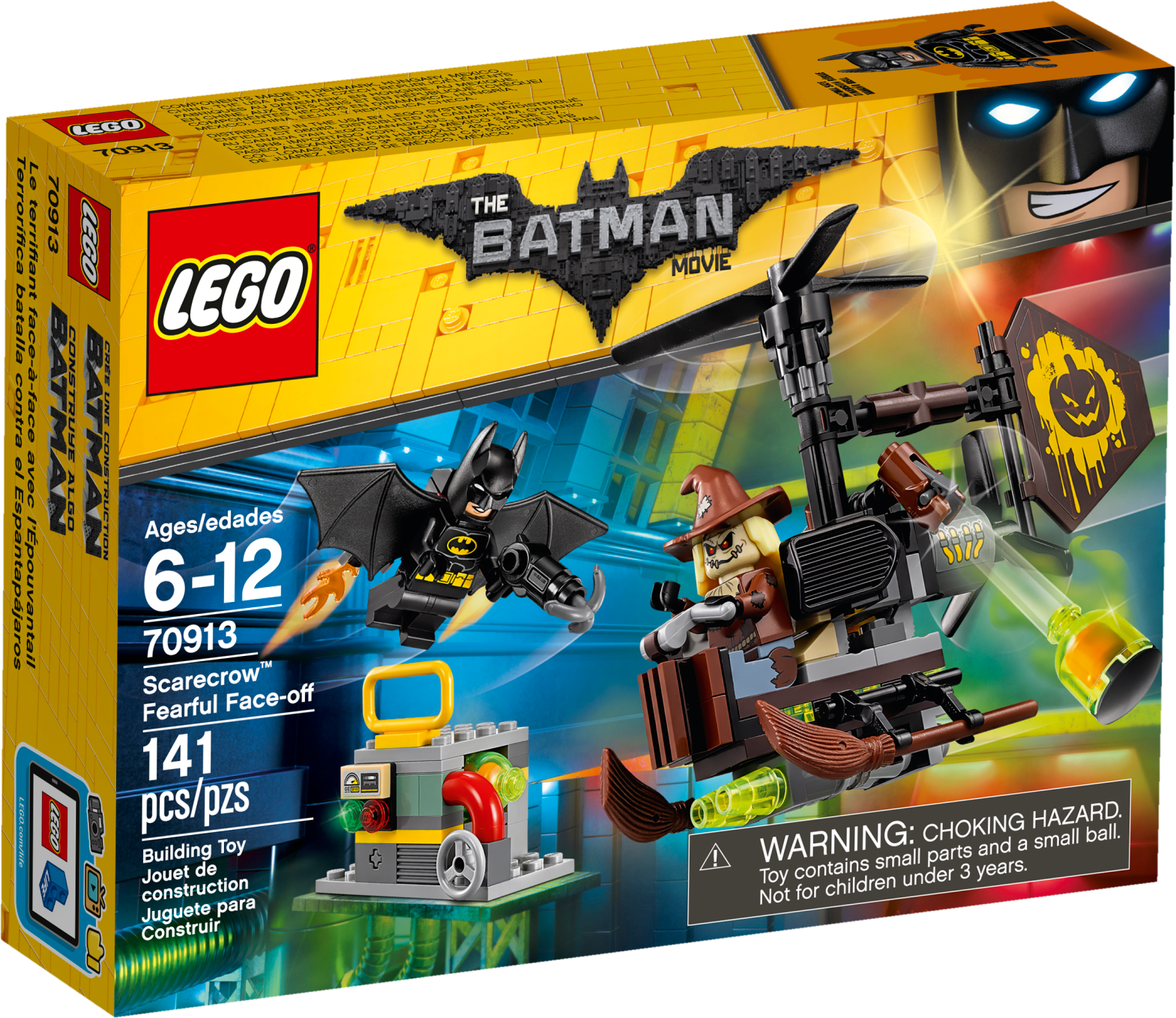 Team up with Batman™ to stop Scarecrow™ spreading fear in this action-packed THE LEGO® BATMAN MOVIE: Scarecrow™ Fearful Face-off set. The Gyro-Copter features 2 spinning rotors, an adjustable rudder and 2 bomb-drop functions to drop the included fear gas bomb elements. Attach Batman’s jetpack with Batwings and adjustable boosters, and arm him with the grappling gun to role-play an aerial battle. The set also features a power plant mini build with an explode function for added jeopardy, plus 2 minifigures. Includes two minifigures: Scarecrow™ and Batman™. Scarecrow’s Gyro-Copter features top and rear spinning rotors, an adjustable rudder, two bomb-drop functions and three translucent-green fear gas bomb elements. The power plant mini build has space for a fear gas bomb element and an explode function. Also includes Batman’s jetpack with Batwings and two adjustable boosters with translucent flame elements. Includes Batman’s grappling gun. Gyro-Copter measures over 3” (9cm) high, 5” (13cm) long and 1” (5cm) wide. Power plant mini build measures over 1” (5cm) high, 2” (6cm) wide and 1” (3cm) deep.