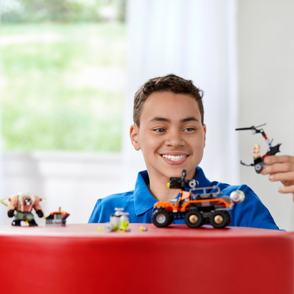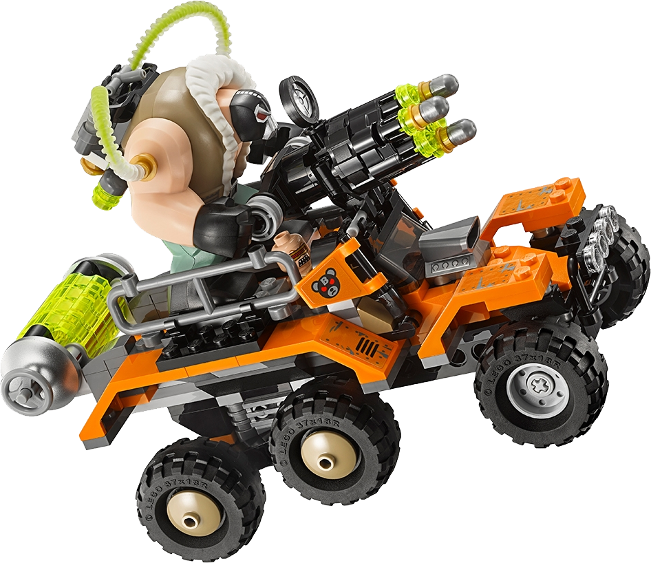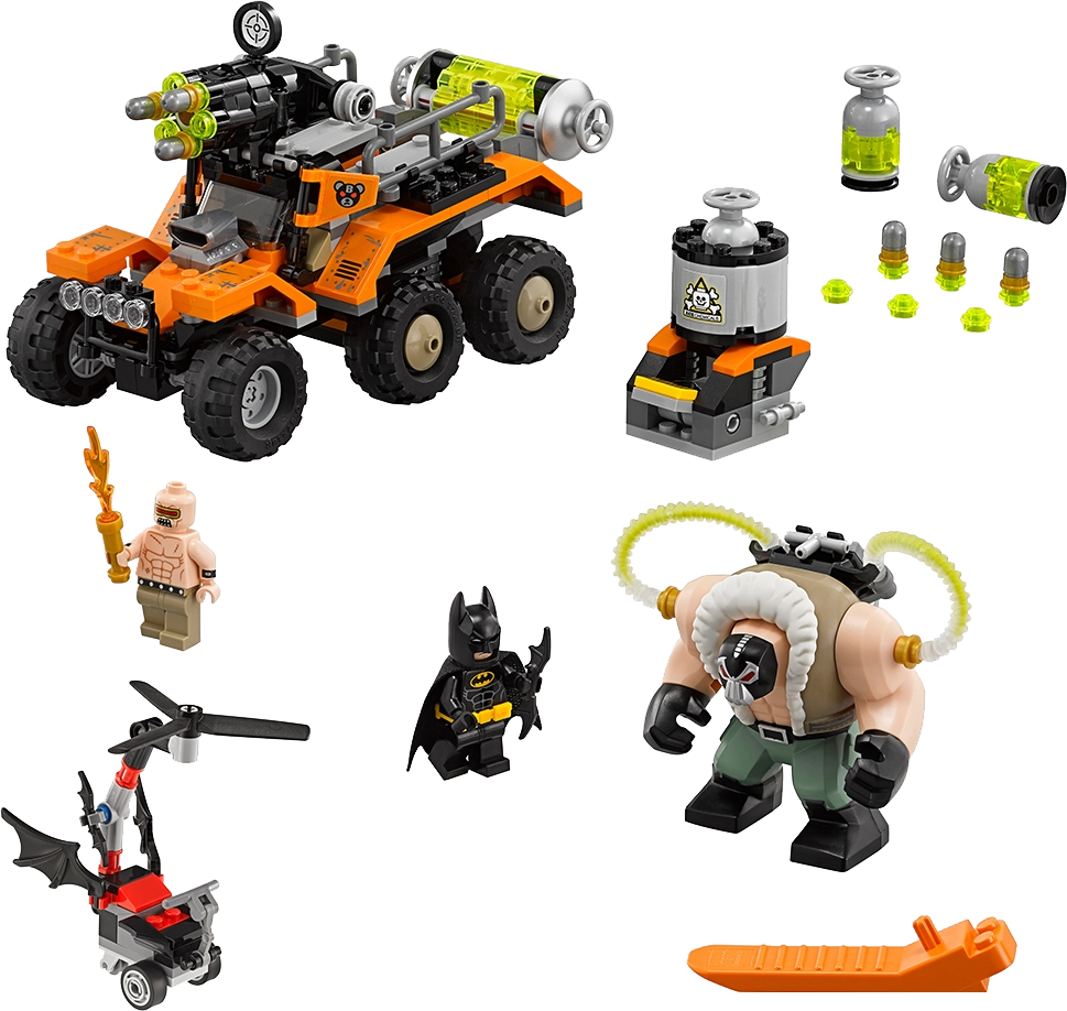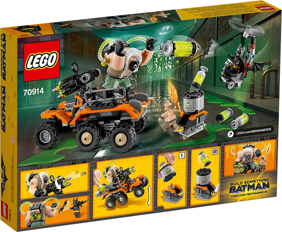 Stop Bane™ and Mutant Leader’s toxic attacks with Batman™ in this exciting THE LEGO® BATMAN MOVIE: Bane™ Toxic Truck Attack set, including Bane’s Toxic Truck, Batman’s Whirly-Bat flyer and a toxic waste mini-build with explode function. The 6-wheel truck features rear 4-wheel suspension and a mounted 6-stud rapid shooter and detachable toxic tank element. Includes 2 minifigures, a big figure and assorted play-inspiring weapons and accessory elements including Batman’s Batarang, Mutant Leader’s torch and Bane’s Venom backpack. Includes two minifigures: Batman™ and Mutant Leader™, plus a Bane™ big figure. Bane’s 6x6 Toxic Truck features a minifigure cockpit, space for Bane™, six big wheels with rear-four-wheel suspension, mounted adjustable six-stud rapid shooter with target-sighting element, and a detachable translucent-green toxic tank element. Batman’s Whirly-Bat features a minifigure seat, rotating rotor, two adjustable Batwings and two wheels. Also includes a toxic waste mini-build with a silo, three toxic bomb elements and explode function. The Bane™ big figure features posable arms and legs, and has a Venom backpack. Weapons include Batman’s Batarang and Mutant Leader’s torch. Accessory elements include Batman’s cape and molded utility belt. Bane™ stands over 2” (7cm) tall. Toxic Truck measures over 4” (11cm) high, 6” (17cm) long and 3” (9cm) wide. Whirly-Bat measures over 3” (9cm) high, 2” (6cm) long and 1” (4cm) wide. Toxic waste mini-build measures over 2” (6cm) high, 1” (4cm) wide and 1” (4cm) deep.