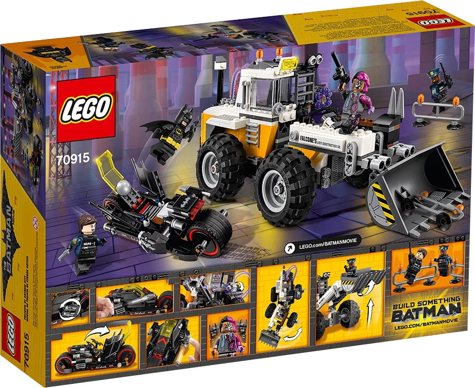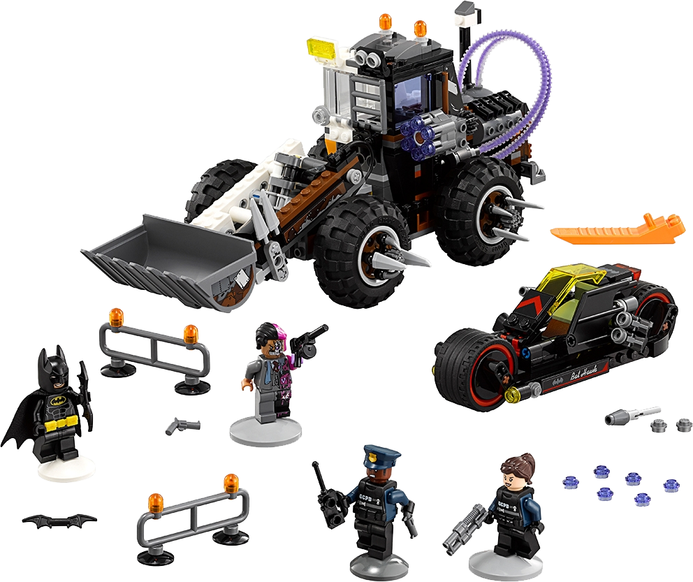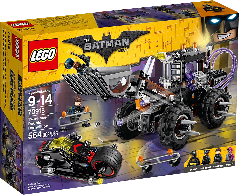Stop the mighty Two-Face™ Excavator with Batman’s Batcycle in this thrilling THE LEGO® BATMAN MOVIE: Two-Face™ Double Demolition set. The Two-Face Excavator has a minifigure cabin, operational excavator arm and bucket, articulated design for smooth steering. It might look like a normal digger from one side, but check out the ‘bad side’ featuring spikes on the huge wheels and a 6-stud rapid shooter. The Batcycle features an opening minifigure cockpit, rotating double stud shooter and rotating flick missile shooter. The set includes 4 minifigures who are equipped with assorted weapons and accessories to inspire endless action-packed role-play scenarios. Includes four minifigures: Batman™, Two-Face™ and two GCPD officers. Two-Face™ Excavator features a ‘good-and-bad-side’ design, minifigure cabin, removable roof and opening weapon storage compartment with a pistol, four huge wheels (two with spikes on the ‘bad’ side), operational excavator arm and bucket, articulated design for smooth steering, six–stud rapid shooter, rotor blade and rear storage compartment. Batcycle has two big wheels, an opening minifigure cockpit with translucent-yellow windshield and Batwing doors, rotating double stud shooter and rotating flick missile shooter. Also includes two road barrier elements. Scoop up minifigures—and even the Batcycle—with the excavator! Weapons include Batman’s two Batarangs, Two-Face’s tommy gun and the GCPD officers’ shotgun and pistol. Accessory elements include Batman’s cape and molded utility belt and the GCPD officers’ two protective vests, police hat and walkie-talkie. Two-Face™ Excavator measures over 4” (12cm) high, 11” (29cm) long and 5” (15cm) wide. Batcycle measures over 1” (5cm) high, 5” (14cm) long and 2” (7cm) wide. Road barriers each measure over 1” (3cm) high, 1” (5cm) wide and under 1” (2cm) deep.