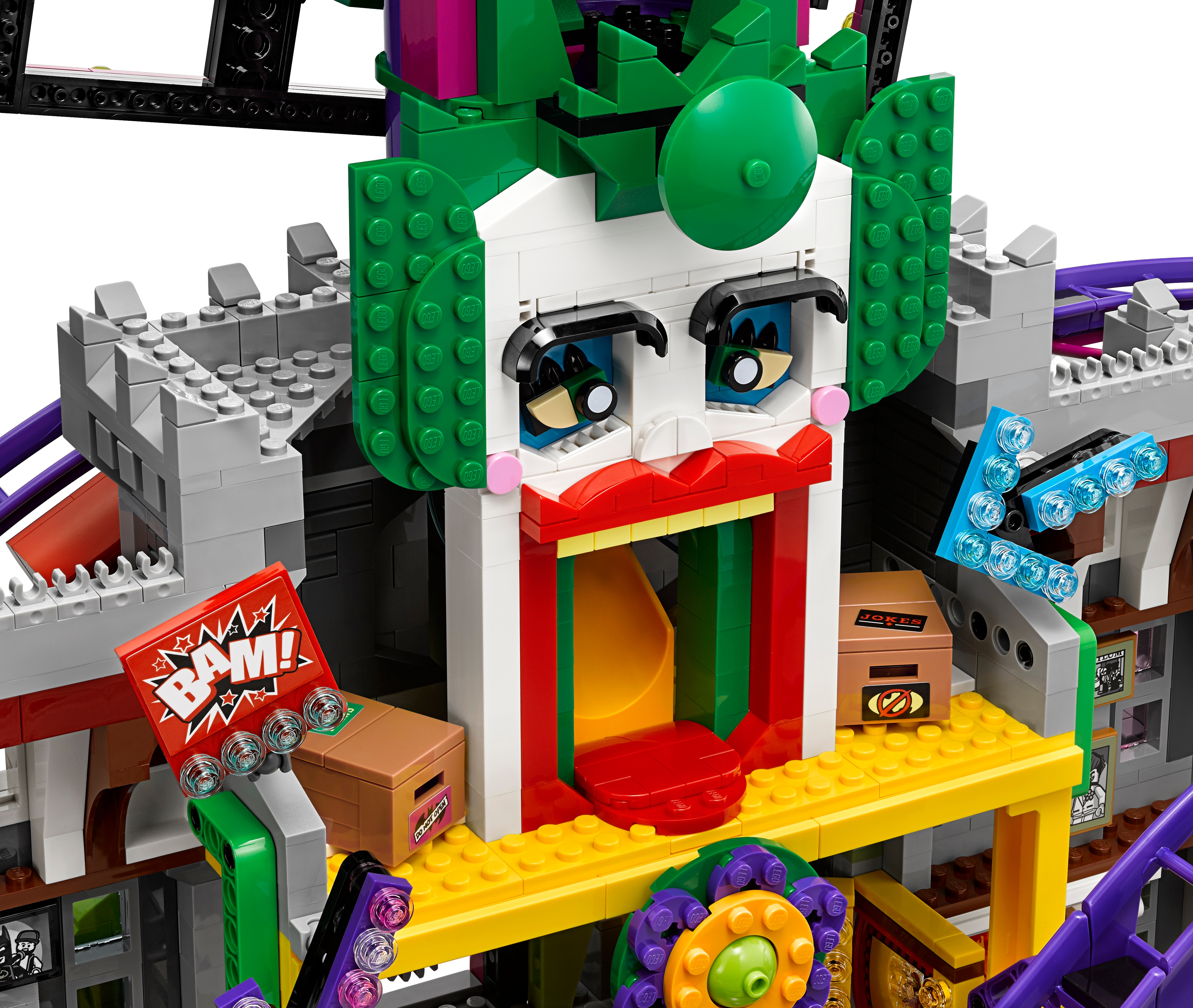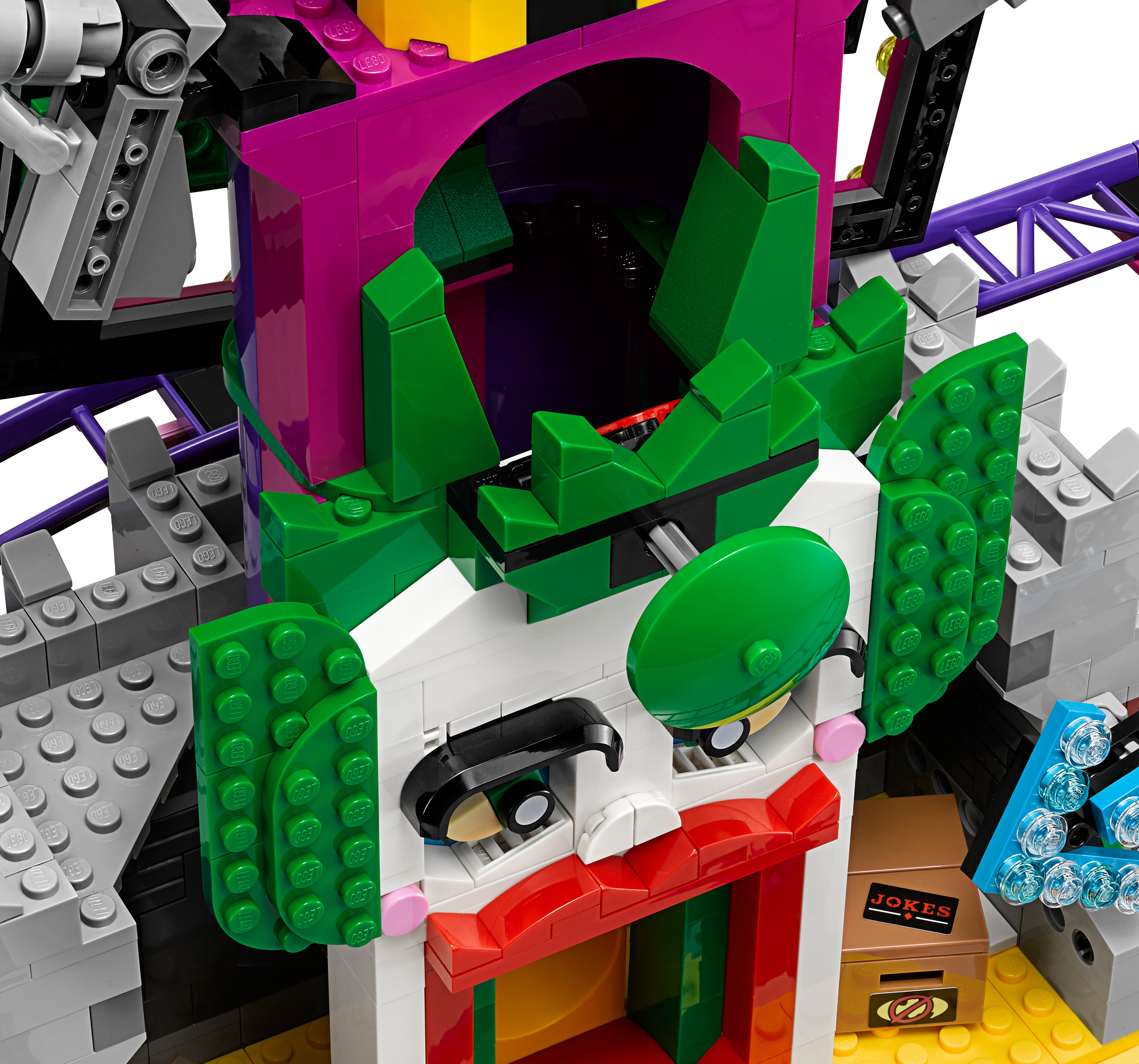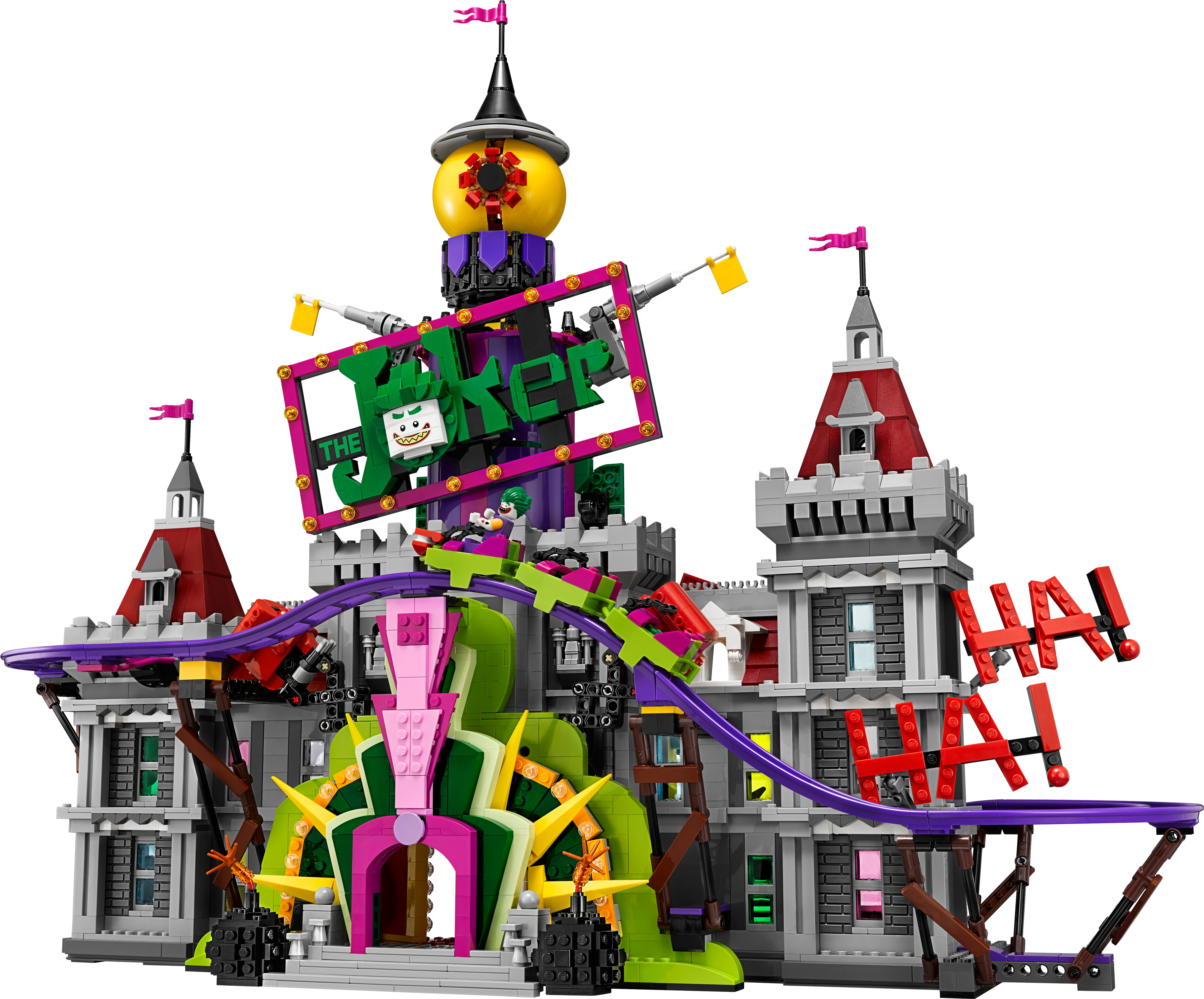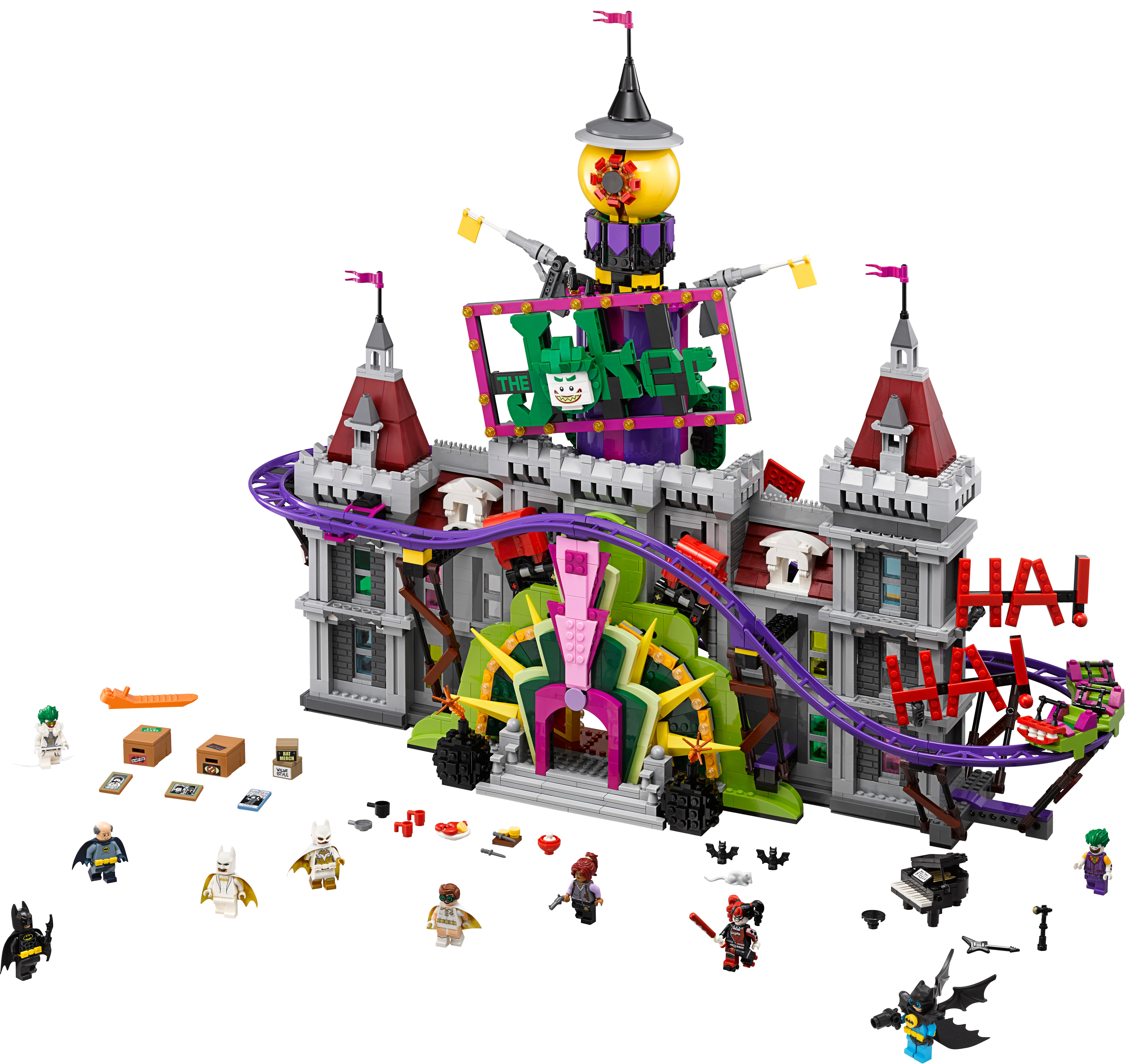 Help Batman™, Barbara Gordon, Alfred Pennyworth™ (in his classic Batsuit) and Nightwing™ regain control of the jokerized Wayne Manor with this massive THE LEGO® BATMAN MOVIE set. The Joker™ Manor is packed with iconic details from the movie and cool functions, including a rollercoaster encircling the whole building, a huge buildable The Joker head with trapdoor and slide, punching boxing gloves, a rocking ‘The Joker’ sign and rotating ‘big eye’ tower. The interior includes a cinema room with a romantic DVD element, kitchen with buildable microwave plus lobster and lemon-slice decorated tile elements, living room with a buildable grand piano, fireplace and bust, swimming pool room, and a music studio with guitar element and buildable mixing desk and loudspeakers. Build this magnificent manor and then recreate your favorite scenes from the movie with 10 included minifigures. Includes 10 minifigures: The Joker™, Batman™, Barbara Gordon, Harley Quinn™, Nightwing™, Alfred Pennyworth™ Classic Batsuit, Disco Batman™, Disco The Joker™, Disco Batgirl™ and Disco Robin™. Features a grand entrance flanked by 2 buildable bombs with translucent spark-style elements, 2-level and 3-level towers with turrets and flag elements on top, a rollercoaster track and train with 3 cars (each with a minifigure seat), rotating ‘big eye’ tower with lever-operated iris to ‘look’ up and down, huge buildable The Joker™ head with trapdoor and slide, rocking ‘The Joker’ sign, ‘Ha! Ha!’ sign, 2 wheel-operated punching boxing gloves, plus many multicolored, translucent light-style decorative elements. Activate the trapdoor to send a minifigure tumbling from the top of the The Joker™ head, down the slide and out through the mouth. Interior includes an entrance hall with 4 plastic, bendy ‘mirror’ elements; living room with a buildable grand piano and stool, bust, and fireplace with translucent-red fire-style elements; cinema room with a screen, minifigure seat and assorted elements including a romantic DVD; kitchen with cup, pot and pan elements, and a buildable microwave with lobster, lemon and plate elements inside; music studio with a buildable mixing desk and loudspeakers, seat and a guitar element; swimming pool room with translucent-blue water-style elements; and an attic with 2 buildable boxes and a rat figure. Weapons include Batman’s Batarang, Barbara Gordon’s revolver and Harley Quinn’s bat. Disco Batman™, Disco The Joker™, Disco Batgirl™ and Disco Robin™ minifigures are new for January 2018. This set includes over 3,435 pieces. Recreate and reimagine memorable scenes from THE LEGO® BATMAN MOVIE. The Joker™ Manor measures over 21” (55cm) high, 25” (66cm) wide and 10” (27cm) deep. Rollercoaster train measures over 1” (3cm) high, 5” (15cm) long and 1” (3cm) wide.