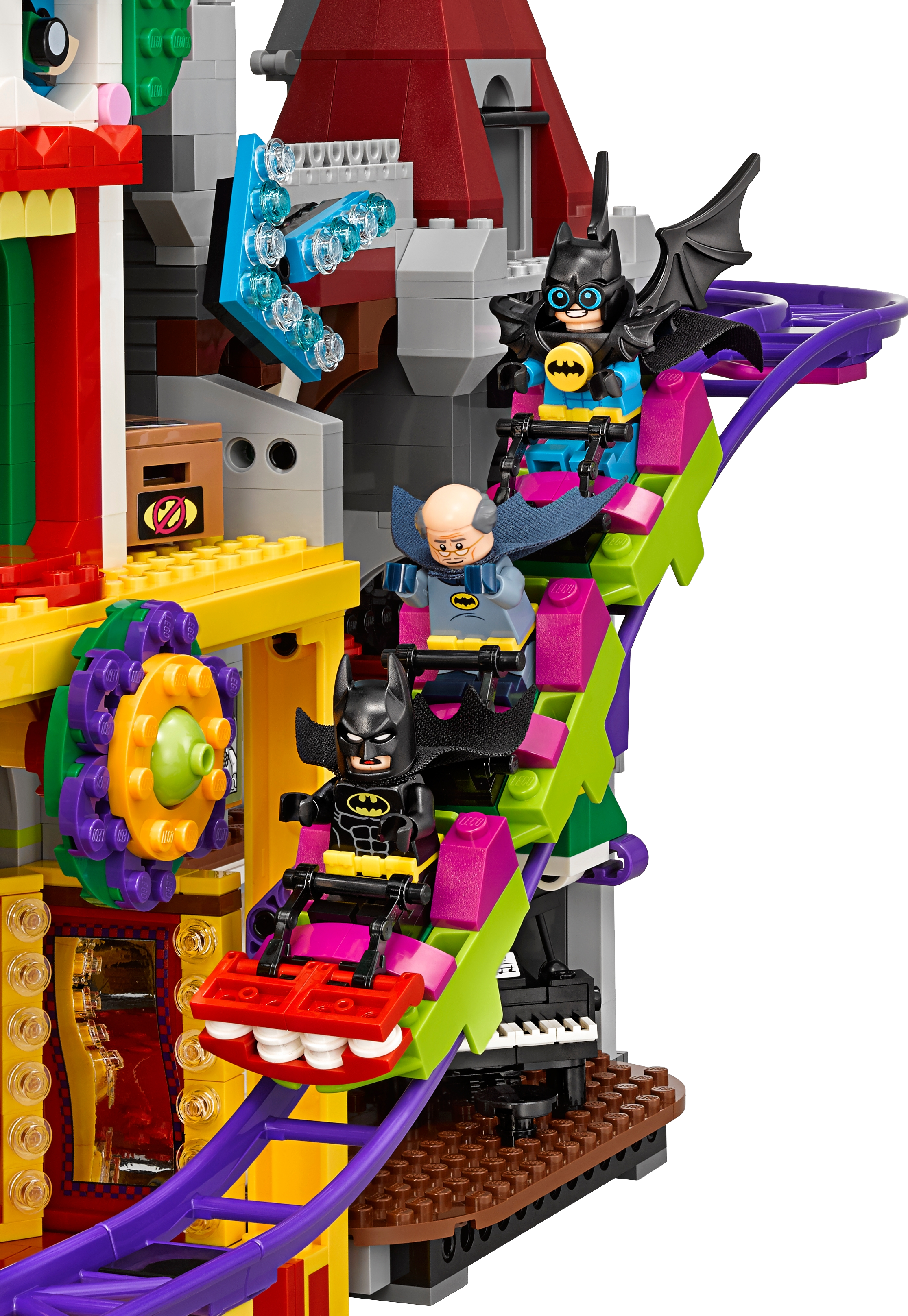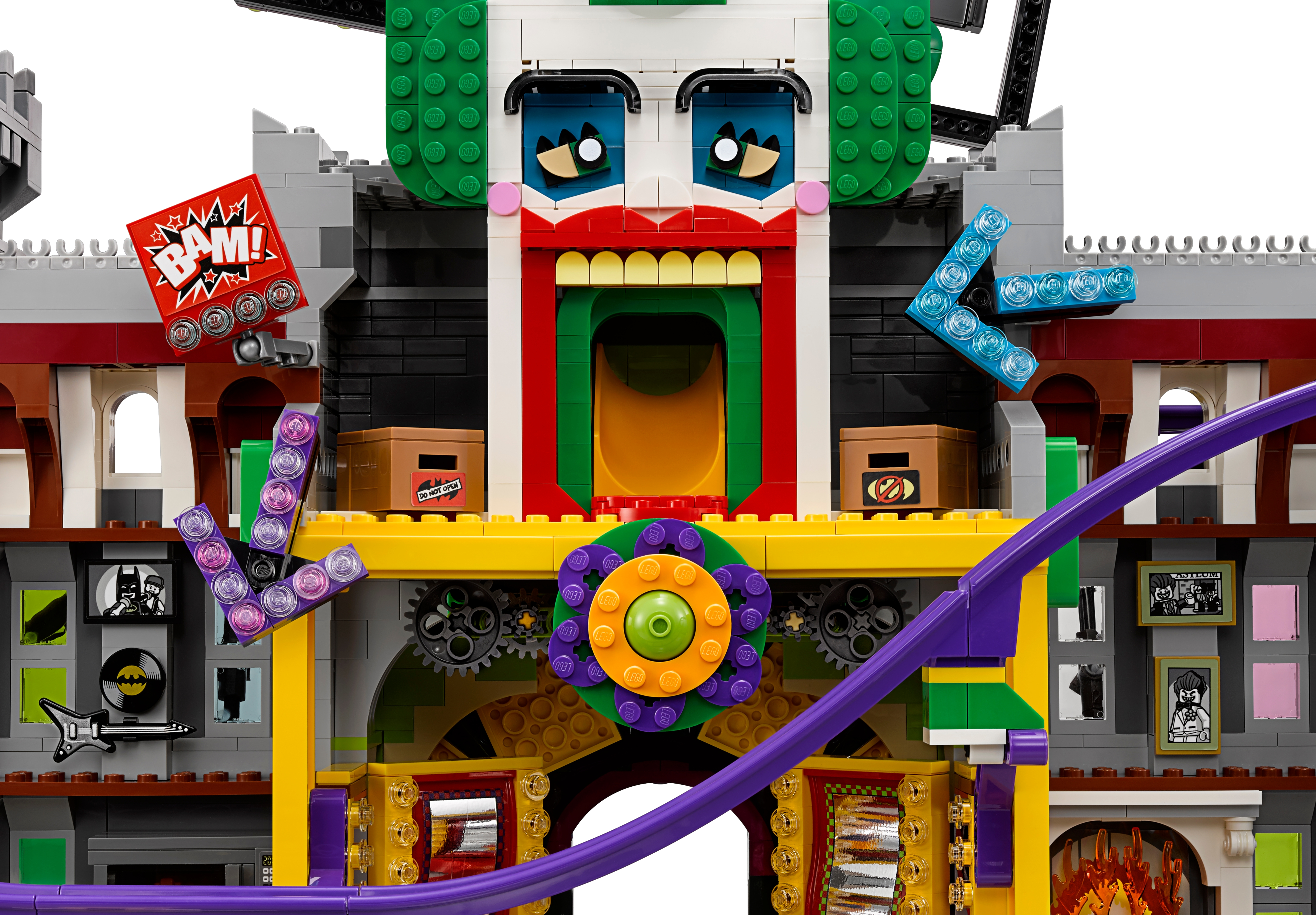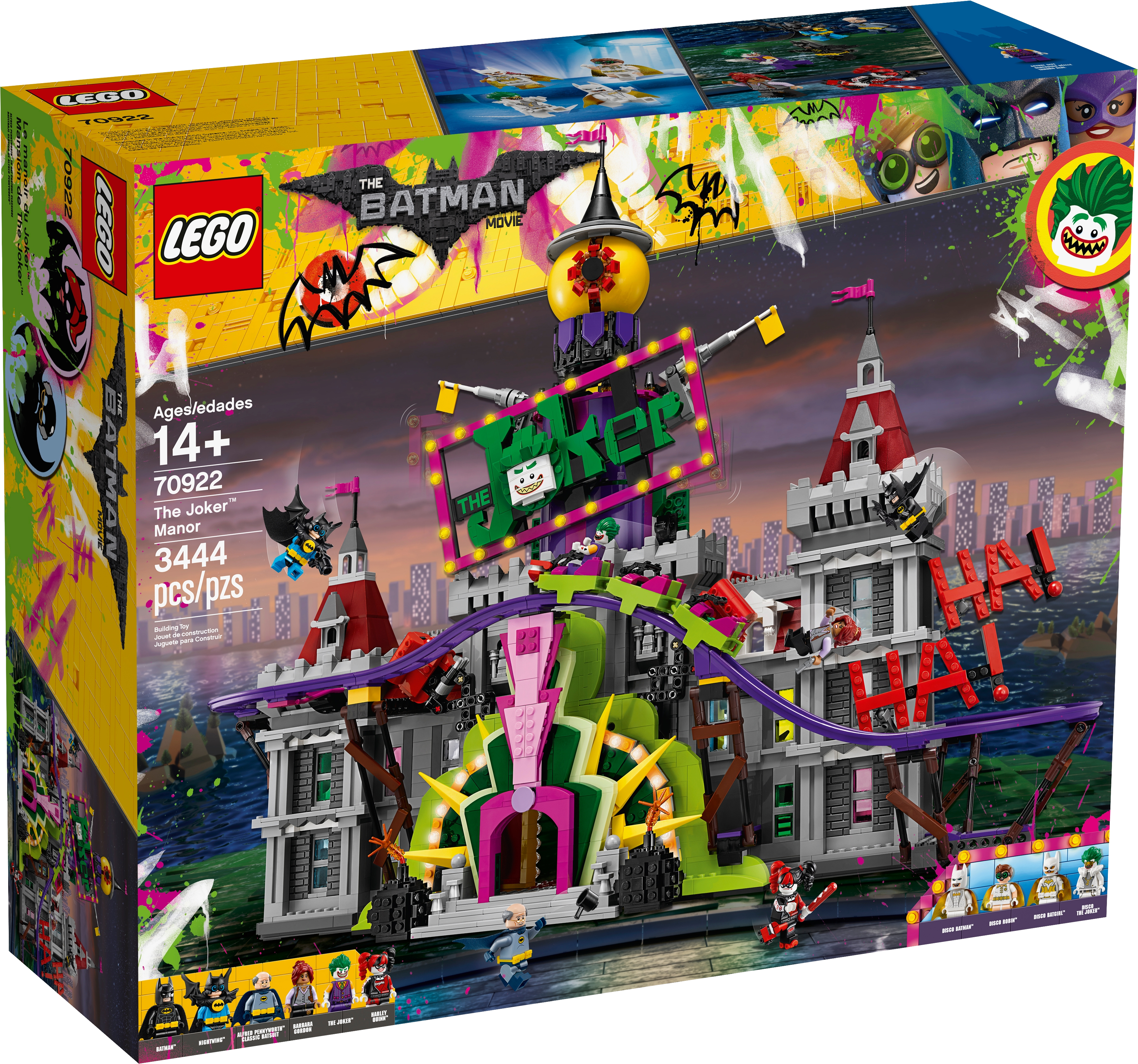 Help Batman™, Barbara Gordon, Alfred Pennyworth™ (in his classic Batsuit) and Nightwing™ regain control of the jokerized Wayne Manor with this massive THE LEGO® BATMAN MOVIE set. The Joker™ Manor is packed with iconic details from the movie and cool functions, including a rollercoaster encircling the whole building, a huge buildable The Joker head with trapdoor and slide, punching boxing gloves, a rocking ‘The Joker’ sign and rotating ‘big eye’ tower. The interior includes a cinema room with a romantic DVD element, kitchen with buildable microwave plus lobster and lemon-slice decorated tile elements, living room with a buildable grand piano, fireplace and bust, swimming pool room, and a music studio with guitar element and buildable mixing desk and loudspeakers. Build this magnificent manor and then recreate your favorite scenes from the movie with 10 included minifigures. Includes 10 minifigures: The Joker™, Batman™, Barbara Gordon, Harley Quinn™, Nightwing™, Alfred Pennyworth™ Classic Batsuit, Disco Batman™, Disco The Joker™, Disco Batgirl™ and Disco Robin™. Features a grand entrance flanked by 2 buildable bombs with translucent spark-style elements, 2-level and 3-level towers with turrets and flag elements on top, a rollercoaster track and train with 3 cars (each with a minifigure seat), rotating ‘big eye’ tower with lever-operated iris to ‘look’ up and down, huge buildable The Joker™ head with trapdoor and slide, rocking ‘The Joker’ sign, ‘Ha! Ha!’ sign, 2 wheel-operated punching boxing gloves, plus many multicolored, translucent light-style decorative elements. Activate the trapdoor to send a minifigure tumbling from the top of the The Joker™ head, down the slide and out through the mouth. Interior includes an entrance hall with 4 plastic, bendy ‘mirror’ elements; living room with a buildable grand piano and stool, bust, and fireplace with translucent-red fire-style elements; cinema room with a screen, minifigure seat and assorted elements including a romantic DVD; kitchen with cup, pot and pan elements, and a buildable microwave with lobster, lemon and plate elements inside; music studio with a buildable mixing desk and loudspeakers, seat and a guitar element; swimming pool room with translucent-blue water-style elements; and an attic with 2 buildable boxes and a rat figure. Weapons include Batman’s Batarang, Barbara Gordon’s revolver and Harley Quinn’s bat. Disco Batman™, Disco The Joker™, Disco Batgirl™ and Disco Robin™ minifigures are new for January 2018. This set includes over 3,435 pieces. Recreate and reimagine memorable scenes from THE LEGO® BATMAN MOVIE. The Joker™ Manor measures over 21” (55cm) high, 25” (66cm) wide and 10” (27cm) deep. Rollercoaster train measures over 1” (3cm) high, 5” (15cm) long and 1” (3cm) wide.