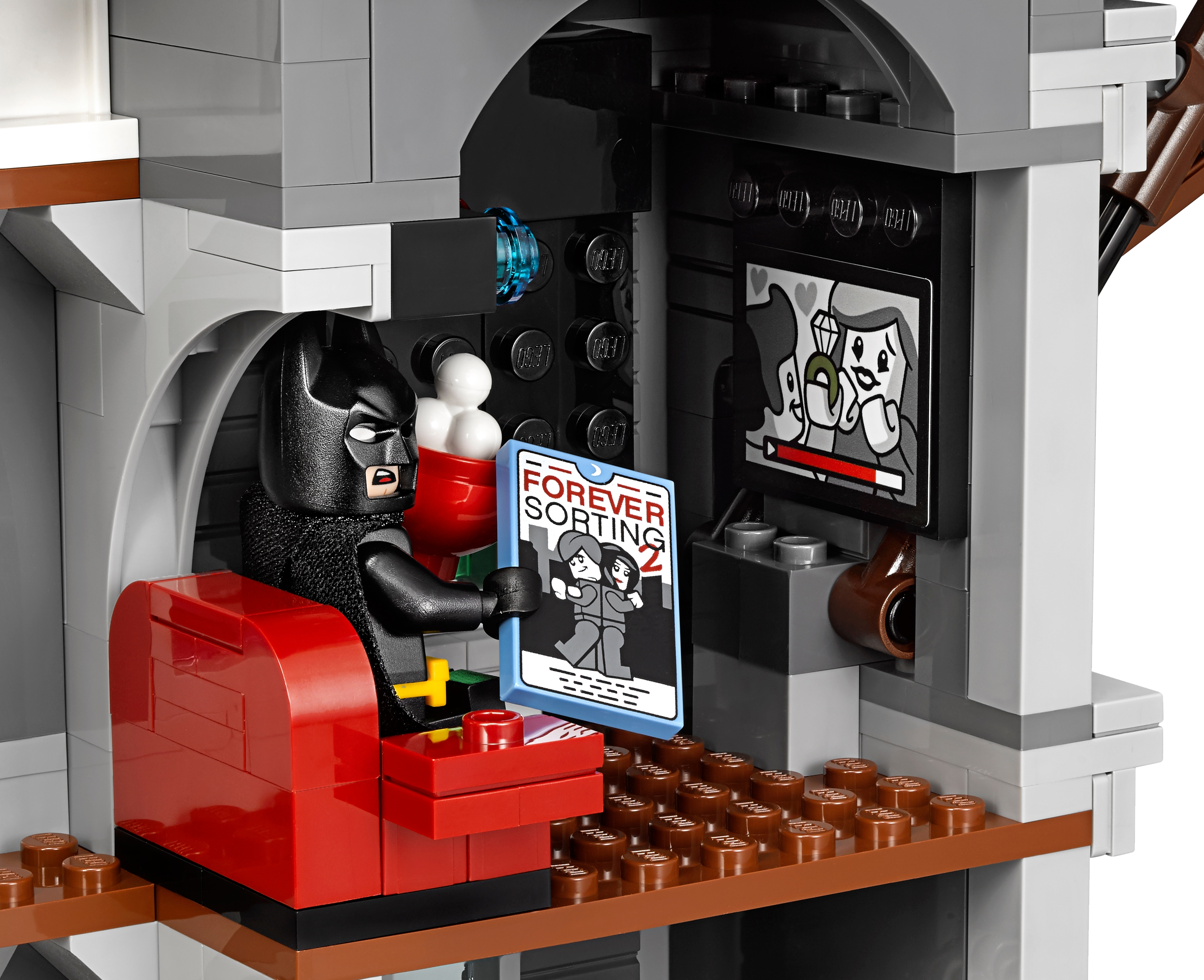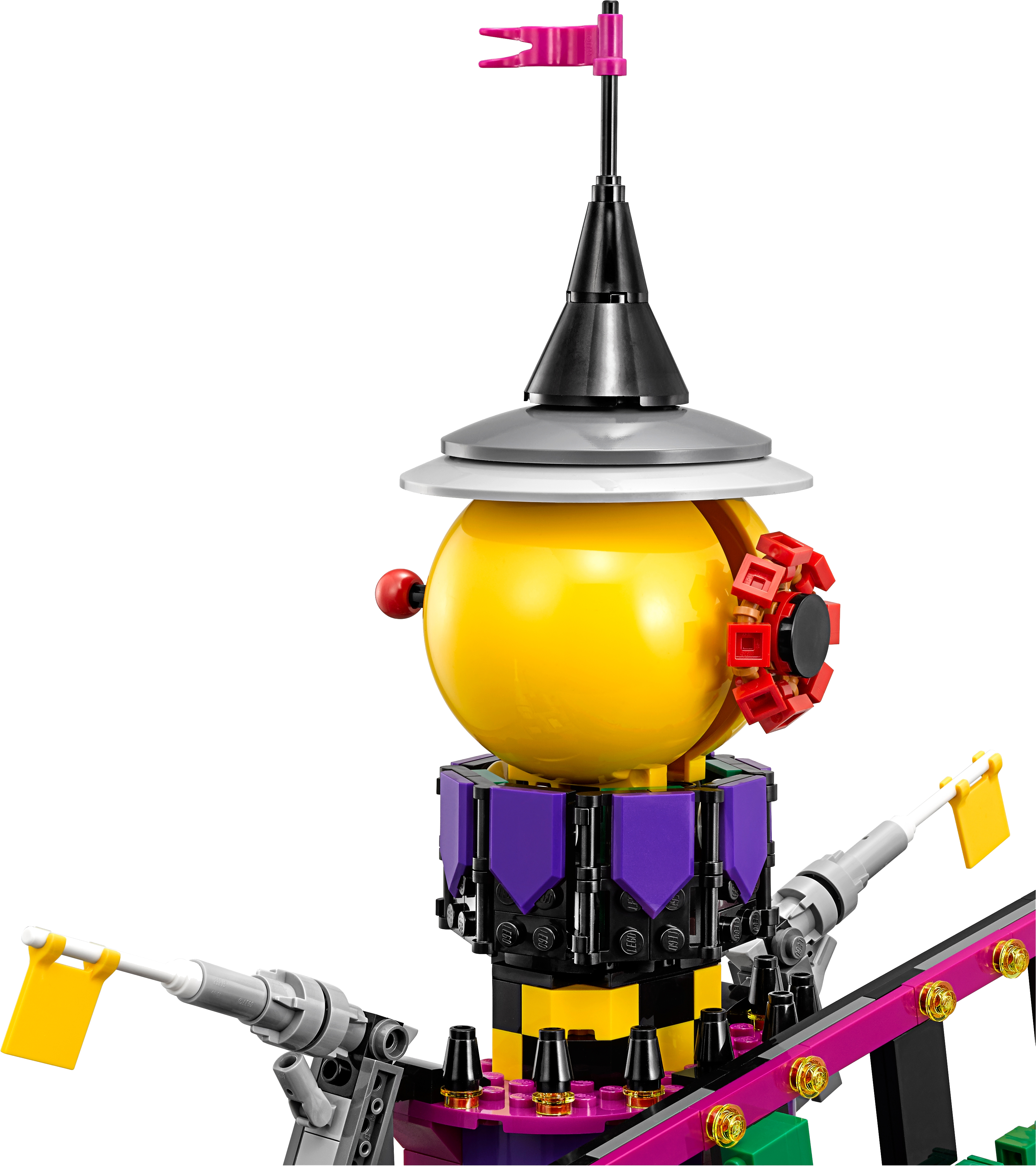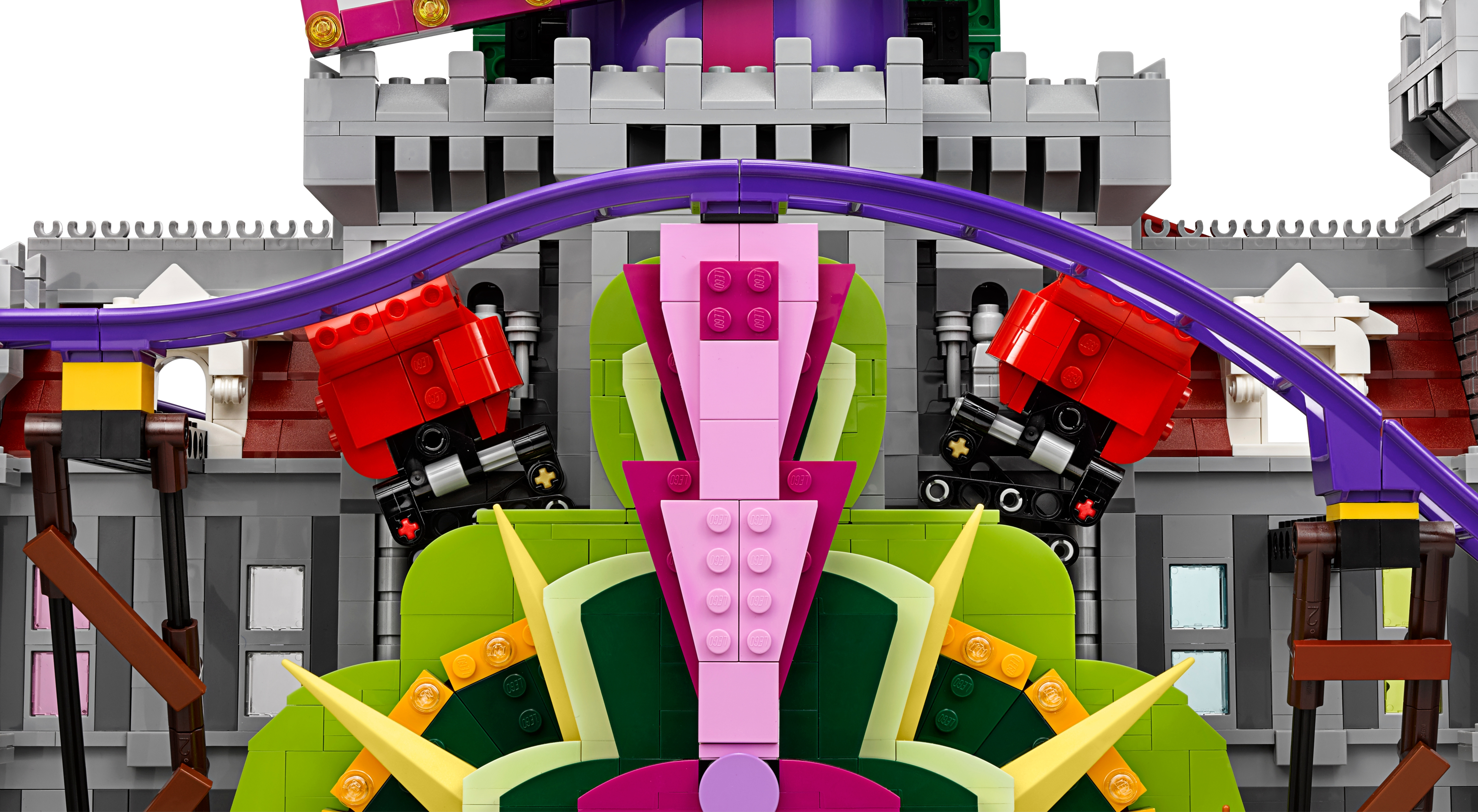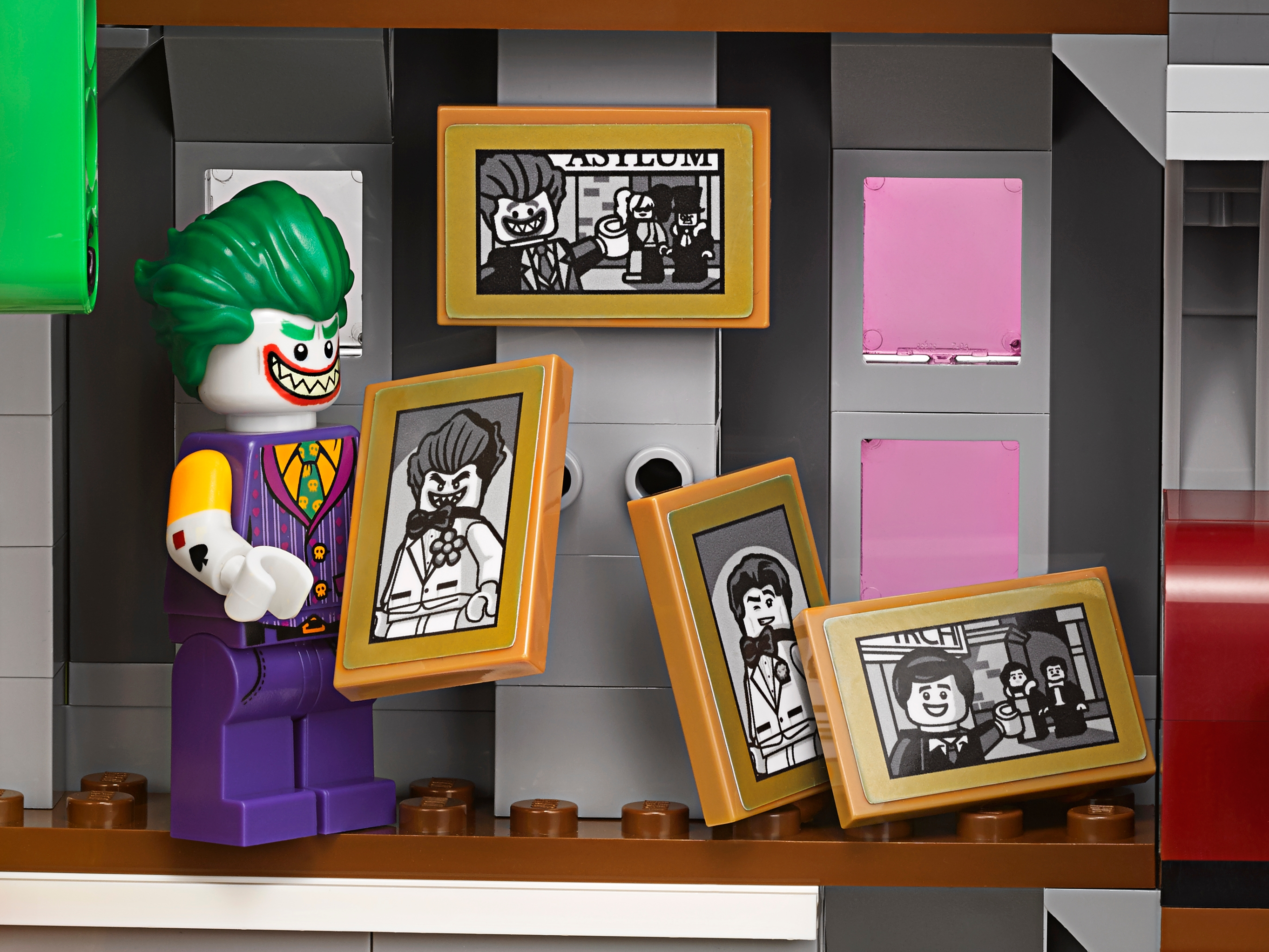 Help Batman™, Barbara Gordon, Alfred Pennyworth™ (in his classic Batsuit) and Nightwing™ regain control of the jokerized Wayne Manor with this massive THE LEGO® BATMAN MOVIE set. The Joker™ Manor is packed with iconic details from the movie and cool functions, including a rollercoaster encircling the whole building, a huge buildable The Joker head with trapdoor and slide, punching boxing gloves, a rocking ‘The Joker’ sign and rotating ‘big eye’ tower. The interior includes a cinema room with a romantic DVD element, kitchen with buildable microwave plus lobster and lemon-slice decorated tile elements, living room with a buildable grand piano, fireplace and bust, swimming pool room, and a music studio with guitar element and buildable mixing desk and loudspeakers. Build this magnificent manor and then recreate your favorite scenes from the movie with 10 included minifigures. Includes 10 minifigures: The Joker™, Batman™, Barbara Gordon, Harley Quinn™, Nightwing™, Alfred Pennyworth™ Classic Batsuit, Disco Batman™, Disco The Joker™, Disco Batgirl™ and Disco Robin™. Features a grand entrance flanked by 2 buildable bombs with translucent spark-style elements, 2-level and 3-level towers with turrets and flag elements on top, a rollercoaster track and train with 3 cars (each with a minifigure seat), rotating ‘big eye’ tower with lever-operated iris to ‘look’ up and down, huge buildable The Joker™ head with trapdoor and slide, rocking ‘The Joker’ sign, ‘Ha! Ha!’ sign, 2 wheel-operated punching boxing gloves, plus many multicolored, translucent light-style decorative elements. Activate the trapdoor to send a minifigure tumbling from the top of the The Joker™ head, down the slide and out through the mouth. Interior includes an entrance hall with 4 plastic, bendy ‘mirror’ elements; living room with a buildable grand piano and stool, bust, and fireplace with translucent-red fire-style elements; cinema room with a screen, minifigure seat and assorted elements including a romantic DVD; kitchen with cup, pot and pan elements, and a buildable microwave with lobster, lemon and plate elements inside; music studio with a buildable mixing desk and loudspeakers, seat and a guitar element; swimming pool room with translucent-blue water-style elements; and an attic with 2 buildable boxes and a rat figure. Weapons include Batman’s Batarang, Barbara Gordon’s revolver and Harley Quinn’s bat. Disco Batman™, Disco The Joker™, Disco Batgirl™ and Disco Robin™ minifigures are new for January 2018. This set includes over 3,435 pieces. Recreate and reimagine memorable scenes from THE LEGO® BATMAN MOVIE. The Joker™ Manor measures over 21” (55cm) high, 25” (66cm) wide and 10” (27cm) deep. Rollercoaster train measures over 1” (3cm) high, 5” (15cm) long and 1” (3cm) wide.