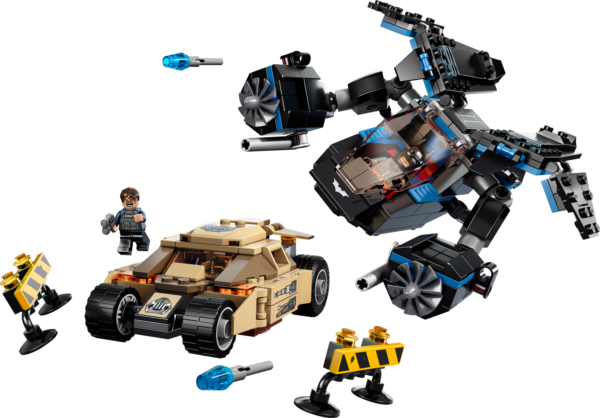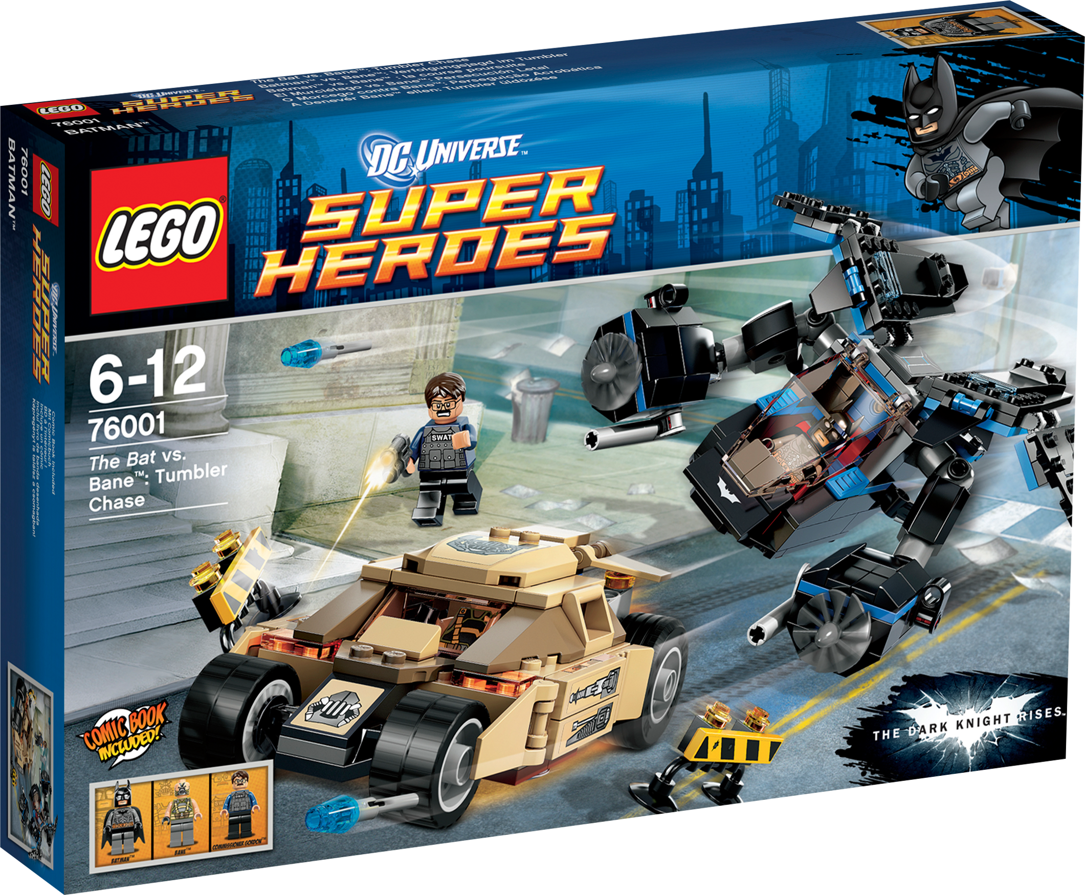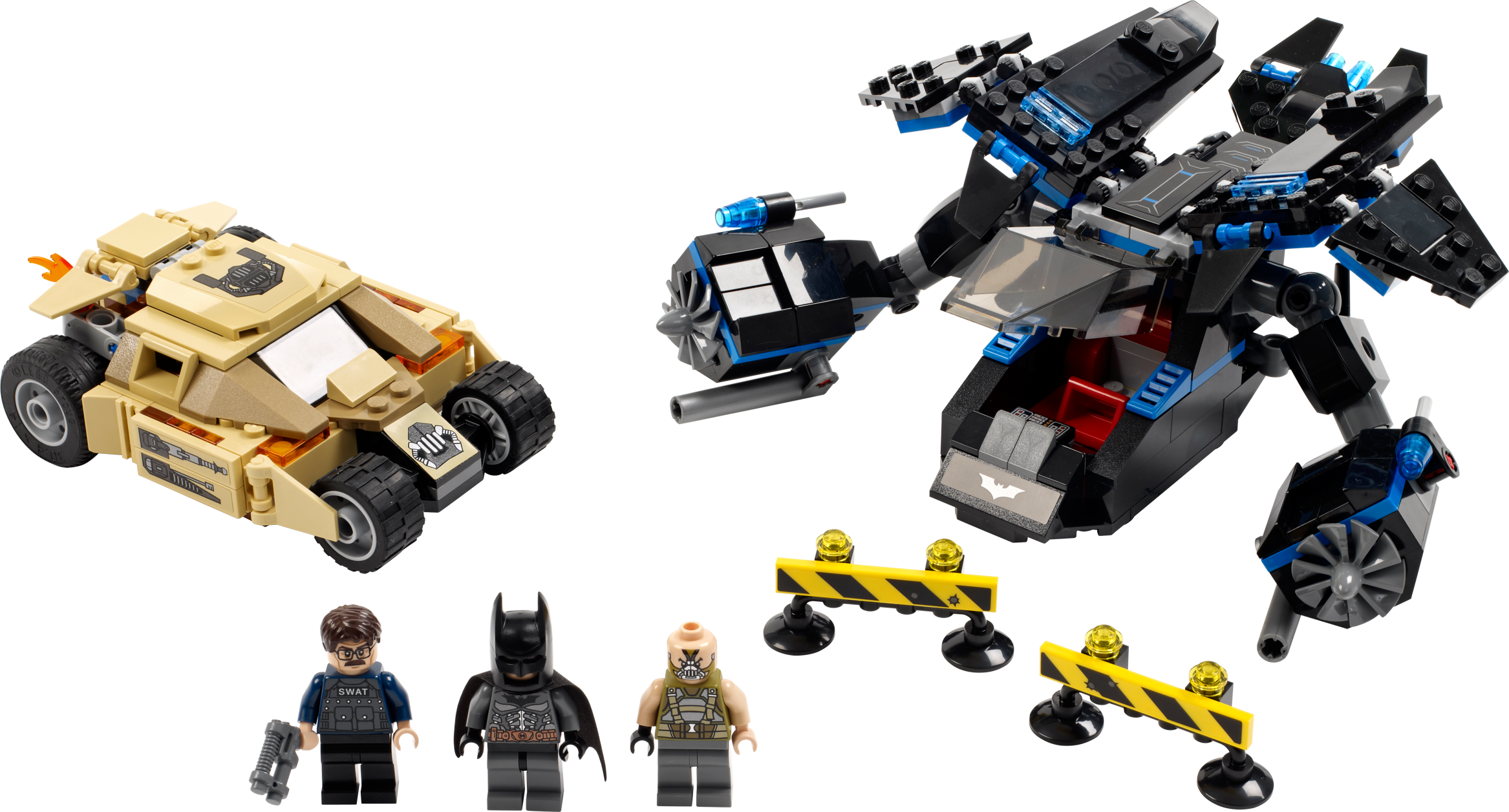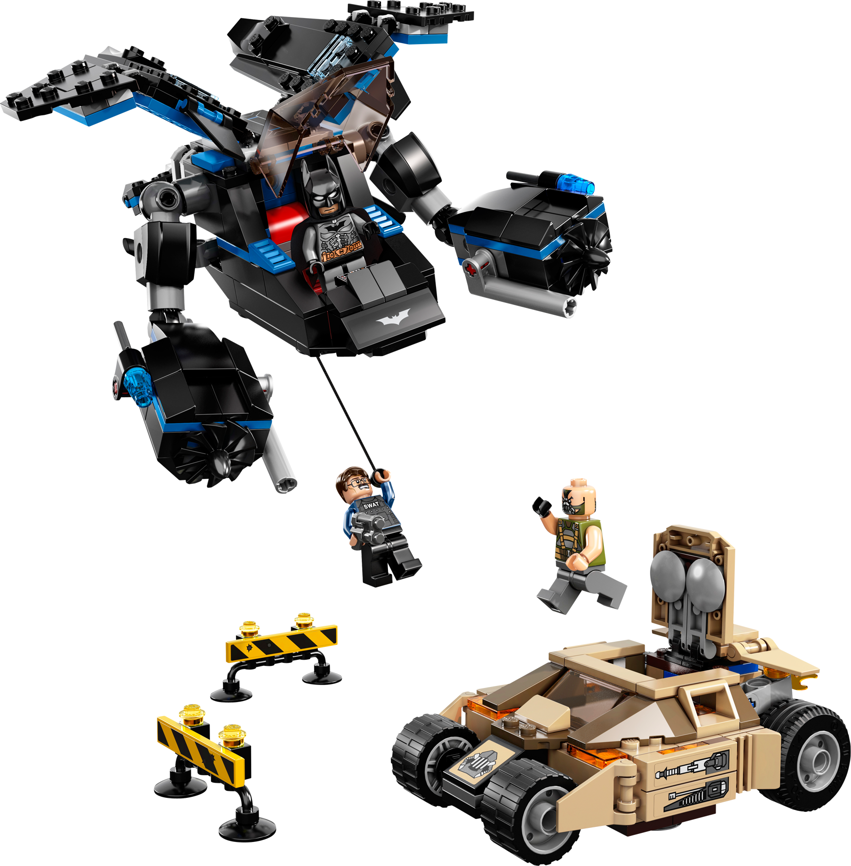 Launch an assault from the sky to rescue Commissioner Gordon from Bane! High above Gotham City, Batman™ spots Bane in the armored Tumbler chasing Police Commissioner Gordon. Bust through the road barricades in the Bane Tumbler with hidden dual flick missiles and flame exhaust. Then swoop down from the skies in The Bat and winch the commissioner to safety with the rescue rope before Bane reaches him! Includes 3 minifigures: Batman, Bane and Police Commissioner Gordon with assorted weapons.• Includes 3 minifigures: Batman™, Bane and Police Commissioner Gordon with assorted weapons• Features 2 road barriers• Vehicles include The Bat and the Tumbler• The Tumbler features opening roof hatch and dual hidden flick missiles• The Bat features an opening cockpit that fits 2 minifigures, dual flick-fire missiles and rescue rope• Weapons include a gun and batarang• Fire the flick missiles!• Lift Commissioner Gordon to safety with the rescue rope!• Break through the barriers!• The Bat measures over 2" (7cm) high, 7" (20cm) long and 5" (14cm) wide• Tumbler measures over 1" (4cm) high, 4" (11cm) long and 3" (8cm) wide