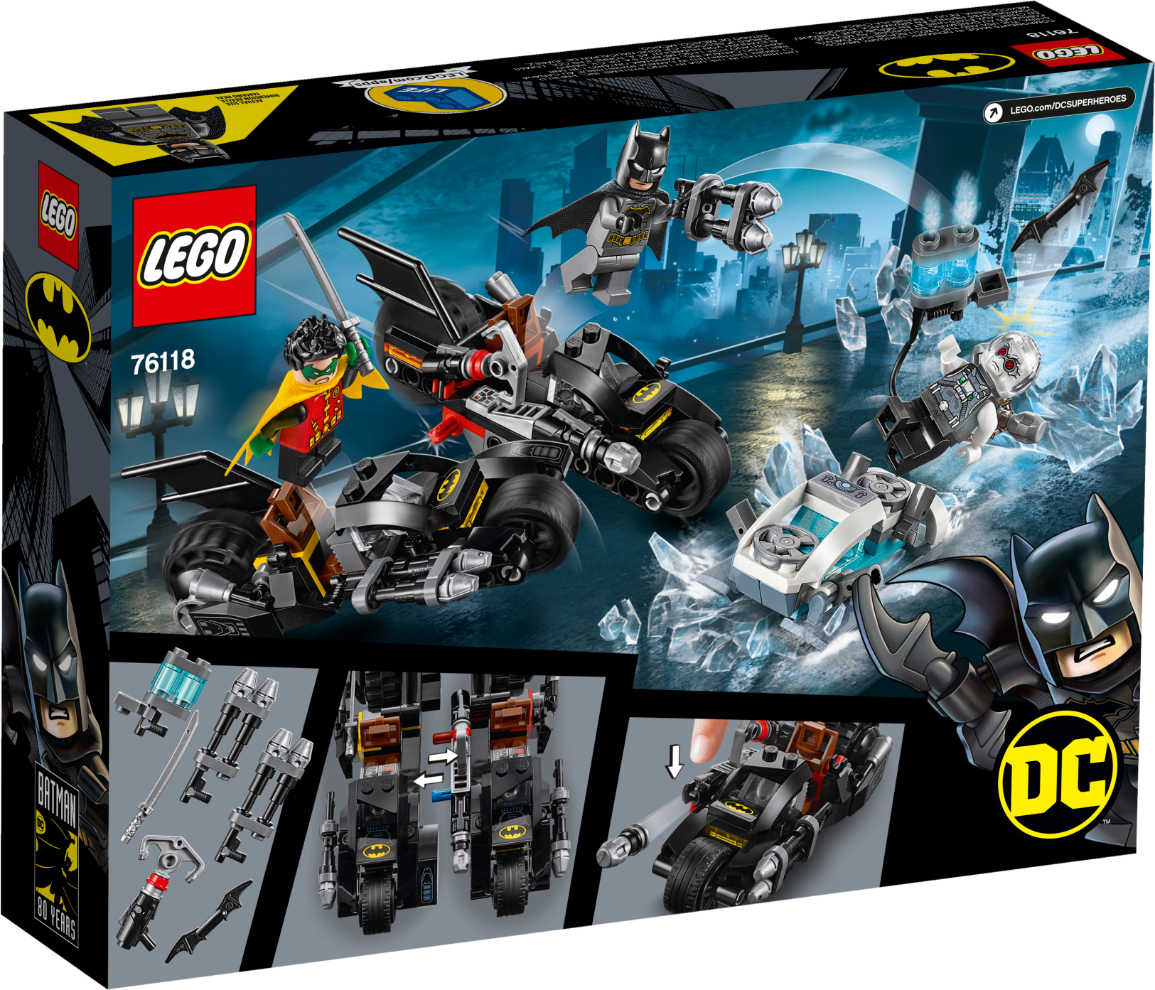 Children can create their own thrilling adventures as Batman™ and Robin™ and bid to save GOTHAM CITY™ from Mr. Freeze™ in LEGO® DC Batman 76118 Mr. Freeze Batcycle Battle. Great for solo or social play, this super-hero toy playset features the Batcycle with a dual minifigure cockpit, stud shooter and detachable weapons, and kids will love the split function to divide the vehicle into 2 separate bikes. Mr. Freeze's snow scooter and backpack with attached freeze gun add to the super heroes vs. Super-Villain battle fun. This LEGO Batman toy includes 3 LEGO minifigures with weapons, plus 10 assorted Action Pack elements to customize builds, minifigures and weapons. Give any LEGO builder an amazing building experience with Instructions PLUS, available in the LEGO Life app for smartphones and tablets. The easy-to-use, intuitive building instructions let them zoom, rotate and visualize their creation using the special ghost mode as they go. Instructions PLUS is also great for younger builders, guiding them through the building process for a greater sense of independence and achievement.