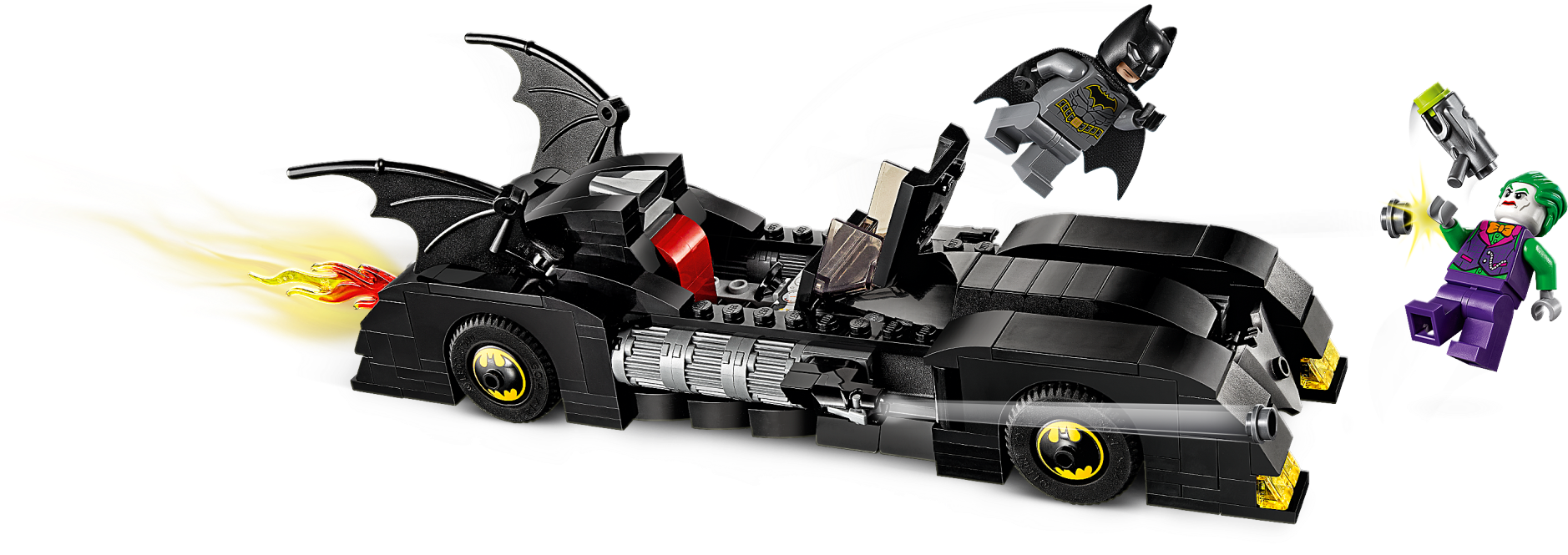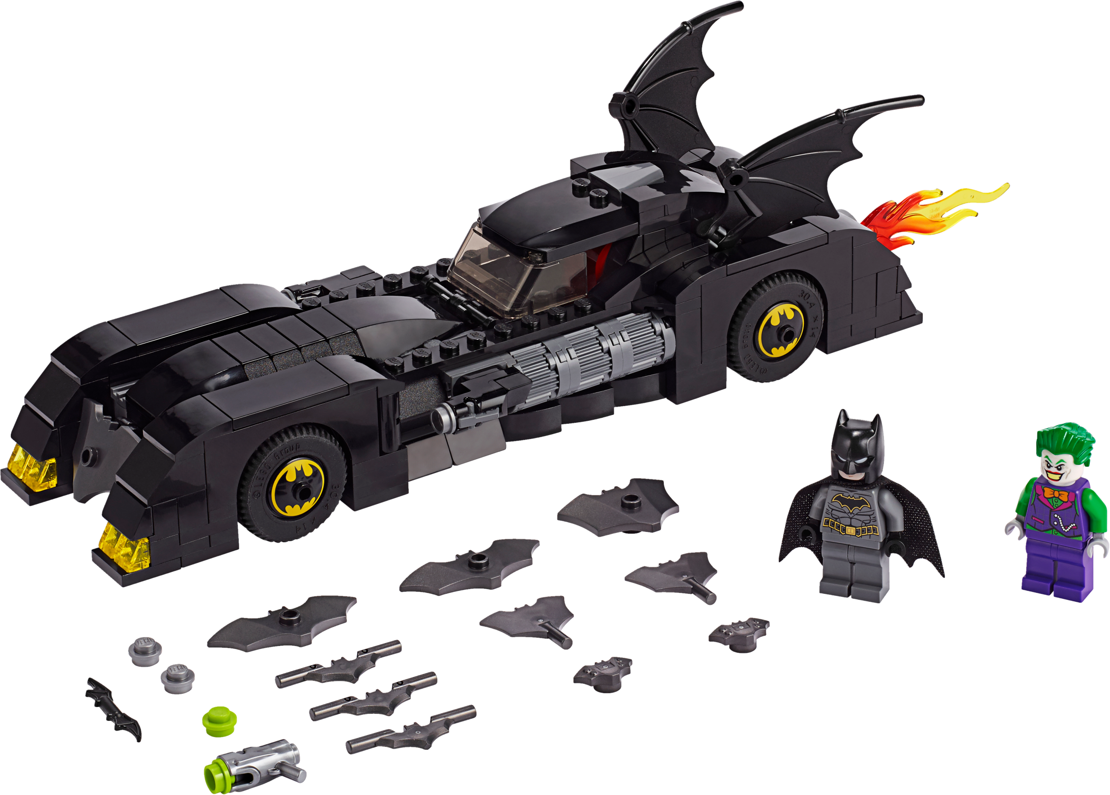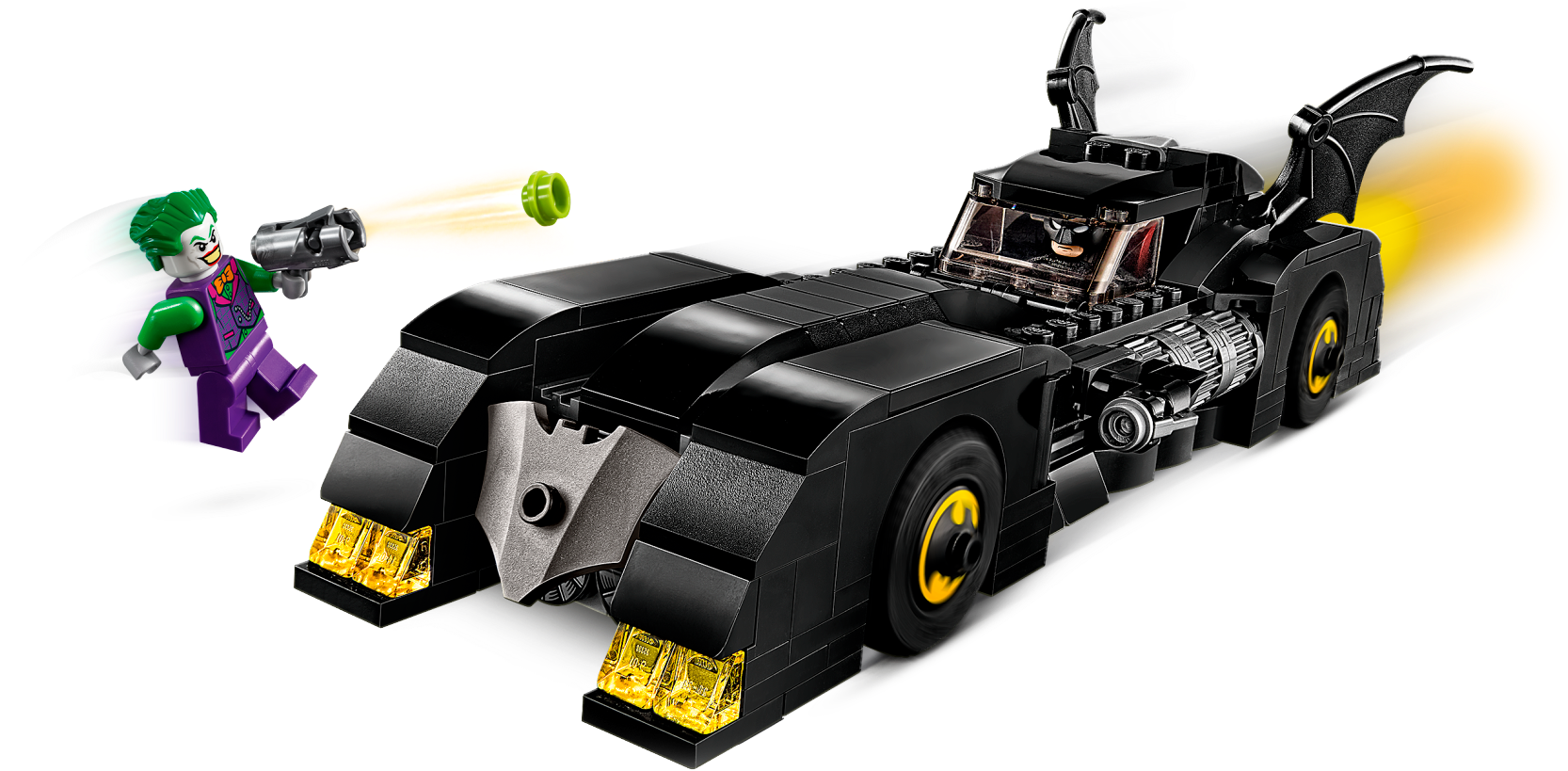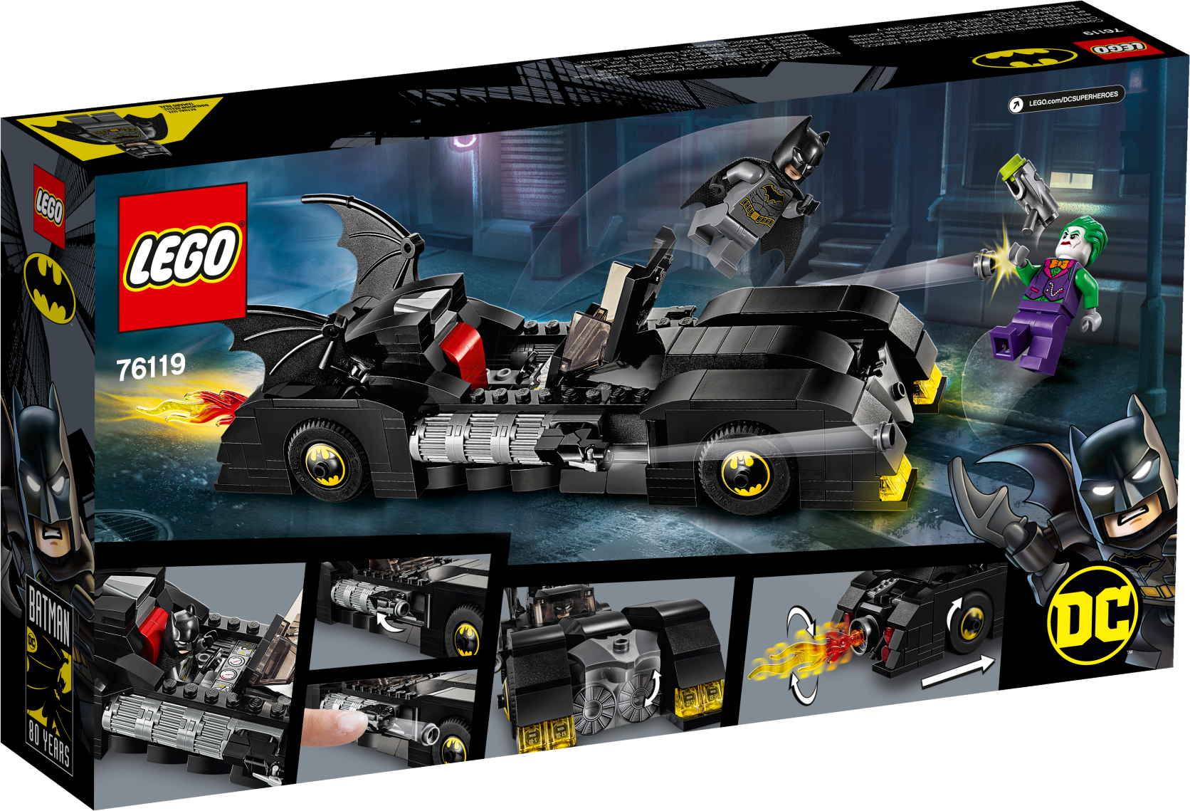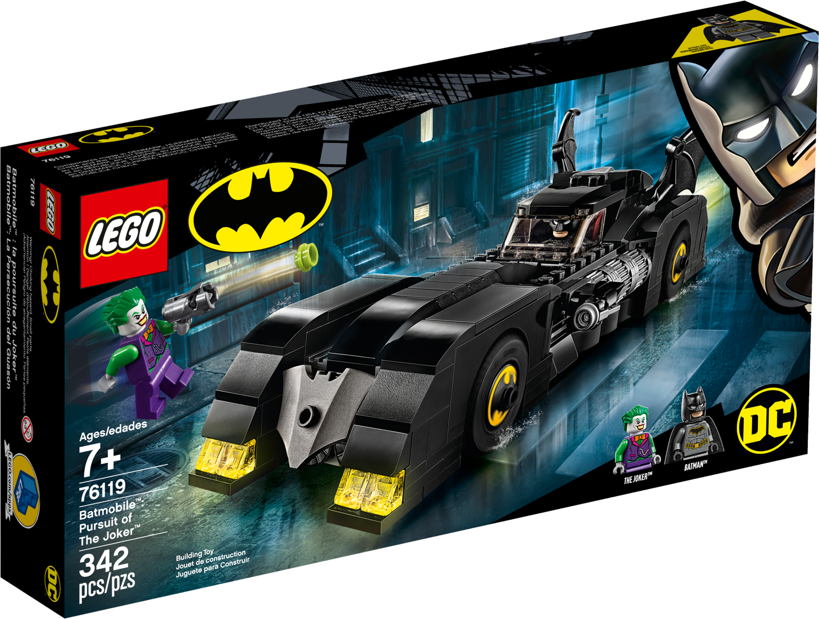 Kids will love pretending to be Batman™ and The Joker™ with LEGO® DC Batman 76119 Batmobile™: Pursuit of The Joker. This classic Batmobile toy car model has lots of eye-catching features to delight young super heroes, including a detailed dashboard in the opening minifigure cockpit, Bat symbol decoration on the wheel trims and a flame exhaust element that automatically rotates when the car is pushed along. The Batmobile's hidden, foldout stud shooters are also great for battles against The Joker, who is also equipped with a stud shooter. This LEGO Batman toy playset includes 2 minifigures and children can customize their builds, minifigures and weapons with the included pack of 10 assorted Bat elements. Give any LEGO builder an amazing building experience with Instructions PLUS, available in the LEGO Life app for smartphones and tablets. The easy-to-use, intuitive building instructions let them zoom, rotate and visualize their creation using the special ghost mode as they go. Instructions PLUS is also great for younger builders, guiding them through the building process for a greater sense of independence and achievement. This super-hero toy playset includes 2 new-for-June-2019 LEGO® minifigures: Batman™ and The Joker™. Batmobile™ features an opening minifigure cockpit with detailed dashboard, 2 hidden, foldout stud shooters, opening hood with brick-built engine inside, automatic spinning flame exhaust element function, wheel trims with Bat symbol decoration, 2 batwings and translucent yellow and red light elements. The flame exhaust element spins around when the car is moved along. This LEGO® Batman™ toy playset includes The Joker’s stud shooter and 10 assorted Bat elements to customize builds, minifigures and weapons. This cool kids’ toy makes the best super-hero gift for Batman™ fans. Use the LEGO® Life app to access the intuitive Instructions PLUS building instructions for this super-hero toy. Help even younger builders through the building process, with easy-to-use zoom, rotate and ghost-mode functions to visualize their creations as they go. Batmobile™ toy car measures over 2” (7cm) high, 9” (24cm) long and 2” (6cm) wide.