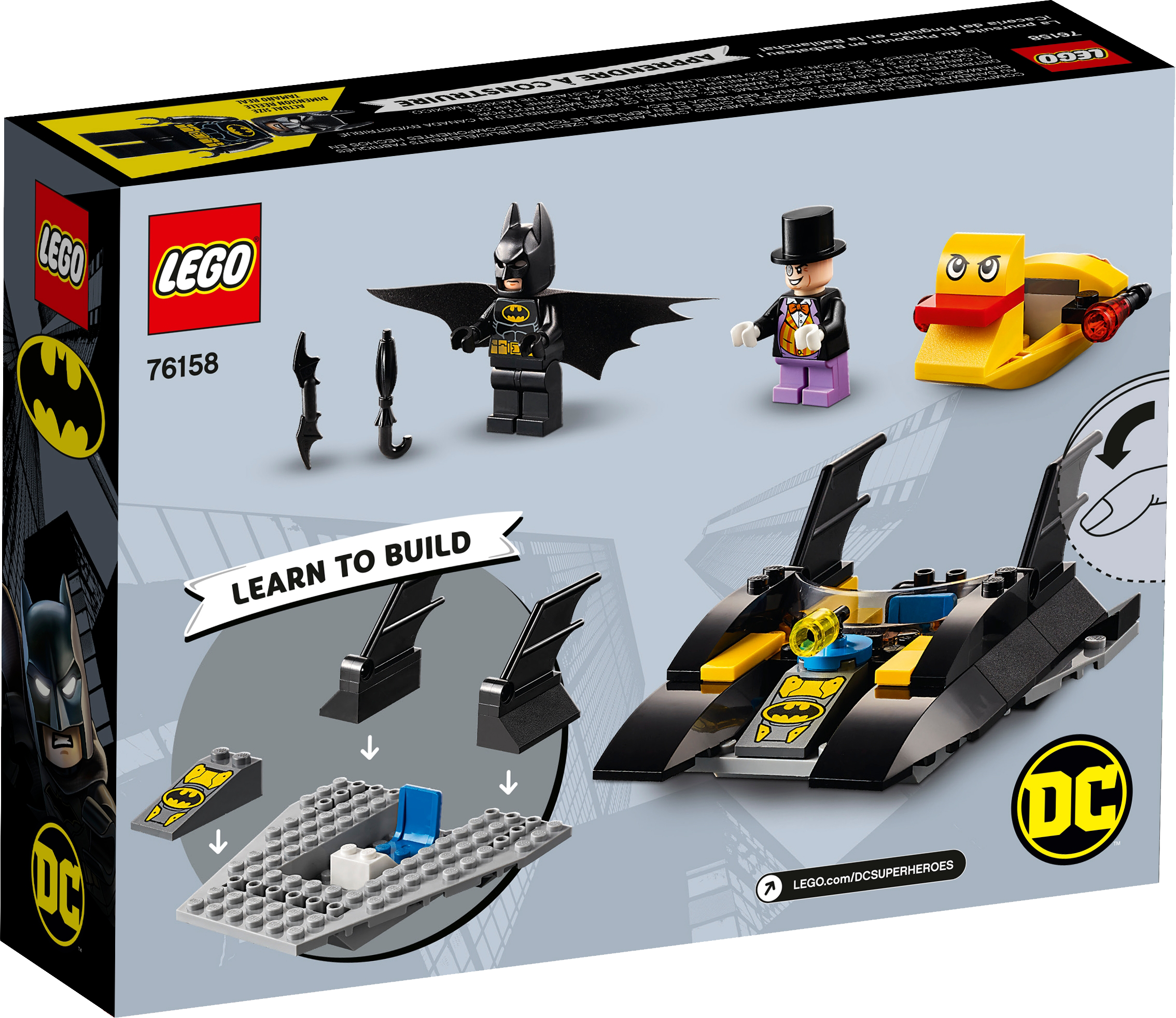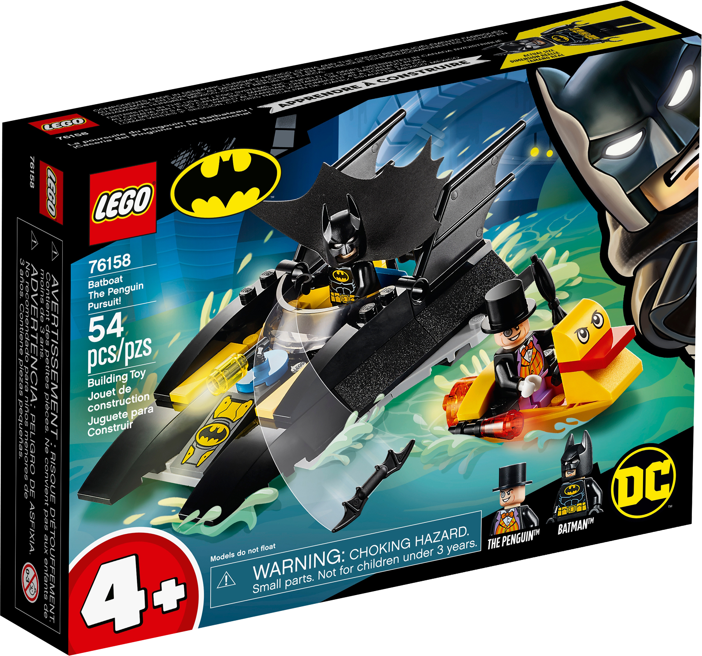 LEGO® DC Batboat The Penguin Pursuit! (76158) gives youngsters endless imaginative role-play possibilities with favorite characters from the Batman™ movies.Top build-and-play toy for Batman fans!Batman and The Penguin™ minifigures and 2 cool buildable boats put super-hero action and adventure right into kids' hands. This LEGO 4+ set is a great way for preschoolers and youngsters to learn building skills. It's easy to build, so even first-time builders can experience the joy of construction “by myself” – and a simple guide clearly explains the building process, giving kids the confidence to take on more challenging LEGO projects.Looking for the best Batman gifts for kids?If you want a cool birthday gift or Christmas toy for kids aged 4 and up, LEGO DC Batman building sets have all the action minifigures, awesome features and developmental benefits that you need to make a young super hero's day!LEGO® DC Batboat The Penguin Pursuit! (76158) inspires young imaginations and creative thinking as kids enjoy role-play fun with super-hero minifigures and toy vehicles from DC comics and movies.This building set includes Batman™ and The Penguin™ minifigures, plus the Batboat and The Penguin's duck boat. The boats don't float, but they provide endless play possibilities on dry land!LEGO® 4+ sets get youngsters building right away with a special Starter Brick. As they build, their confidence grows, and they discover a never-ending universe of amazing characters and creative play possibilities.Packed with fun features and awesome accessories for imaginative play and super-hero action, this cool toy construction set is an ideal Christmas or birthday gift for preschoolers and youngsters aged 4 and up.With the Batboat measuring over 5” (13cm) long, this small toy for kids inspires super-hero fun on an epic scale – and when the action stops, it looks great on display in any kid’s bedroom.No batteries required. This hands-on, buildable toy is fueled by kids’ imaginations – so the fun never stops!The included simple guide helps youngsters build, play and develop confidence as they learn the purpose of the building steps.LEGO® DC playsets bring comic-book, super-hero action to kids' toys. With famous characters and cool vehicles, gadgets and weapons, fans can relive favorite scenes and create adventures of their own.LEGO® building toys for kids meet the highest industry standards, which means every playset is consistent, compatible and connects and pulls apart perfectly every time – and it’s been that way since 1958.LEGO® bricks and pieces are dropped, heated, crushed, twisted and analyzed to ensure every kid's LEGO gift meets the best toy safety and quality standards in the world.