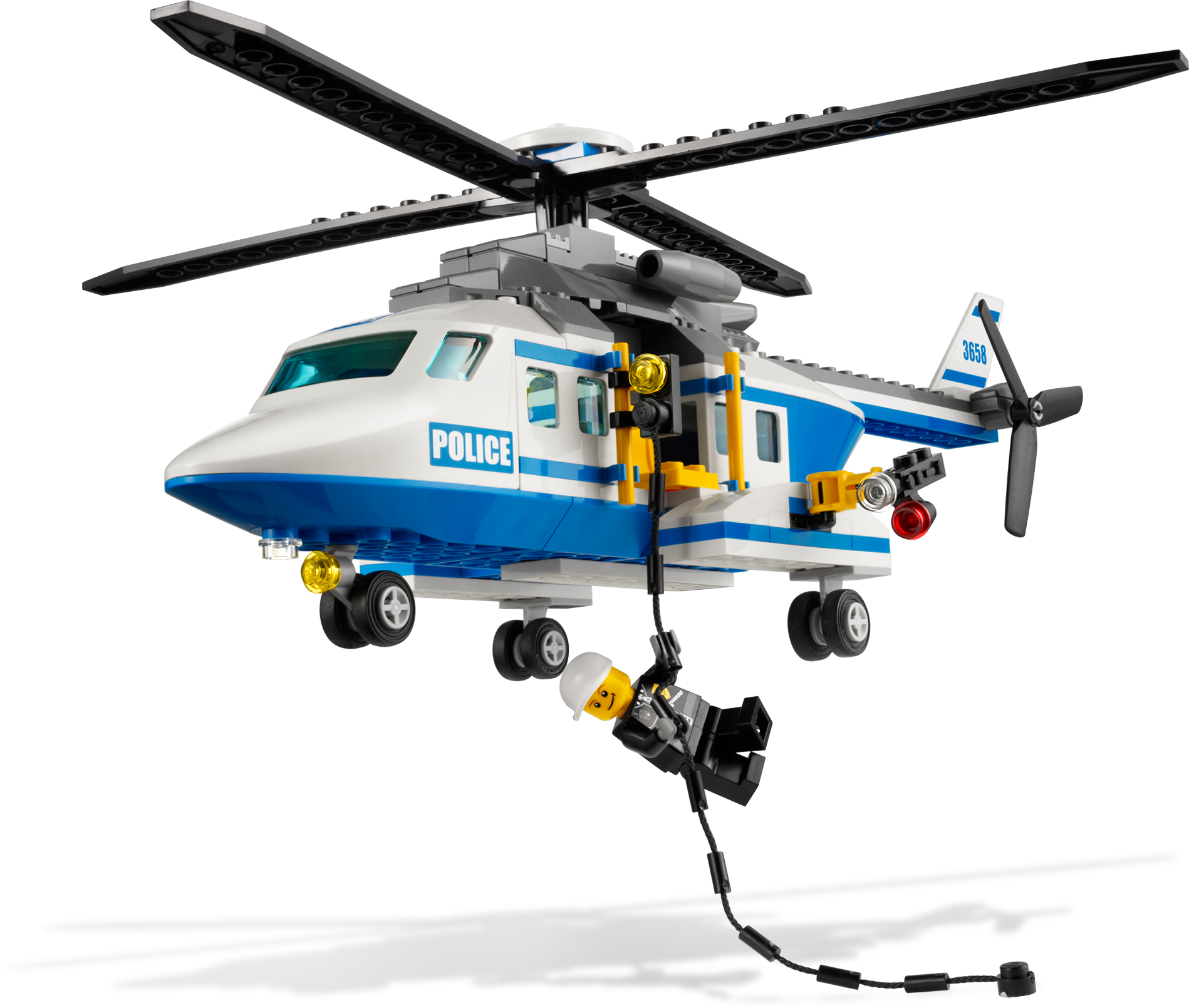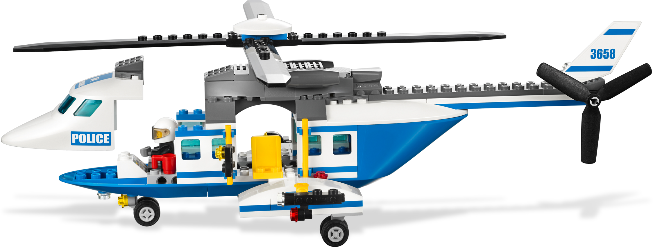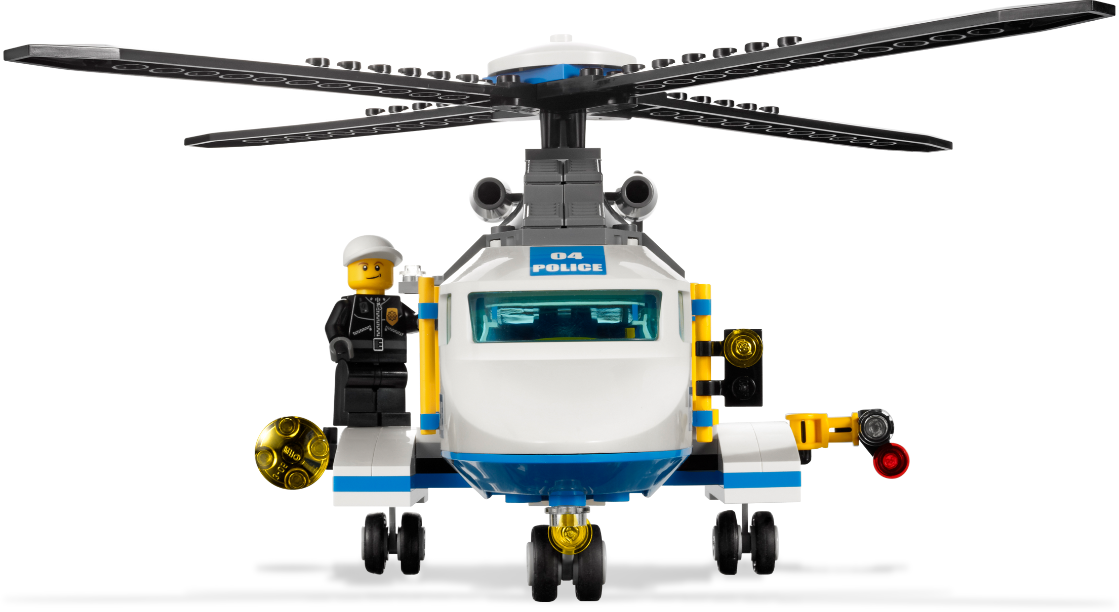 Fly after the robber and grab the cash! The robber is getting away in his van with a backpack full of money! Only the Police Helicopter can catch him. Fly after him and lower a police officer down the rope to arrest the robber and put him behind bars. Don’t forget to recover the money! Set includes 3 minifigures, Police Helicopter, getaway van, money brick and air traffic light. Includes 4 minifigures: 3 police officers and robber Features 2 vehicles: Police Helicopter and getaway van Accessories include money brick, rope and megaphone Spin the blades and propellers of the Police Helicopter! Lift the roof of the Police Helicopter for play inside! Vehicles feature realistic details including rubber tires and translucent elements Lower the rope down from the Police Helicopter to make the arrest! Getaway van measures 5” (12cm) long and 2” (5cm) wide Police Helicopter measures 12” (30cm) long and 4” (10cm) wide