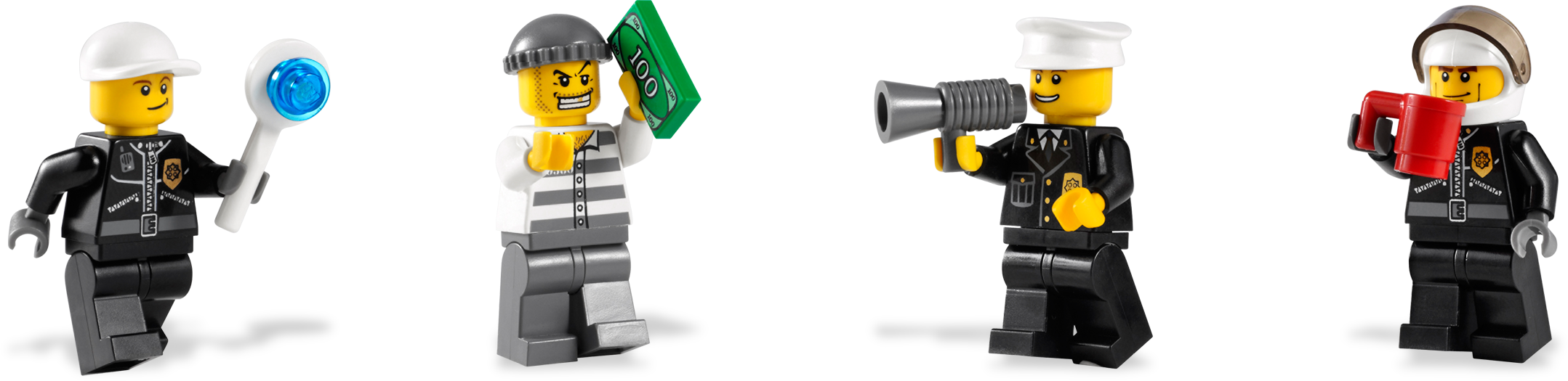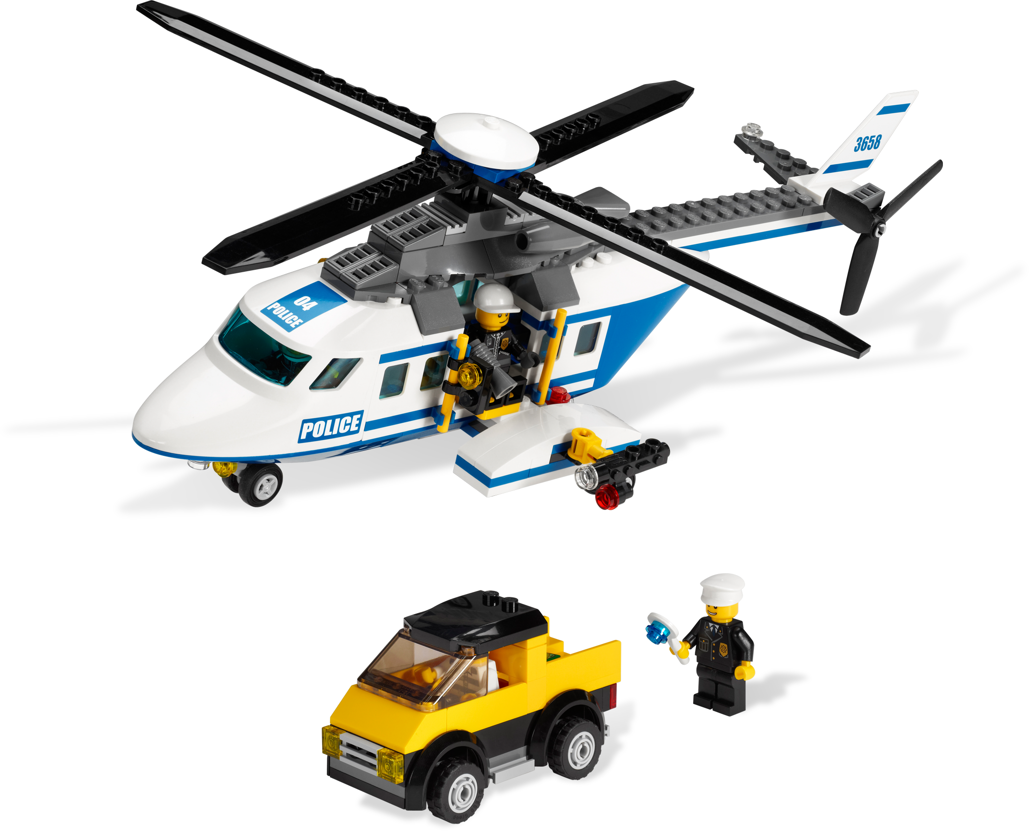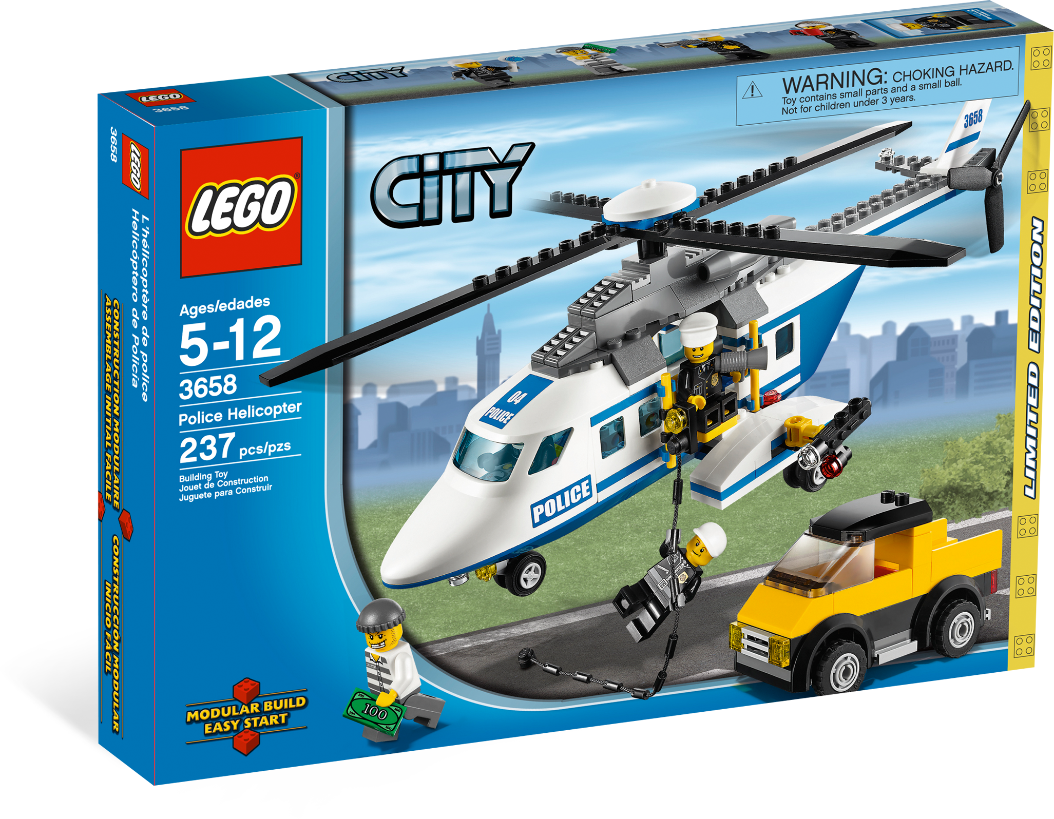 Fly after the robber and grab the cash! The robber is getting away in his van with a backpack full of money! Only the Police Helicopter can catch him. Fly after him and lower a police officer down the rope to arrest the robber and put him behind bars. Don’t forget to recover the money! Set includes 3 minifigures, Police Helicopter, getaway van, money brick and air traffic light. Includes 4 minifigures: 3 police officers and robber Features 2 vehicles: Police Helicopter and getaway van Accessories include money brick, rope and megaphone Spin the blades and propellers of the Police Helicopter! Lift the roof of the Police Helicopter for play inside! Vehicles feature realistic details including rubber tires and translucent elements Lower the rope down from the Police Helicopter to make the arrest! Getaway van measures 5” (12cm) long and 2” (5cm) wide Police Helicopter measures 12” (30cm) long and 4” (10cm) wide
