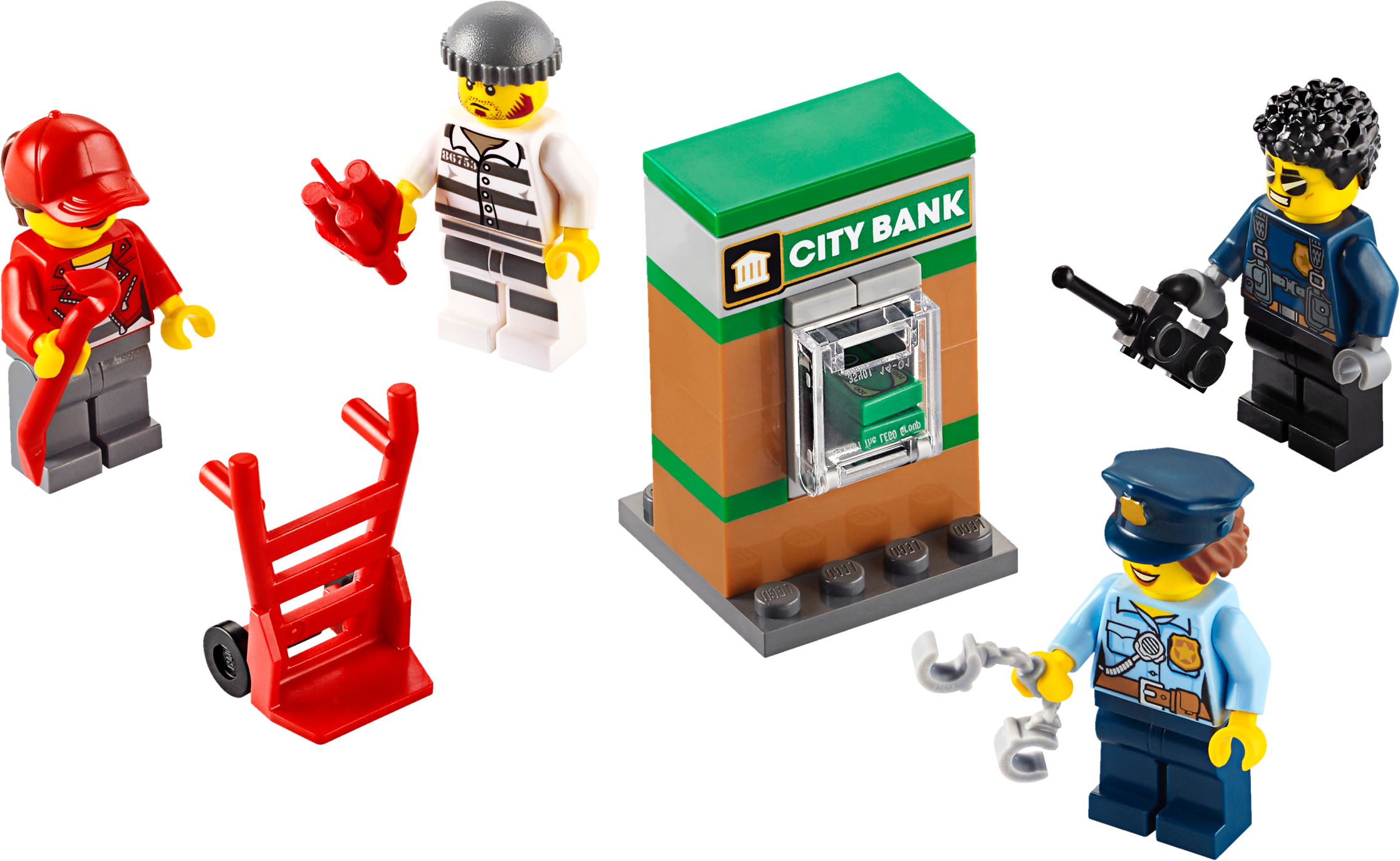 Includes LEGO® City TV hero Duke DeTain, police officer and 2 crook minifigures, plus a bank setting, crook's sack truck and walkie-talkie, crowbar and dynamite accessories.