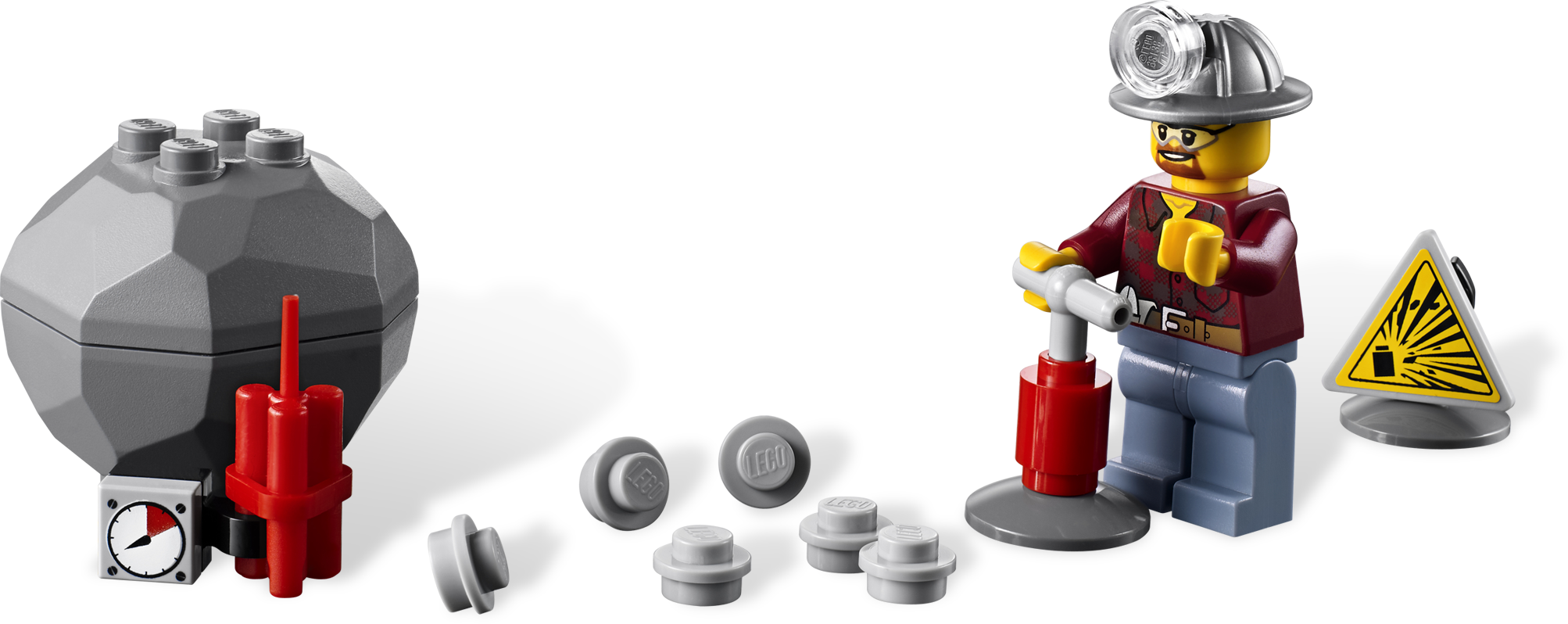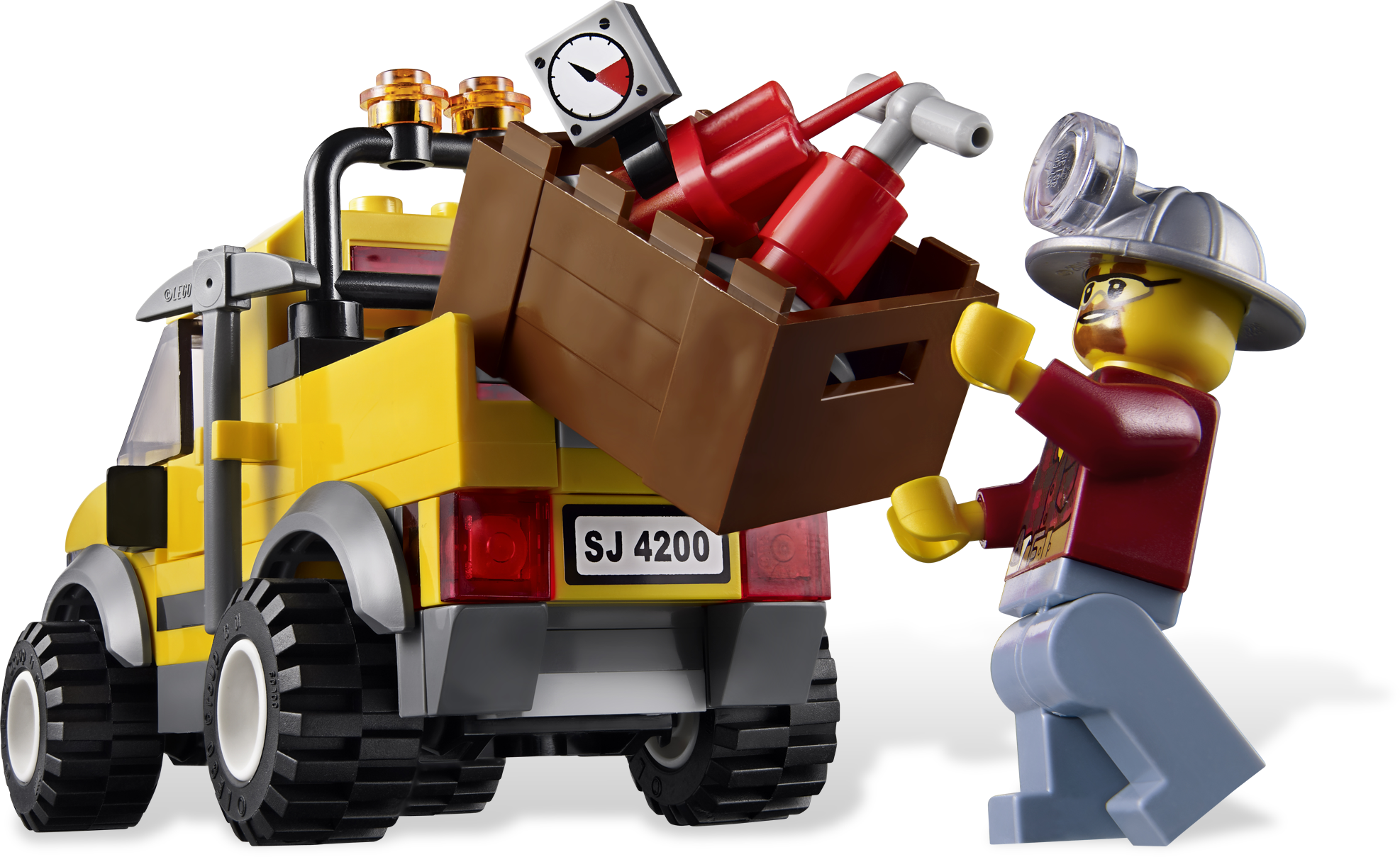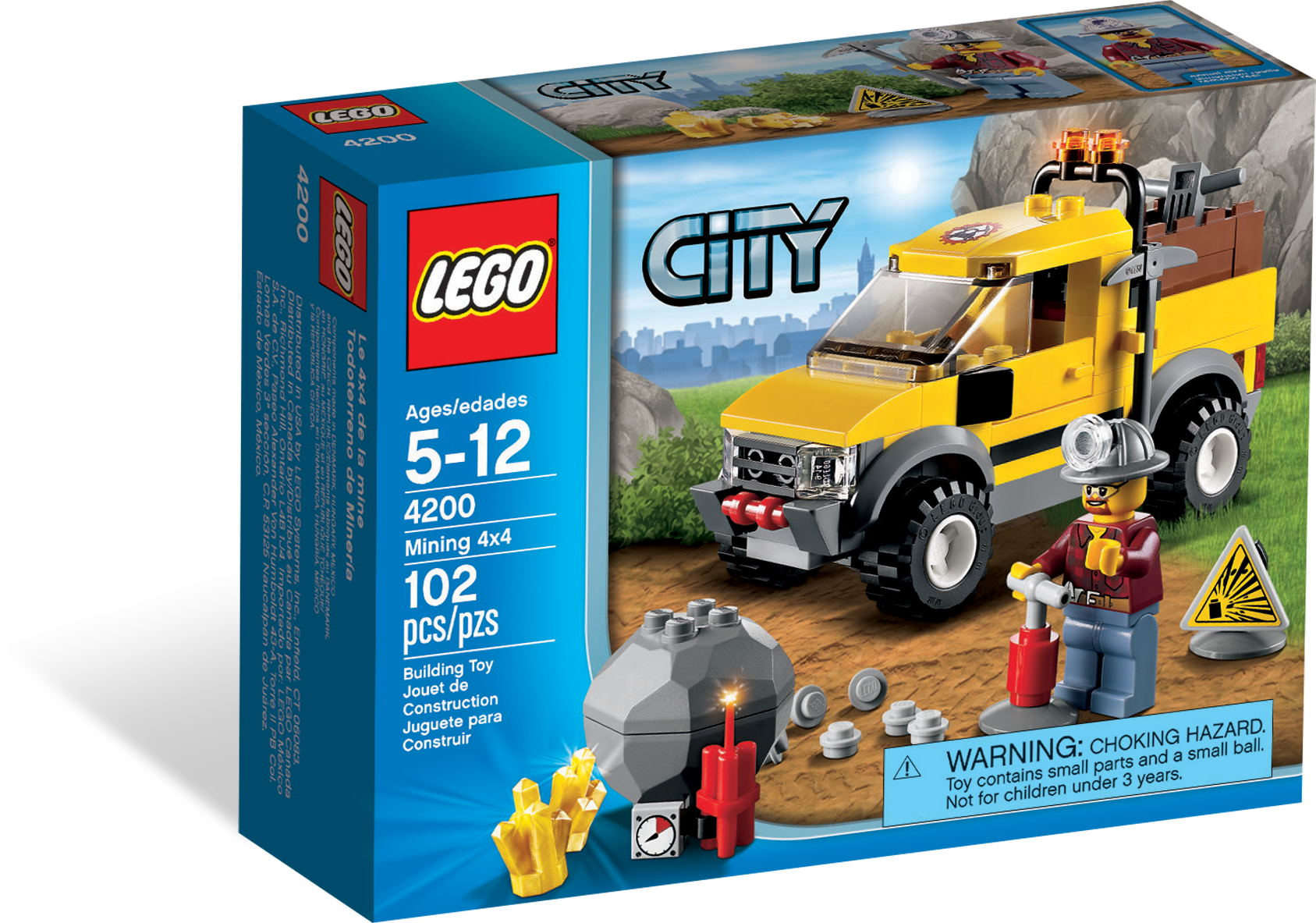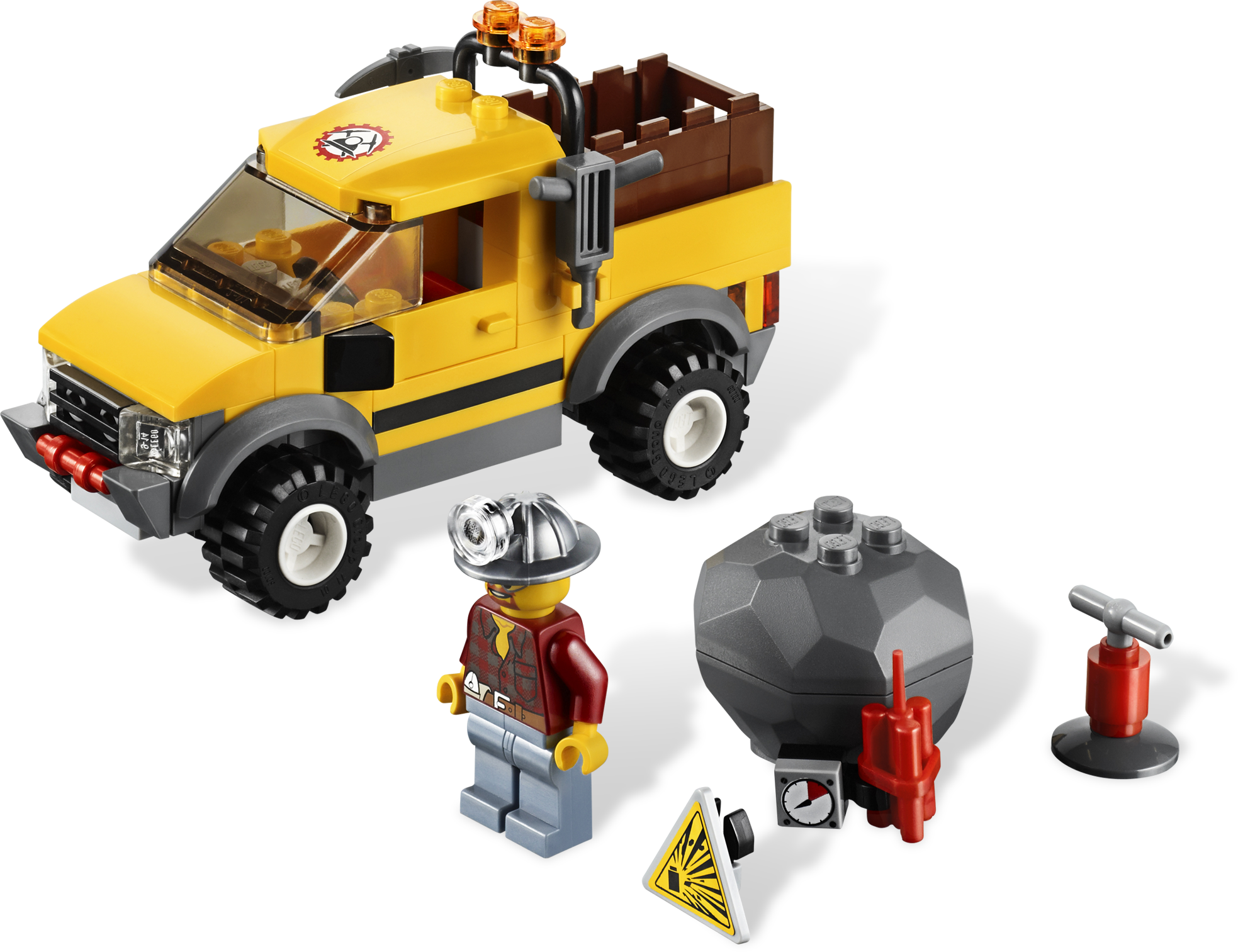Let's mine for gold with the rugged 4X4! The miner is driving his rugged Mining 4x4 and is on the lookout for gold. It won't be easy, but with his dynamite, hatchet and drill, it won't be long before he strikes gold. Blast the rock with the dynamite to find the gold nuggets and crystals! Includes miner minifigure.• Includes miner minifigure• Mining 4x4 features rear storage compartment• Accessories include hatchet, drill, dynamite with timer and detonator, warning sign, big rock containing gold nuggets and 2 gold crystals, and mining helmet• Blast the rock with the dynamite!• Find the gold!• Drive over rocky mine terrain with the Mining 4x4!• Measures over 2” (6cm) high, 2” (5cm) wide and 4” (11cm) long