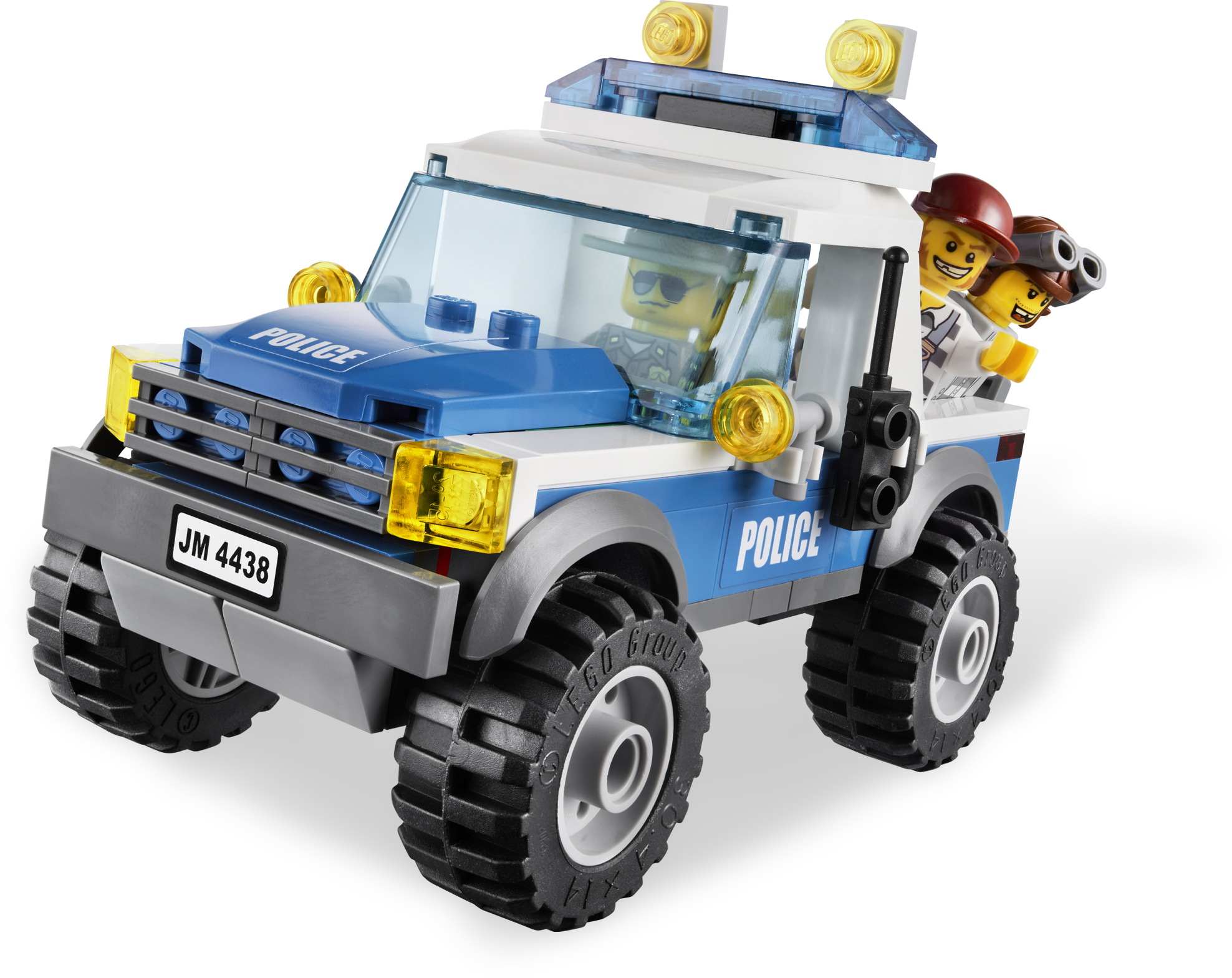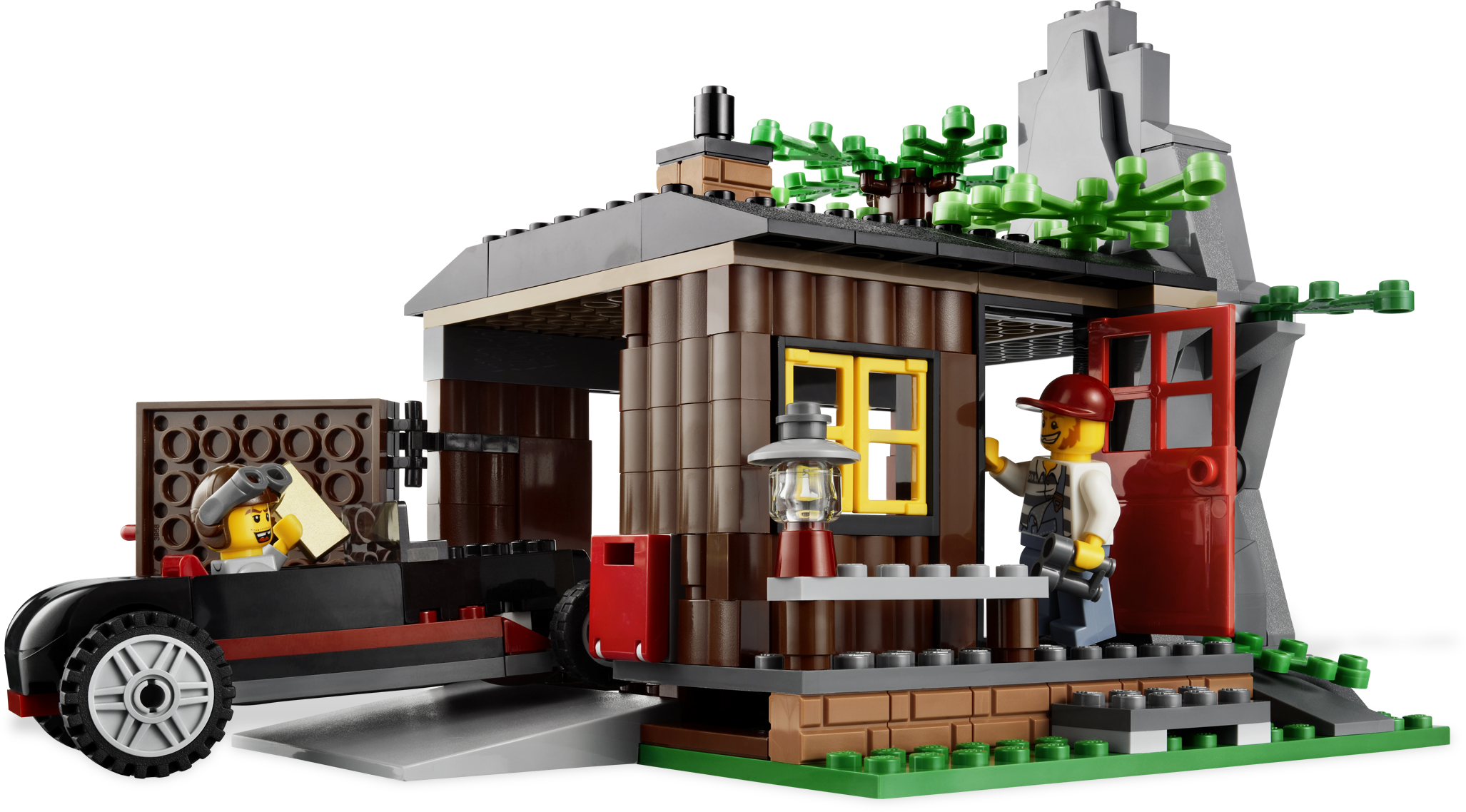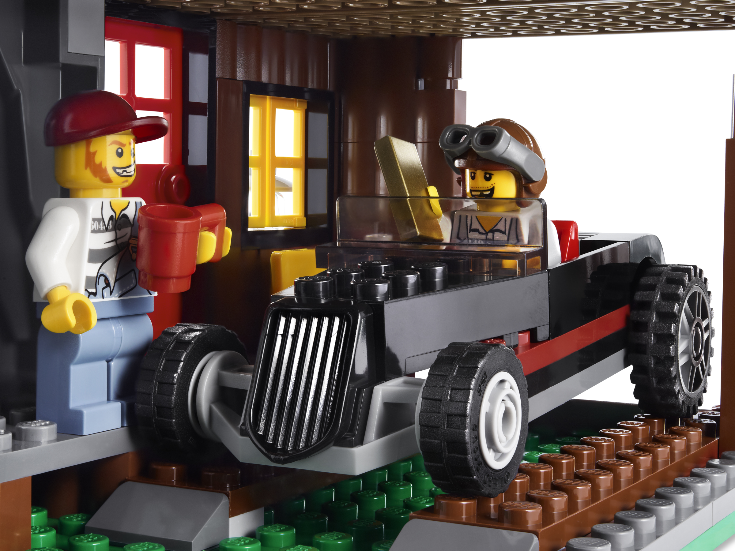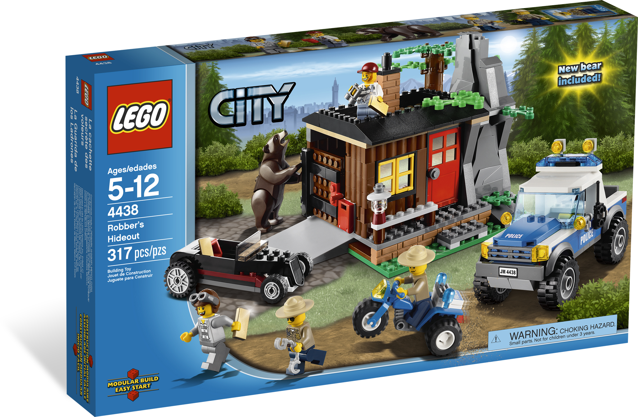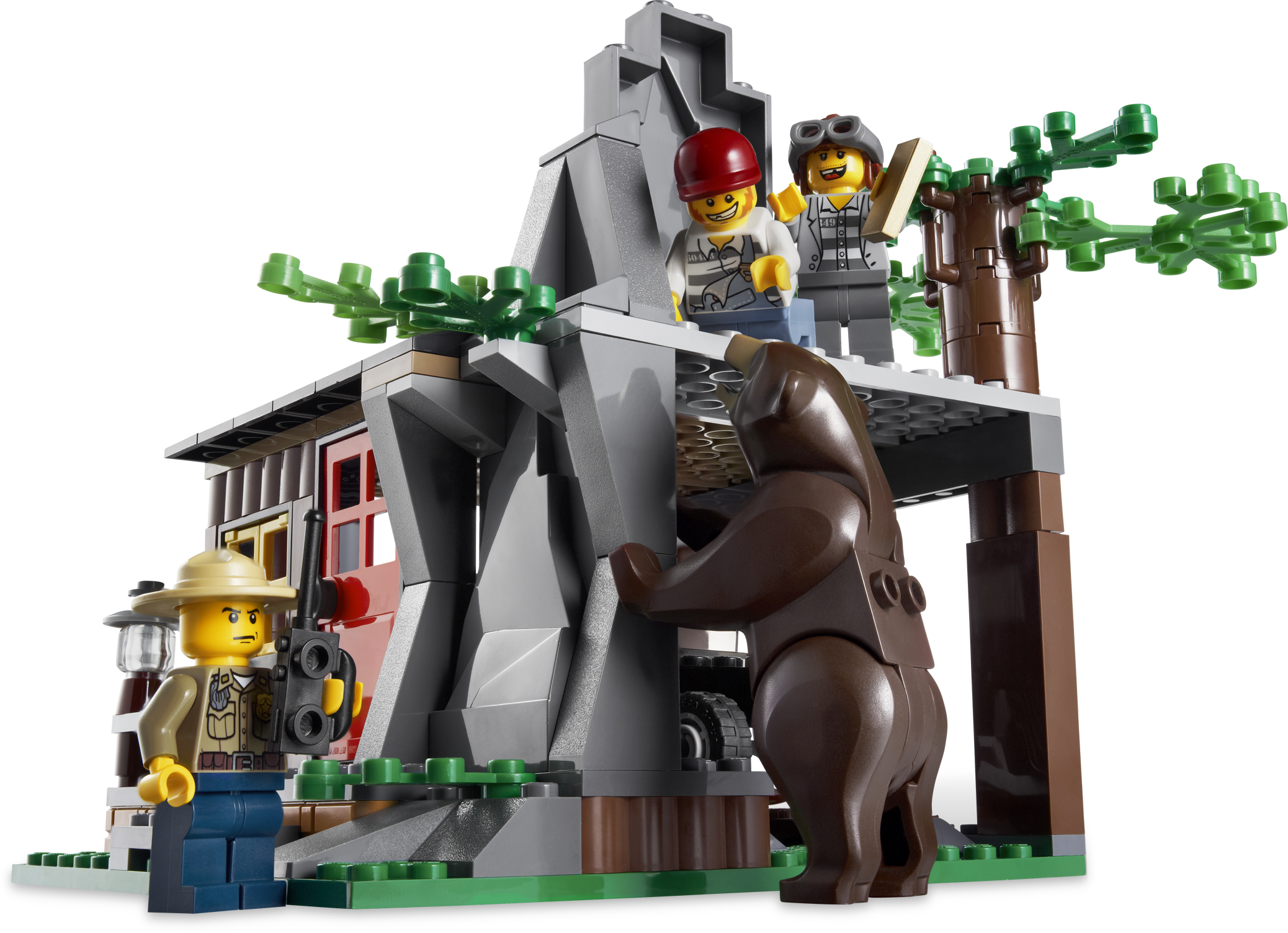 Catch the robbers red-handed at the their hideout! On the roof of their secret forest hideout, the robbers spot the policemen on their 3-wheel ATV and offroader. Can they hide the gold bars and make a quick getaway in the car? And have they noticed the huge bear sneaking around the corner? You decide! Includes 4 minifigures: 2 forest policemen and 2 robbers.Includes 4 minifigures: 2 forest policemen and 2 robbersVehicles include robbers’ car, police car and 3-wheel ATVFeatures poseable bearRobbers’ Hideout features rooftop hiding place and opening door with space inside to conceal the robbers’ carAccessories include binoculars, handcuffs, 3 gold bars, walkie-talkie and red mailboxCatch the robbers and recover the gold!Watch out for the bear!Robbers’ Hideout measures over 6” (17cm) wide and 5” (13cm) highRobbers’ car measures 4” (10cm) long, 12” (5cm) wide and 1” (3cm) highPolice car measures over 5” (12cm) long, 2” (6cm) wide and 3” (8cm) tallATV measures over 3” (7cm) long, 1” (4cm) wide and 1” (3 cm) high