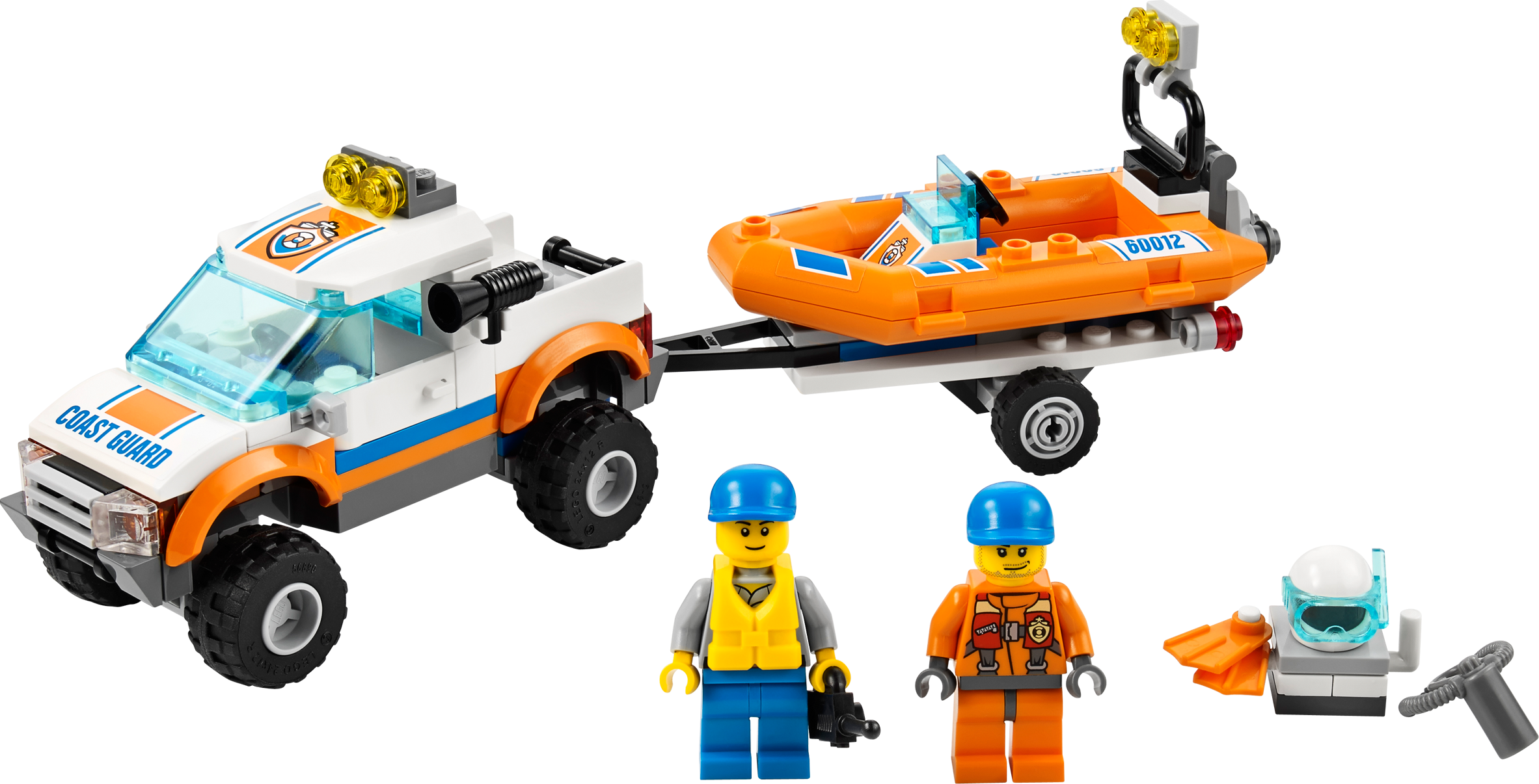 Save the day with the Coast Guard 4x4 and Diving Boat! Save the day with the LEGO® City Coast Guard 4x4 and Diving Boat! Launch the boat, put on the diving gear and splash into the water. Use the megaphone to direct the diver as he makes the rescue. Then, radio back to shore with the walkie-talkie. Includes 2 minifigures: a driver and a rescue diver.• Includes 2 minifigures: a driver and a rescue diver• Features chunky wheels, diving gear, walkie-talkie, megaphone and a detachable trailer• Diving Boat features an engine and a steering wheel• Life jacket also included• Unhitch the trailer and launch the Diving Boat!• Put on the diving gear!• Diving Boat really floats• 4x4 and trailer measure over 2" (6cm) high, 8" (22cm) long and 1" (5cm) wide• Diving Boat measures over 1" (4cm) high, 3" (9cm) long and 1" (5cm) wide
