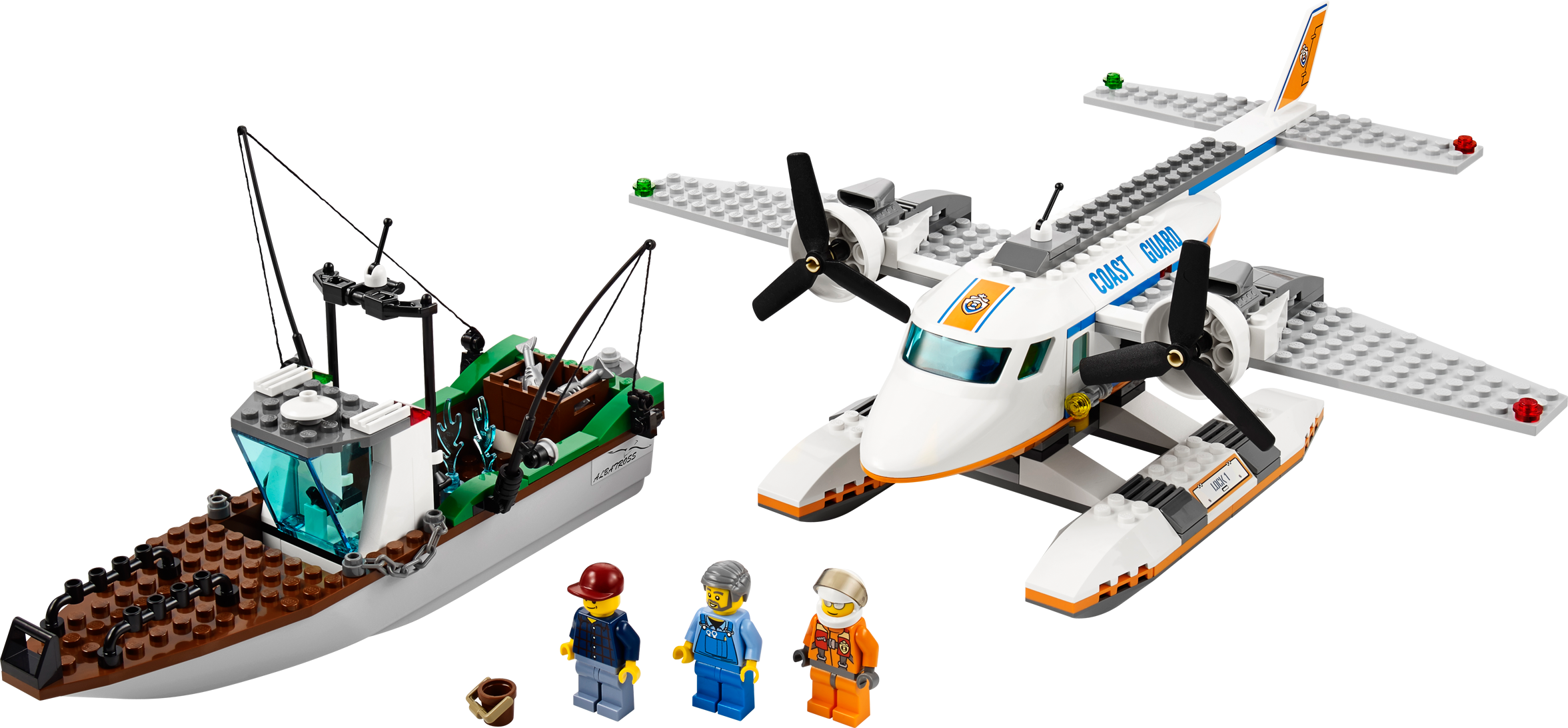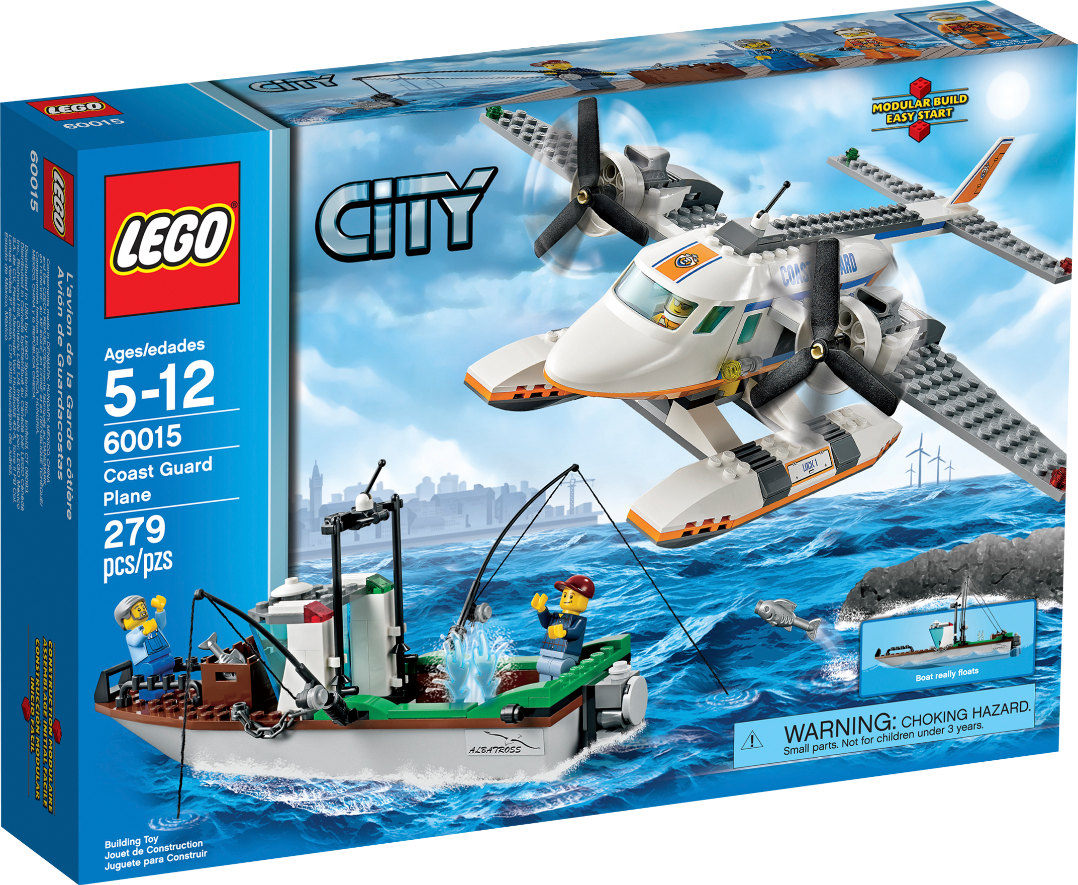Send in the Coast Guard Plane to rescue the sinking fishing boat! Launch a search and rescue mission with the LEGO® City Coast Guard Plane! When a big wave floods the fishing boat, locate it with the Coast Guard Plane fast. Help the fishermen to stay afloat by bailing the water with the buckets until the rescuers arrive. Make a smooth water landing and pull the fishermen in before the boat sinks! Includes 3 minifigures: a pilot and 2 fishermen.• Includes 3 minifigures: a Coast Guard pilot and 2 fishermen• Features floats and twin propellers• Fishing boat features a motor, 2 fishing rods, storage box, fire extinguisher and tools• Accessories include 2 fish, 2 water elements and a bucket• Fishing boat really floats• Locate the boat and make a water landing!• Spin the rotors• Rescue the fishermen before the boat goes down!• Measures over 3" (10cm) high, 11" (29cm) long and 12" (32cm) wide• Fishing boat measures over 4" (12cm) high, 9" (24cm) long and 3" (10cm) wide
