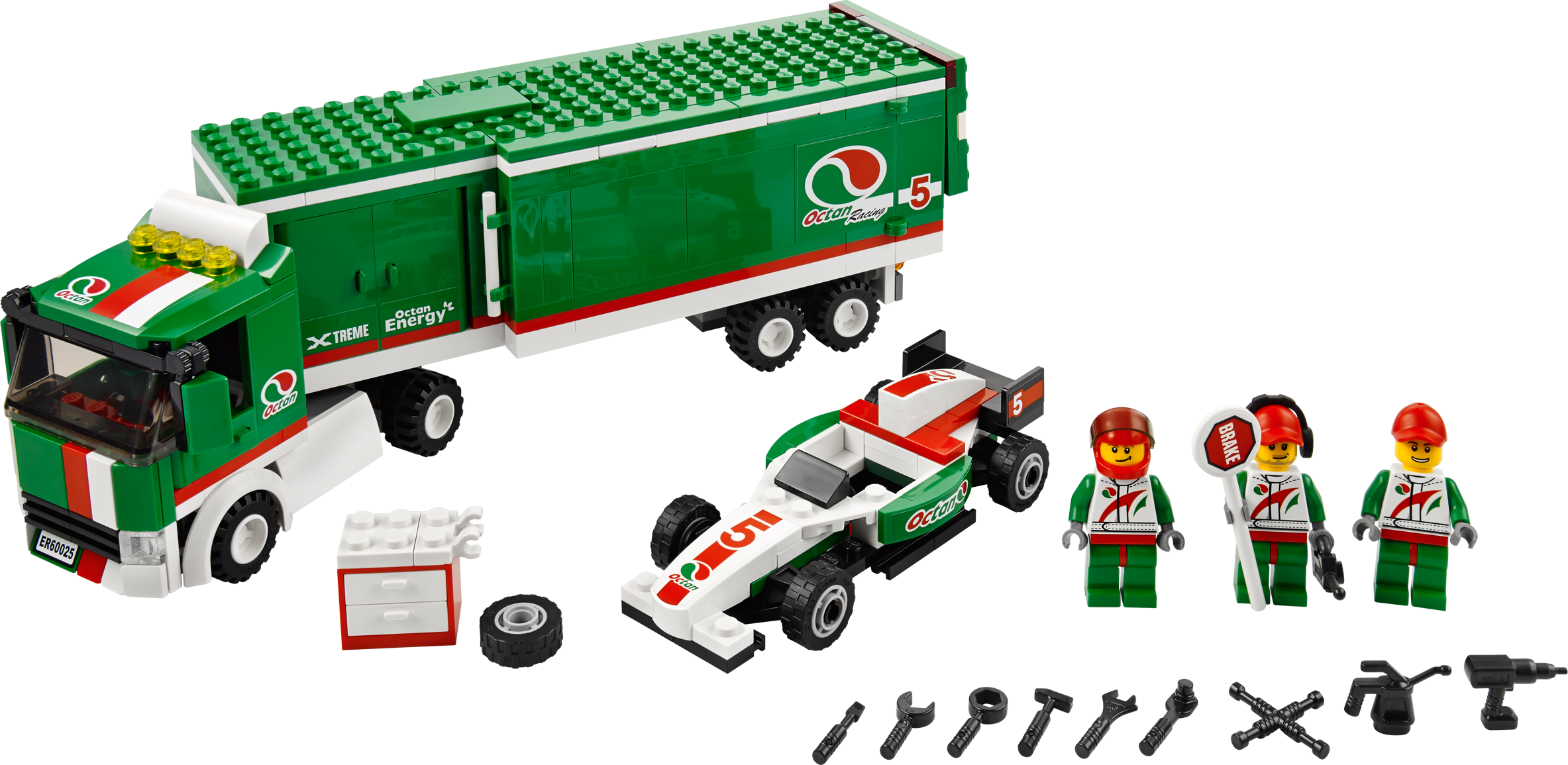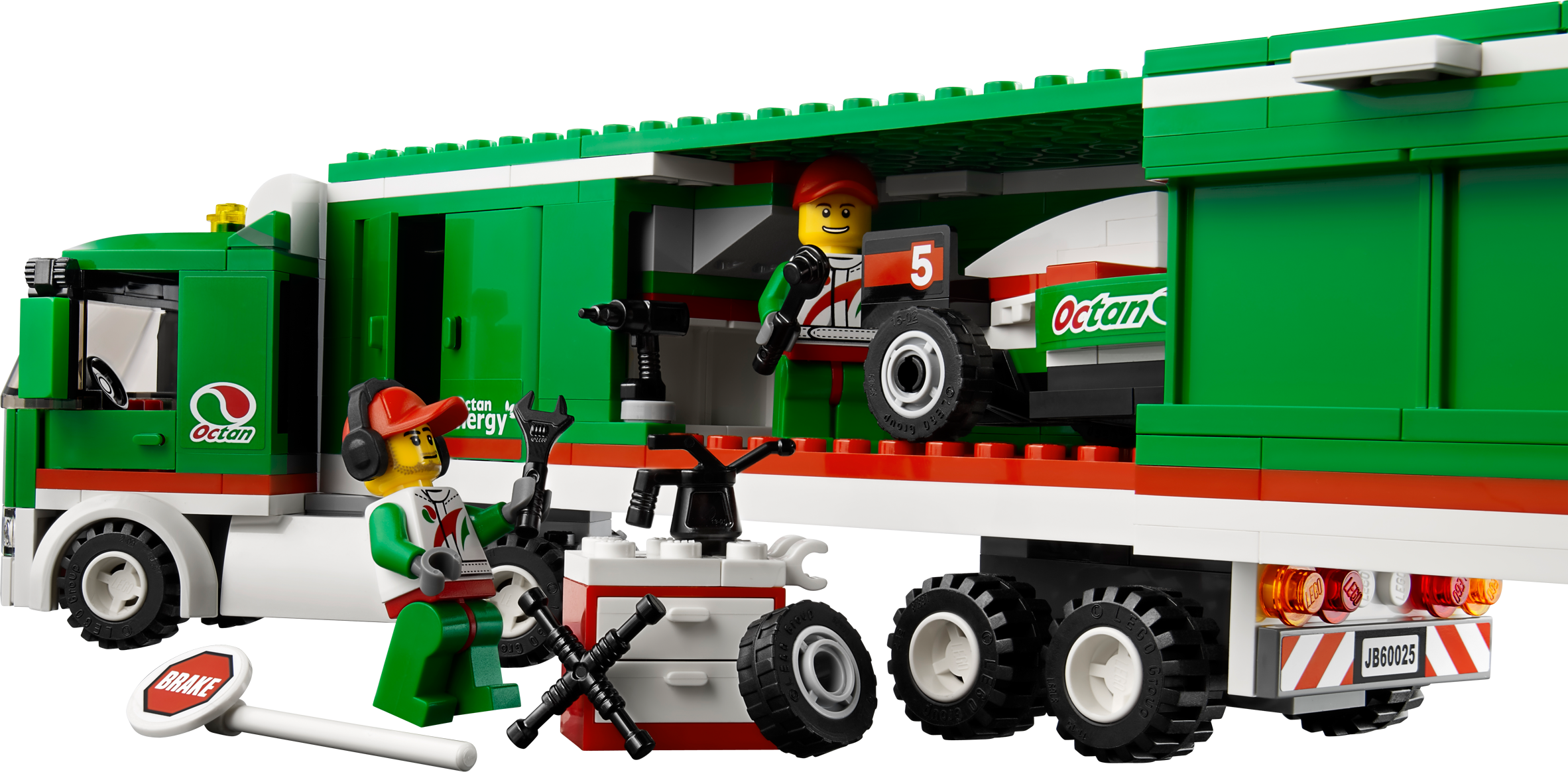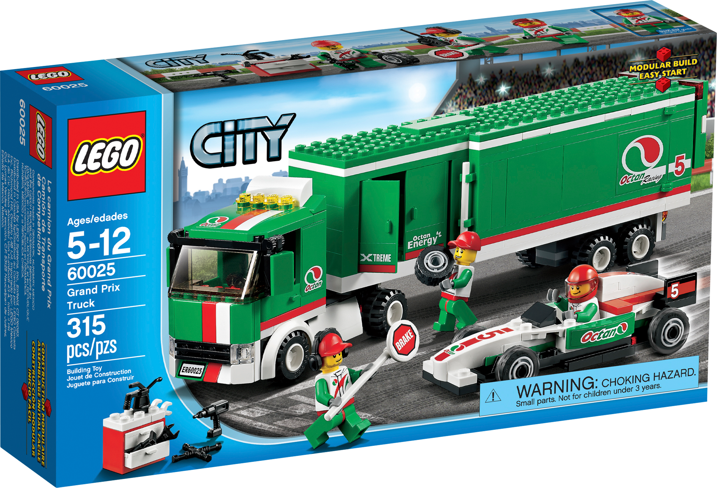 Back up the Grand Prix Truck, open the articulated trailer and unload the super-fast Formula race car. Put the driver in the cockpit quick and speed into the big LEGO® City road race! When a tire goes flat, help the pit crew to grab the tools from the toolbox and change it! Speed out of the pit toward the finish line and win the race! Includes 3 minifigures with accessories: race driver and 2 pit crew workers.