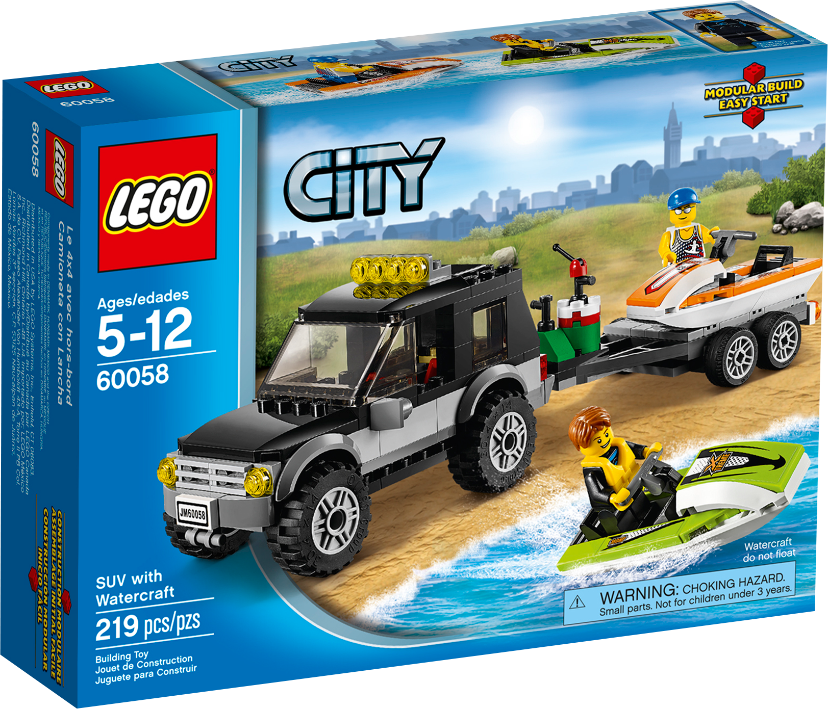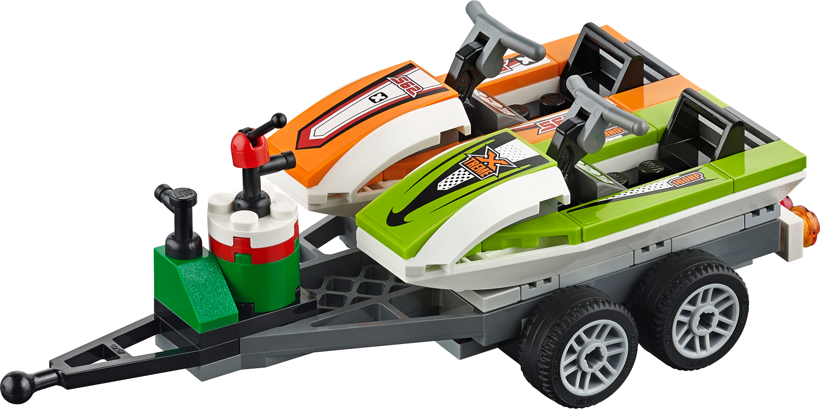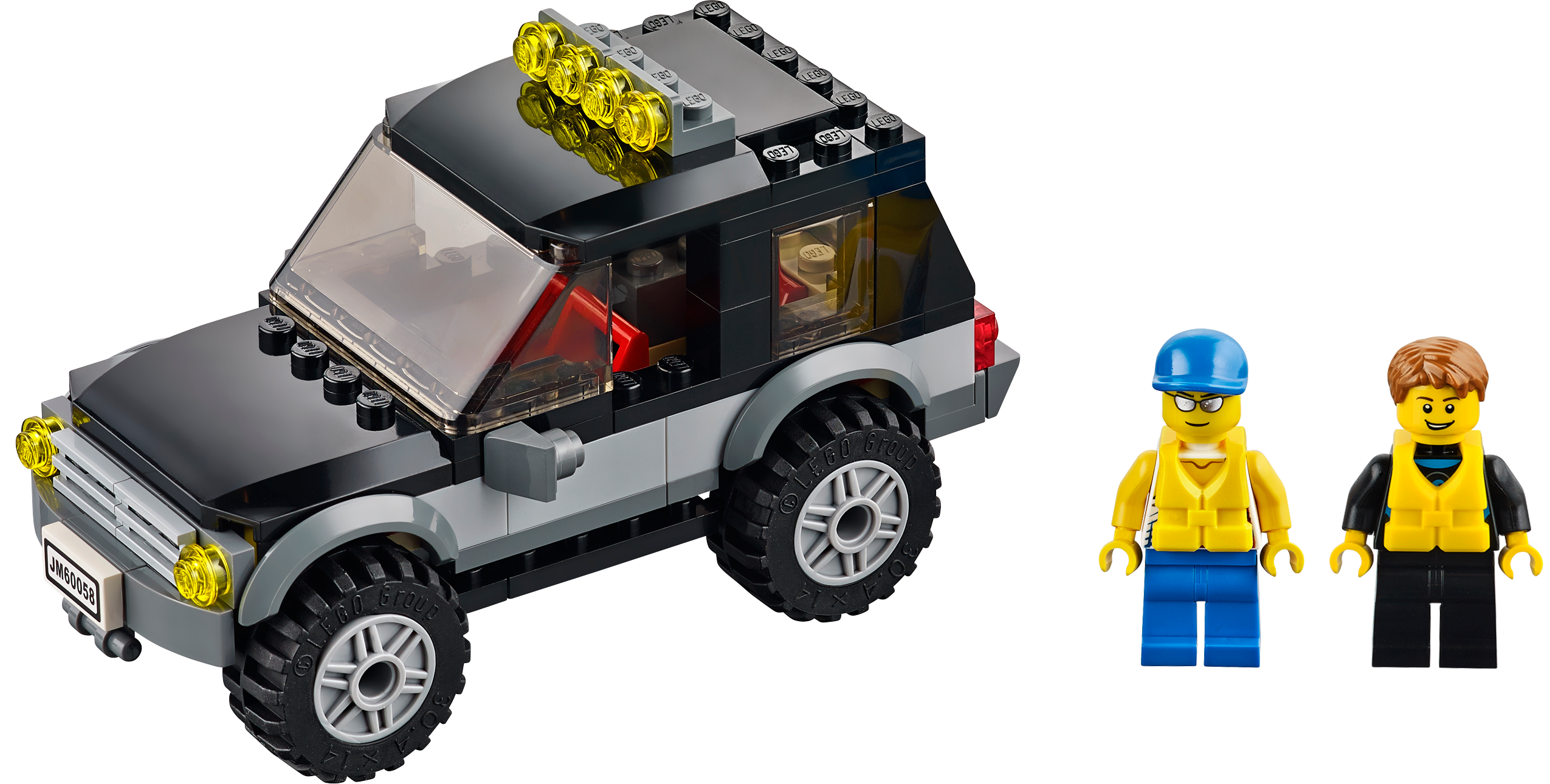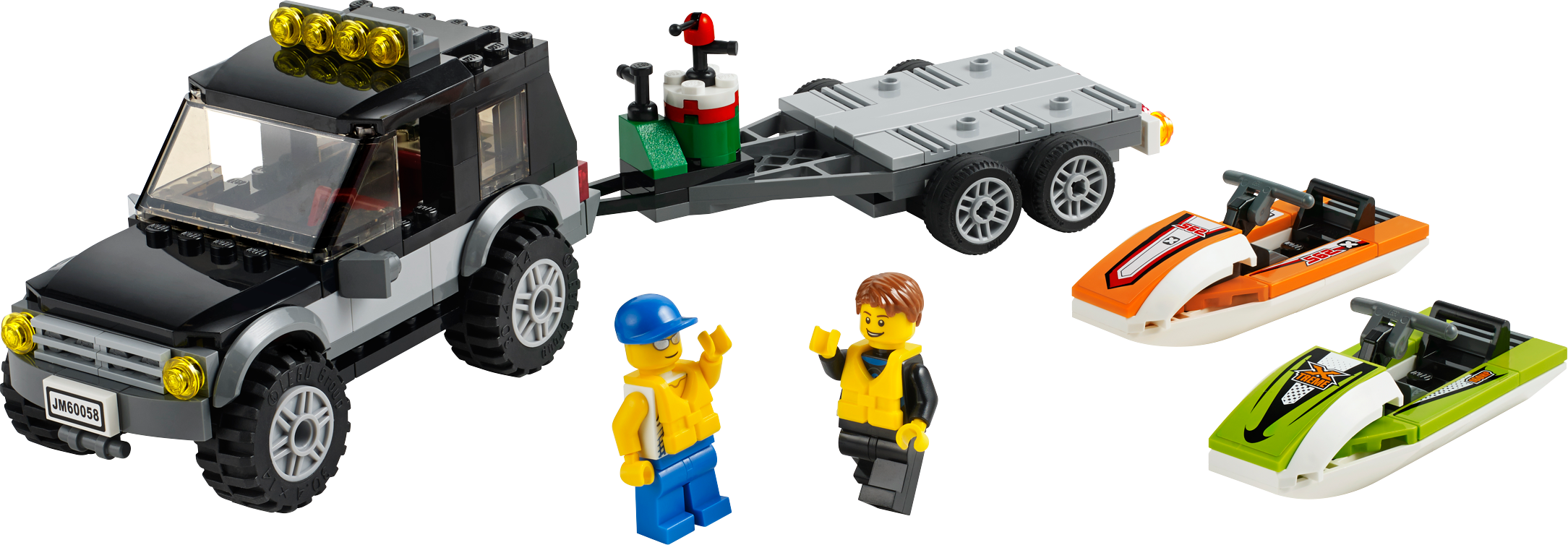 Jump in the SUV and cruise down to LEGO® City beach for some watercraft action! Back the trailer up, fill up the watercraft with gas then launch them into the water and get ready to jump the waves! Collect this and all the other vehicles in the Great Vehicles range! Includes 2 watercraft racer minifigures with assorted accessories.