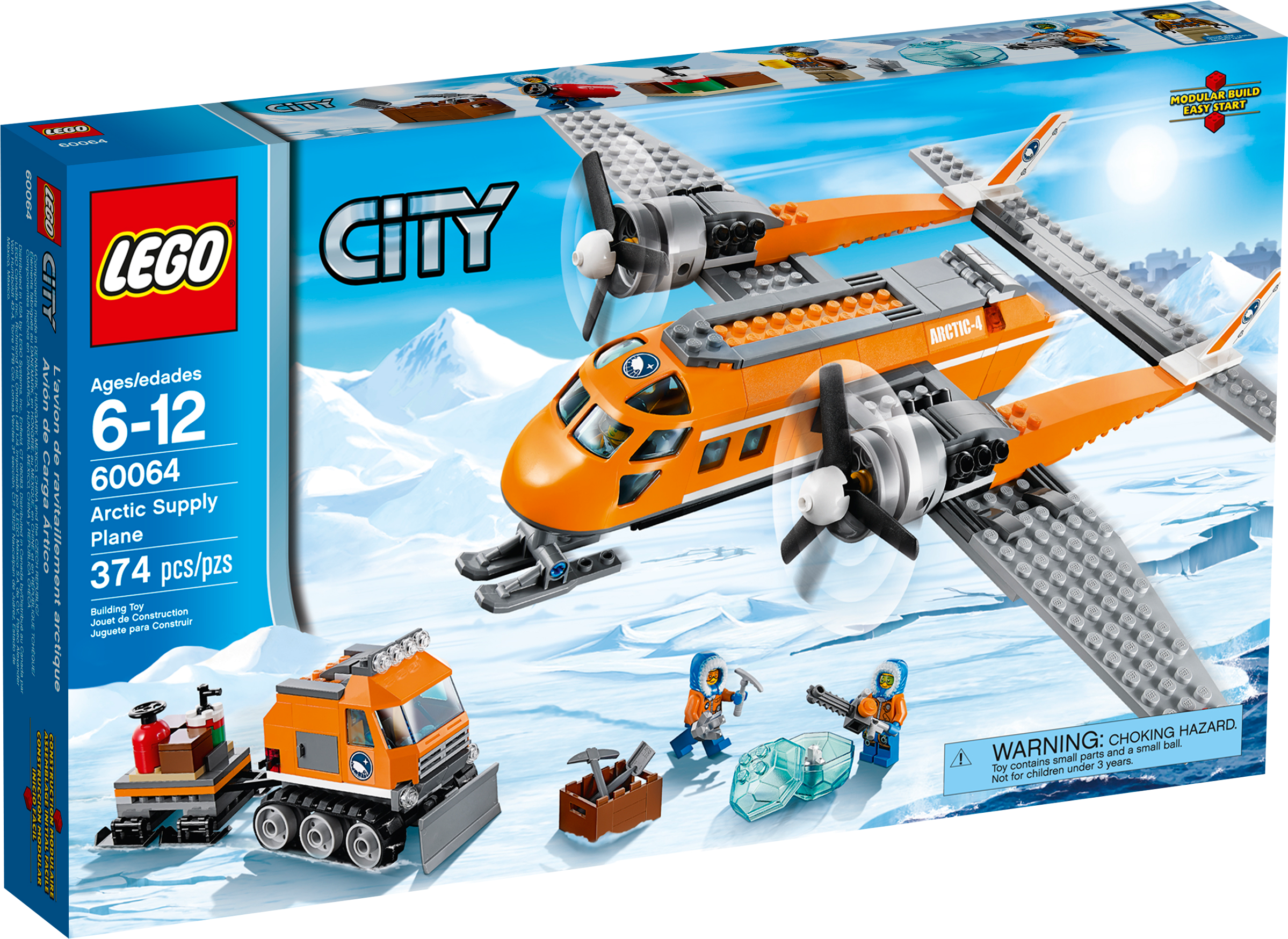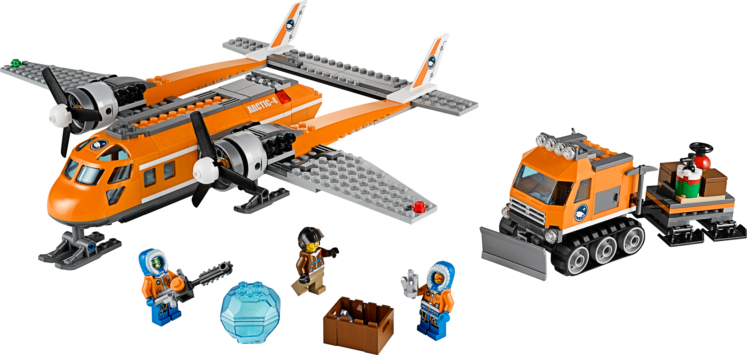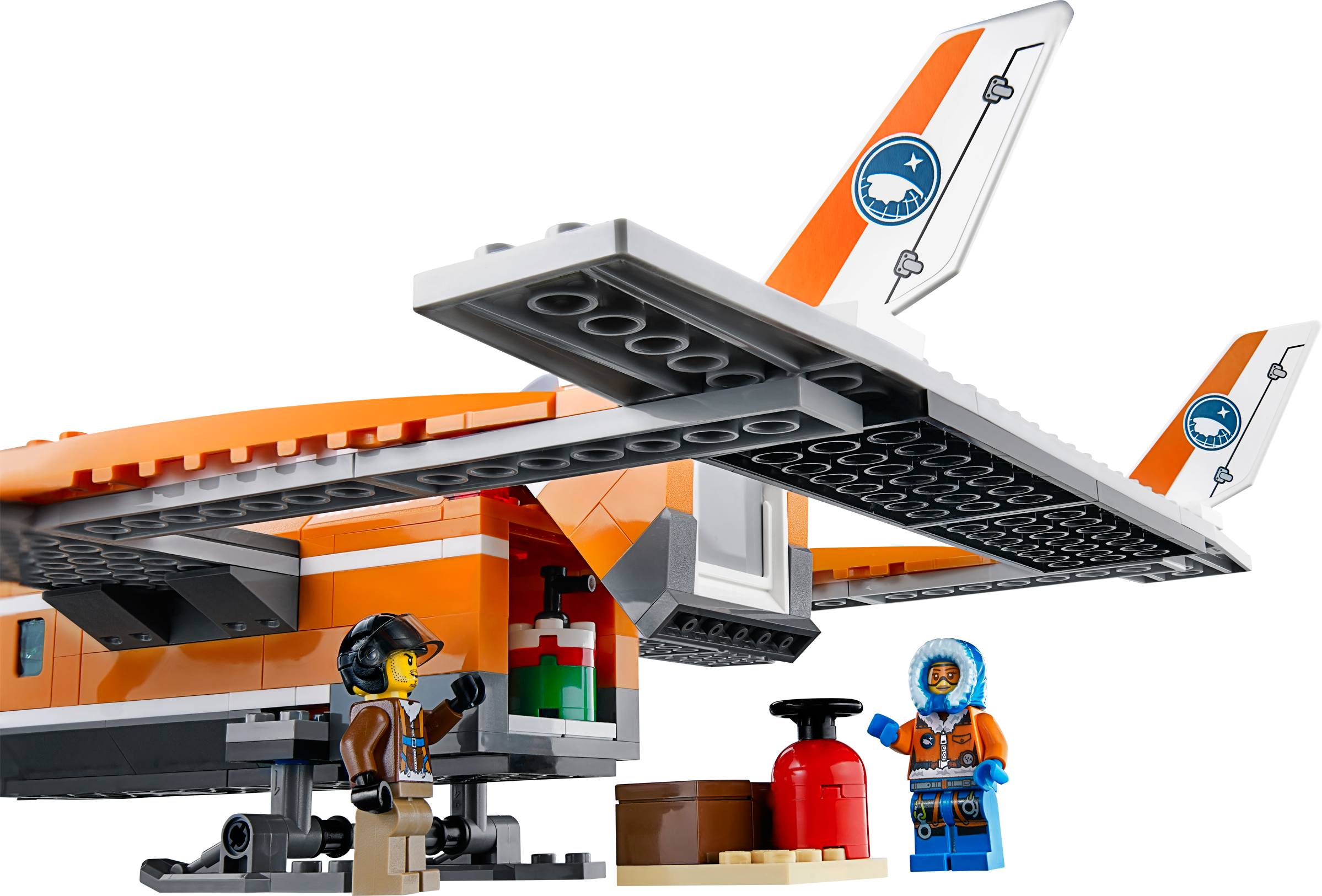 Fly out supplies to the explorers with the LEGO® City Arctic Supply Plane! Fly out important supplies to the explorers in the ice-cool LEGO® City Arctic Supply Plane! This aircraft features an opening dual cockpit with computer dashboard, 2 huge spinning propellers, an opening rear cargo compartment and skis for a smooth landing. On the ground, load the pallet containing the gas cylinder, oil drum and boxes onto the trailer and clip onto the powerful utility vehicle. Equipped with many lights, cool rubber tracks, a huge snow-moving shovel plus two small trunks for tools, this vehicle can cope with the harshest Arctic conditions to transport the cargo to base camp. Includes 3 minifigures: 2 explorers and a pilotArctic Supply Plane features an opening dual cockpit with computer dashboard, 2 huge spinning propellers, opening rear cargo compartment and skisUtility vehicle features an opening driver’s cabin, lights, rubber tracks, large front snow shovel, 2 small trunks, pickaxe and coffee mug, plus a detachable trailer with skisAlso includes a pallet with 2 boxes, gas cylinder and an oil drum, a chainsaw, translucent blue ice block with a crystal and a box with a crystal elementAccessories include Arctic explorer hoodsPlace 2 minifigures at the controls in the dual cockpitSpin the rotors and launch into the skyMake a smooth landing on the skisUnload the cargo onto the utility vehicle’s trailer and drive to base camp!Arctic Supply Plane measures over 3” (9cm) high, 12” (32cm) long and 15” (39cm) wideUtility vehicle measures over 3” (8cm) high, 3” (9cm) long and 2” (6cm) wideTrailer measures over 1” (4cm) high, 3” (9cm) long and 2” (5cm) wideCombine with the 60036 Arctic Base Camp for the ultimate Arctic research and discovery mission