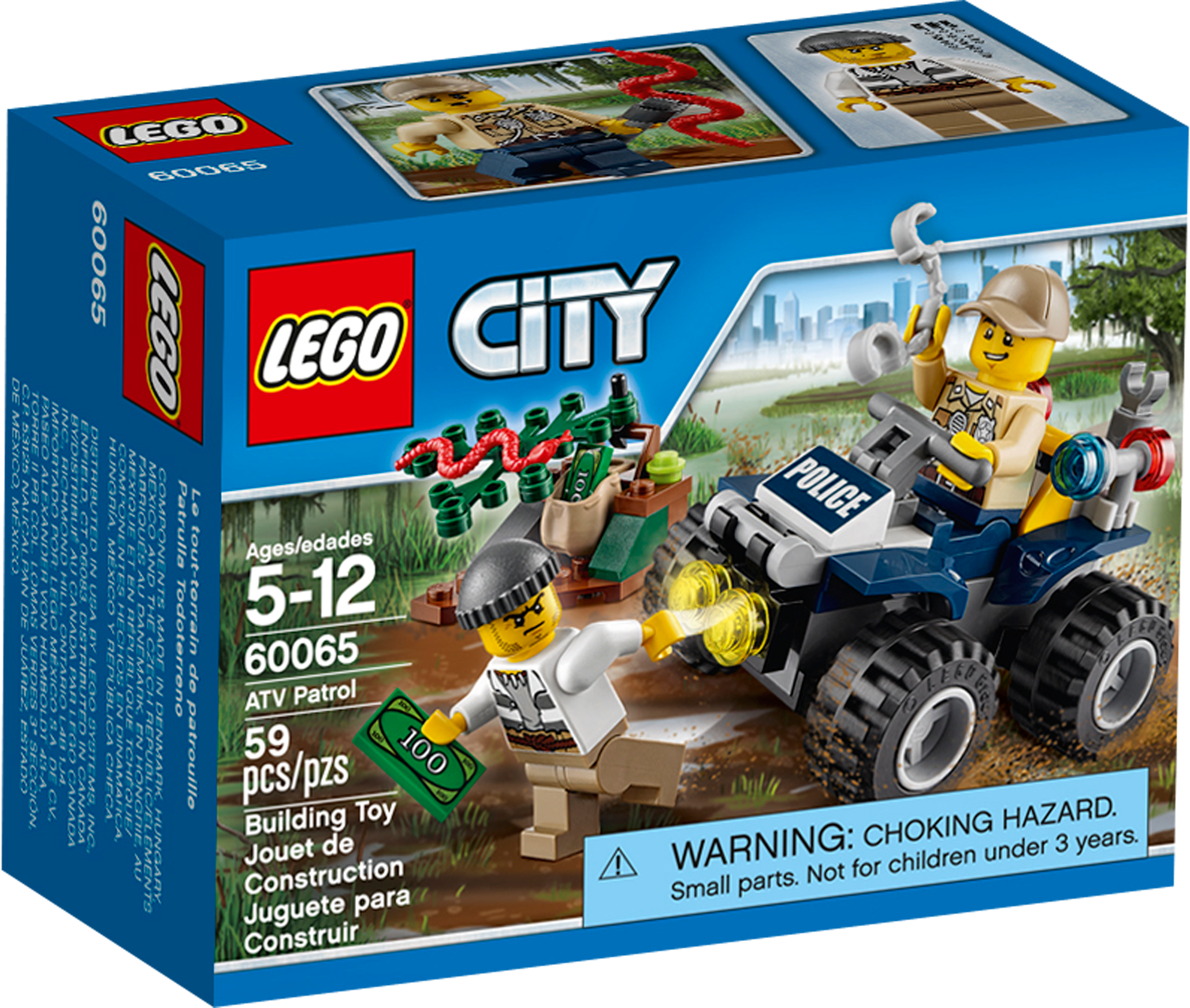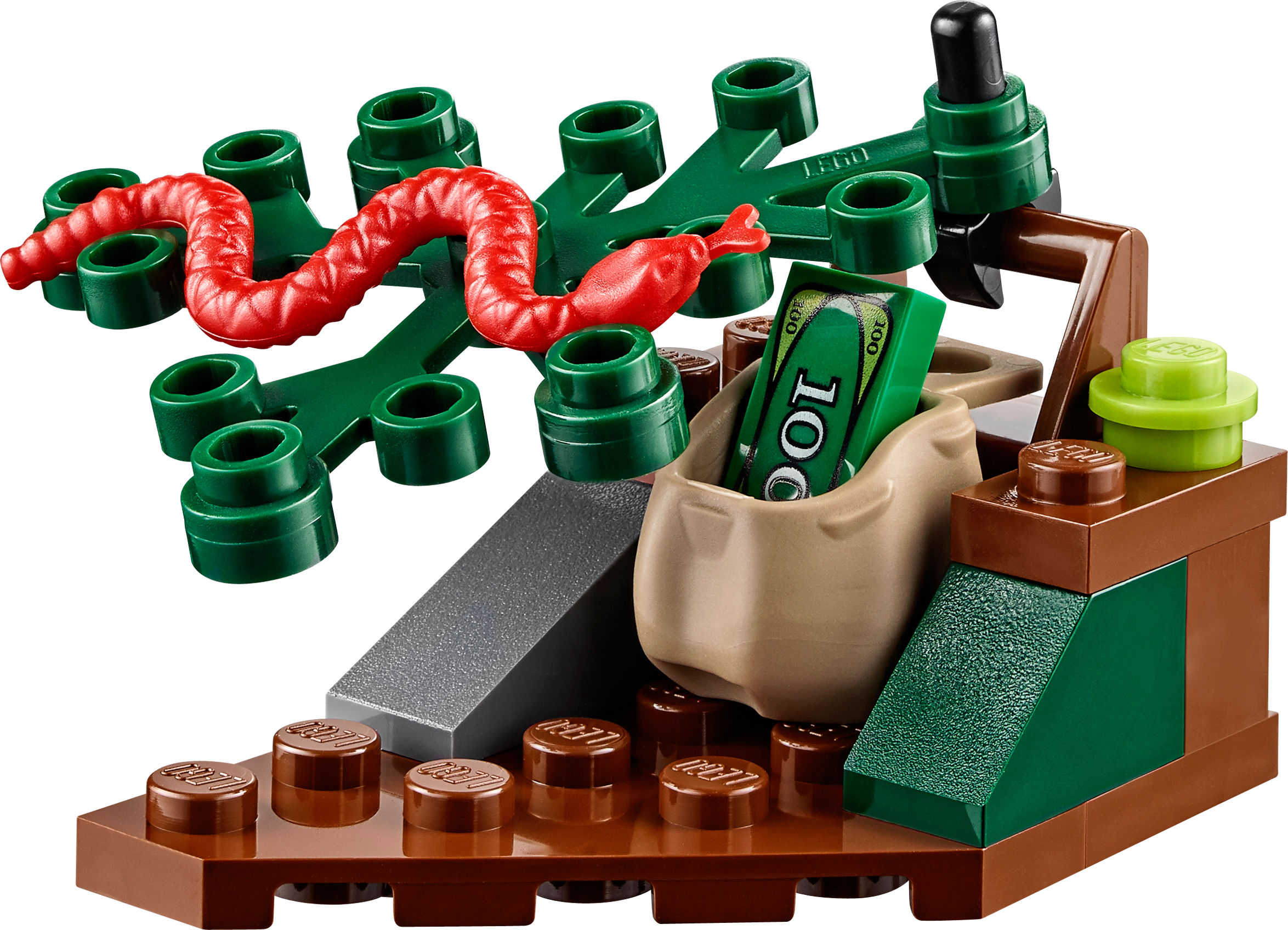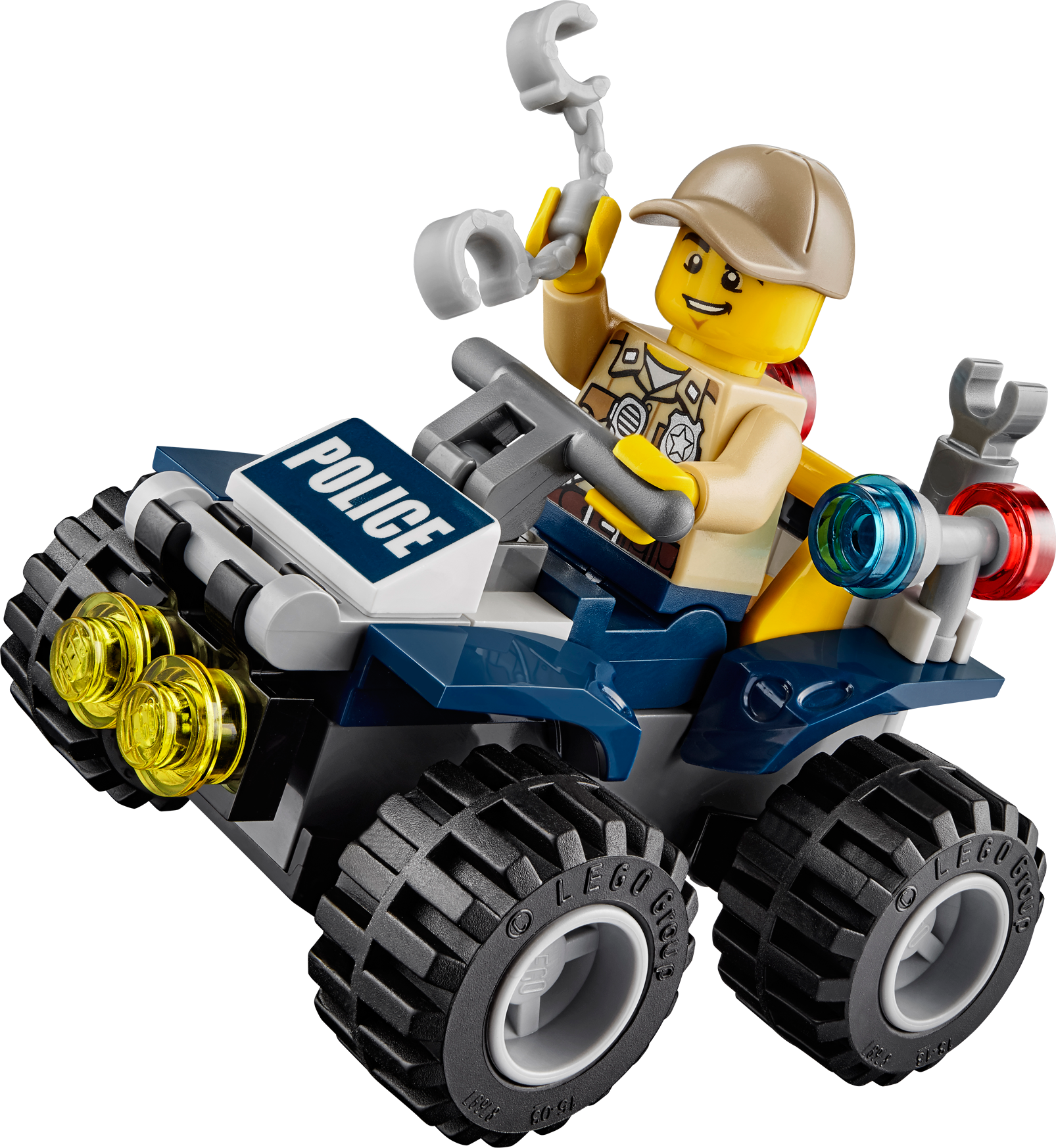 Grab the snake and catch the crook! Help… there’s a snake! The crook is busy hiding a backpack full of loot in the swamp when a long, slippery snake appears! Jump aboard the awesome ATV and race to the scene! Help the police officer catch the snake with the long snake grabber, then slap the handcuffs on the trembling crook! Includes 2 minifigures with assorted accessories: a police officer and a crook. Includes 2 minifigures with assorted accessories: a police officer and a crook Features a police ATV, a hideout and a snake Accessories include a backpack, 2 banknotes, handcuffs, snake catcher and a snake grabber Jump aboard the awesome ATV Grab the slippery snake Slap on the handcuffs! ATV measures over 1” (4cm) high, 2” (6cm) long and 1” (4cm) wide