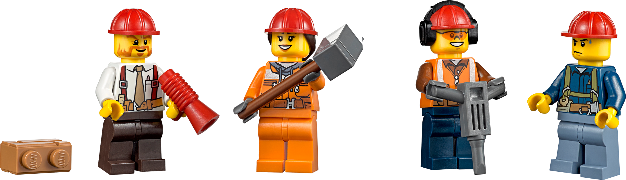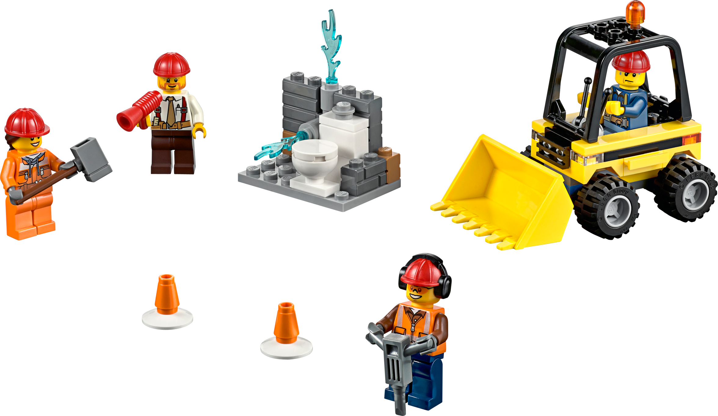 Join the demolition experts in LEGO® City! Join the demolition experts! The demolition of a derelict building is near completion, and with only a small part of the bathroom remaining it’s time to finish off the job! Operate the powerful jackhammer, swing the heavy sledgehammer, then jump aboard the awesome front loader and scoop up the rubble and remaining debris. What a busy day! Includes 4 minifigures with assorted accessories: 3 demolition workers and a foreman. Includes 4 minifigures with assorted accessories: a foreman and 3 demolition workers (2 men and a woman) Features a front loader and a building section with toilet, water and pipes Accessories include 2 warning cones, jackhammer, sledgehammer and a megaphone Join the demolition experts! Operate the awesome front loader Clear the debris Front loader measures over 3” (8cm) high, 3” (10cm) long and 1” (4cm) wide