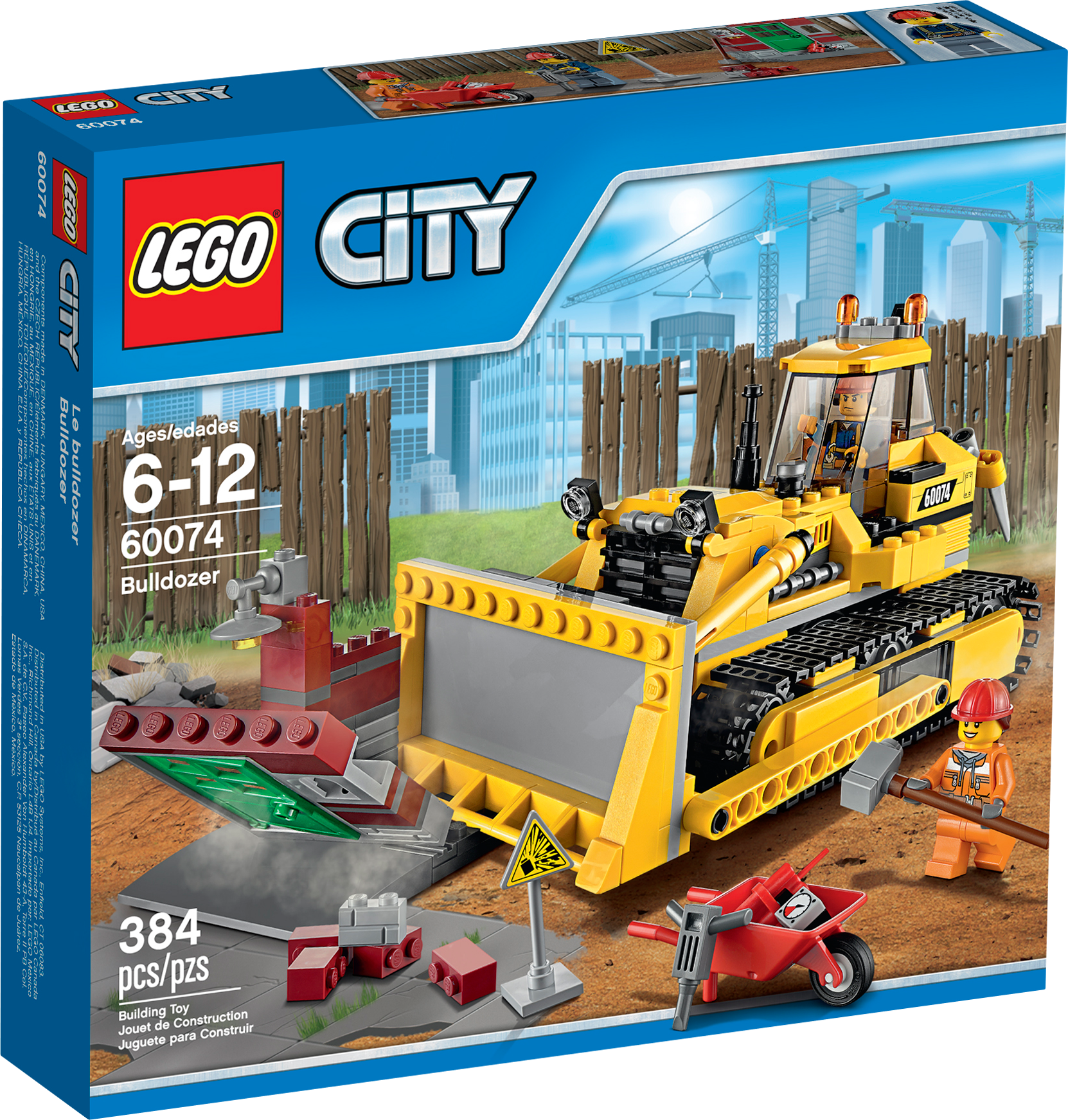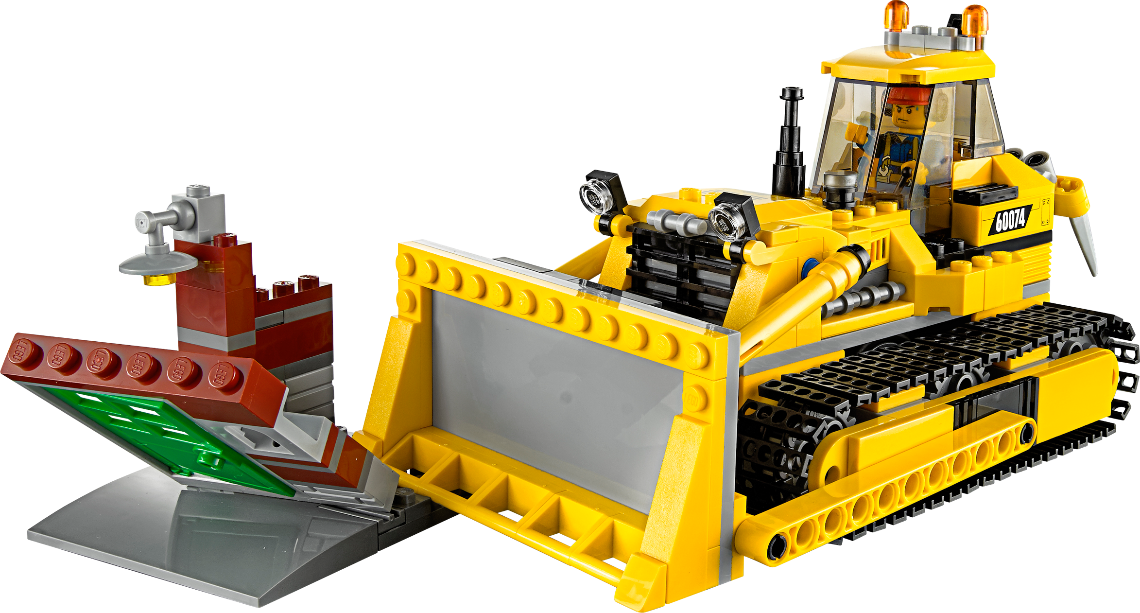 Call in the heavy-duty demolition Bulldozer! Call in the heavy-duty demolition Bulldozer! The dynamite has done its work and it’s time to demolish the remaining part of the old building to make way for new. Help the demolition experts finish off the job. Jump aboard the powerful bulldozer with its huge, moving blade and ripper, and tear down the remains of the old building! When you’re done, help the experts to clear up the rubble using the bulldozer’s powerful blade! Includes 2 demolition worker minifigures with assorted accessories: a man and a woman. Includes 2 demolition worker minifigures with assorted accessories: a man and a woman Features a bulldozer with movable blade and ripper, and a building section Accessories include 2 dynamite sticks, jackhammer, hammer, sign, wheelbarrow, chain, loose bricks and ear defenders Call in the heavy-duty bulldozer Clear away the rubble Get the job done! Bulldozer measures over 3” (10cm) high, 7” (19cm) long and 4” (11cm) wide