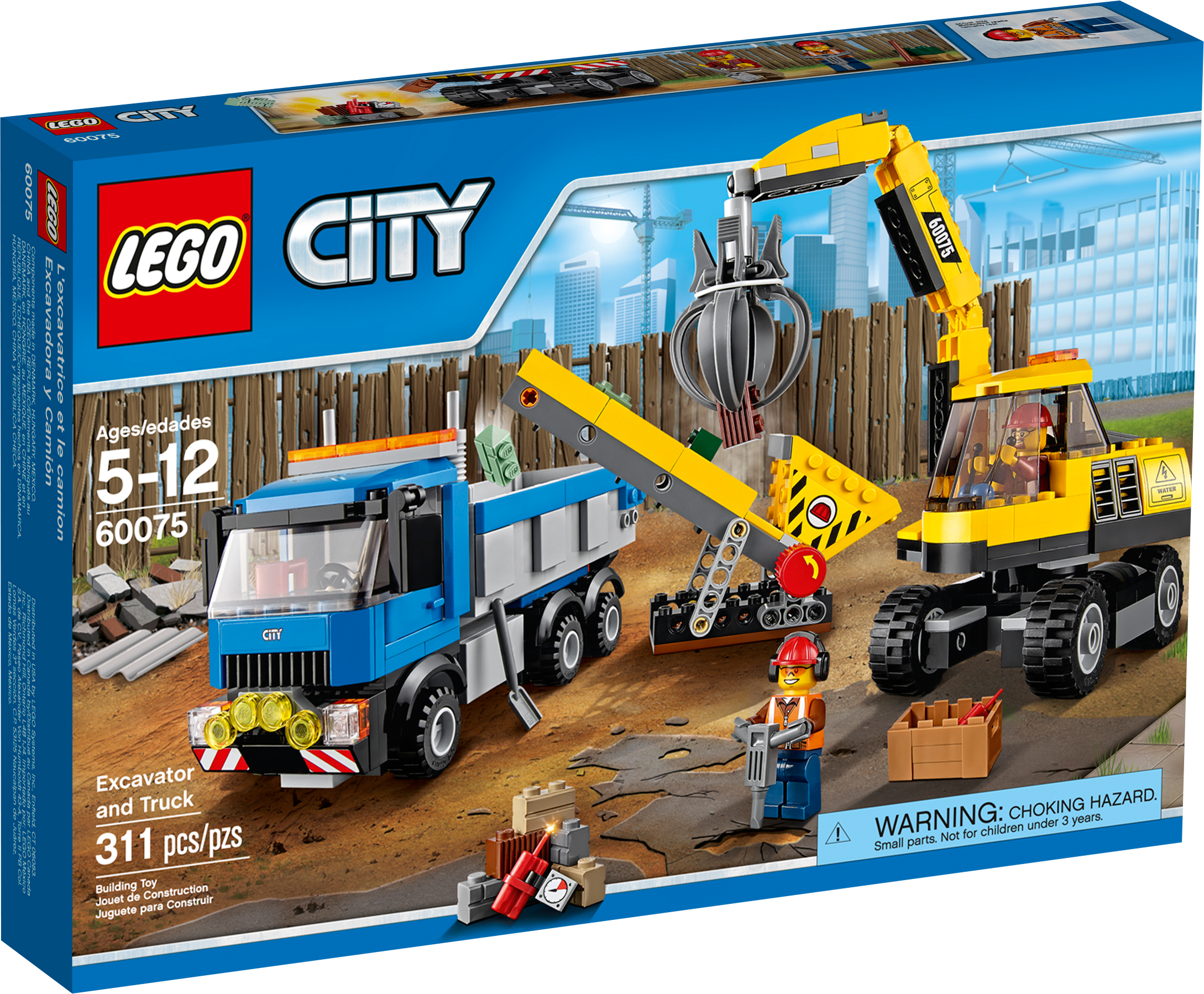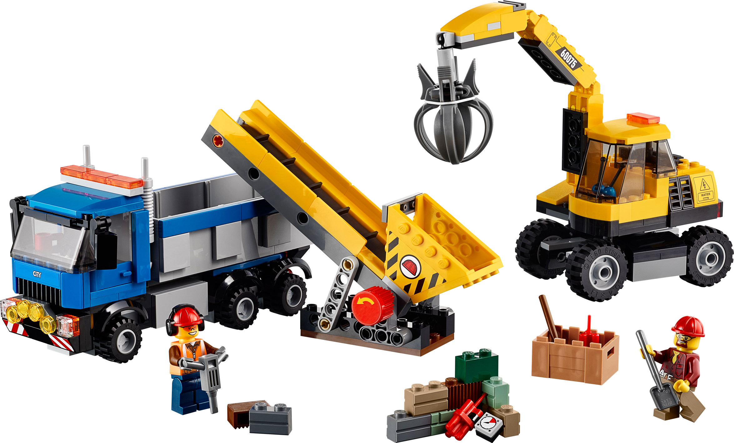 Get the job done with the demolition Excavator and Truck! Make way for the new building! The dynamite has done its work and the demolition experts are busy cleaning up the site. Help the experts operate their machines. Climb aboard the powerful excavator, grab the heavy rubble with the claw and drop it onto the conveyor. Activate the conveyer to move the rubble into the truck’s cargo bed, ready for transportation to the recycling plant. Just another day for the demolition experts! Includes 2 demolition worker minifigures with assorted accessories. Includes 2 demolition worker minifigures with assorted accessories Features an excavator with moving boom and claw, working conveyor belt and a truck with tipping bed and opening tailgate Accessories include a broom, shovel, jackhammer, rubble and 2 dynamite sticks Operate the powerful excavator Activate the conveyer belt Tip the huge truck bed! Excavator measures over 6” (16cm) high, 5” (15cm) long and 2” (6cm) wide Truck measures over 3” (9cm) high, 6” (17cm) long and 1”(5cm)wide Conveyer measures over 3” (8cm) high, 5” (13cm) long and 2” (6cm) wide