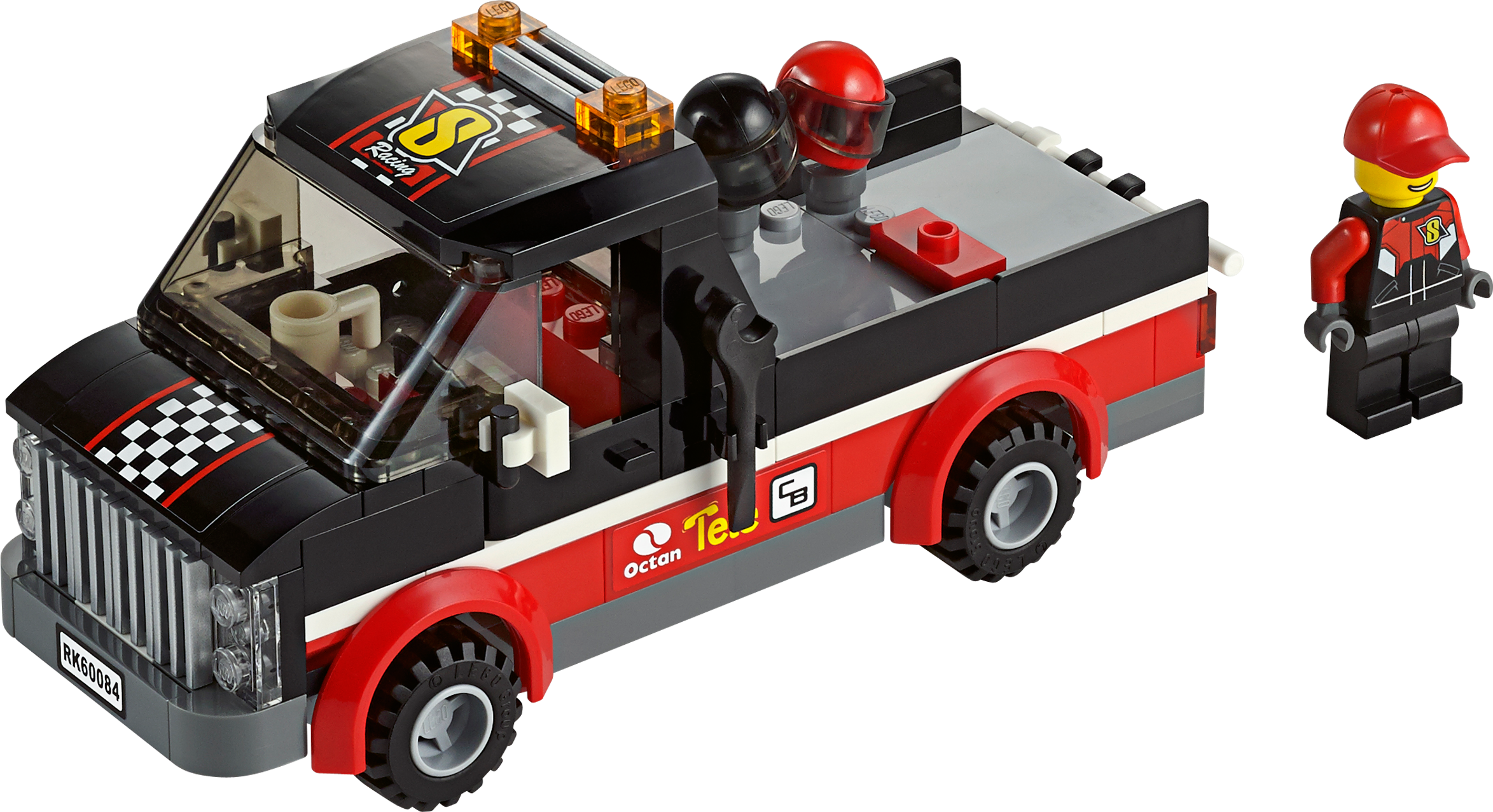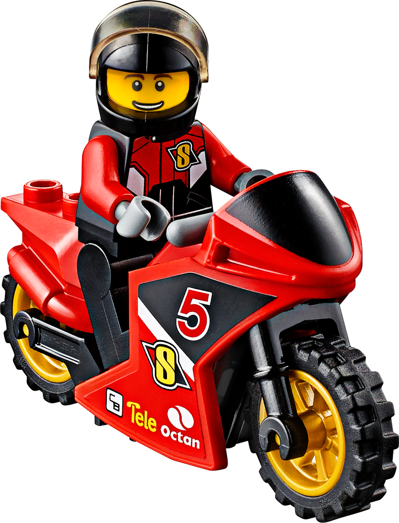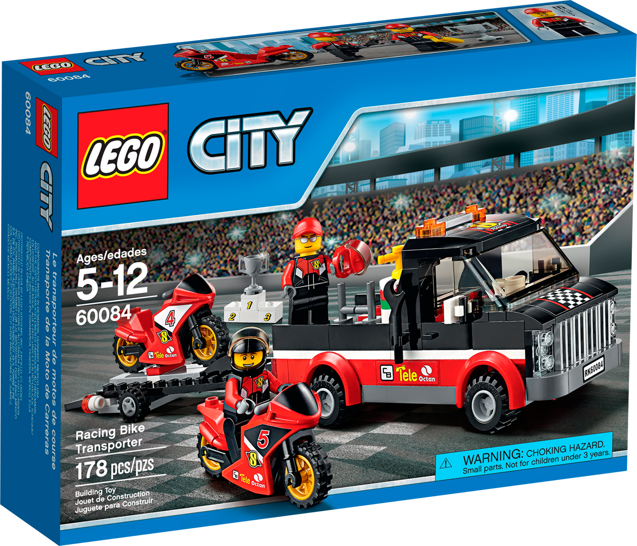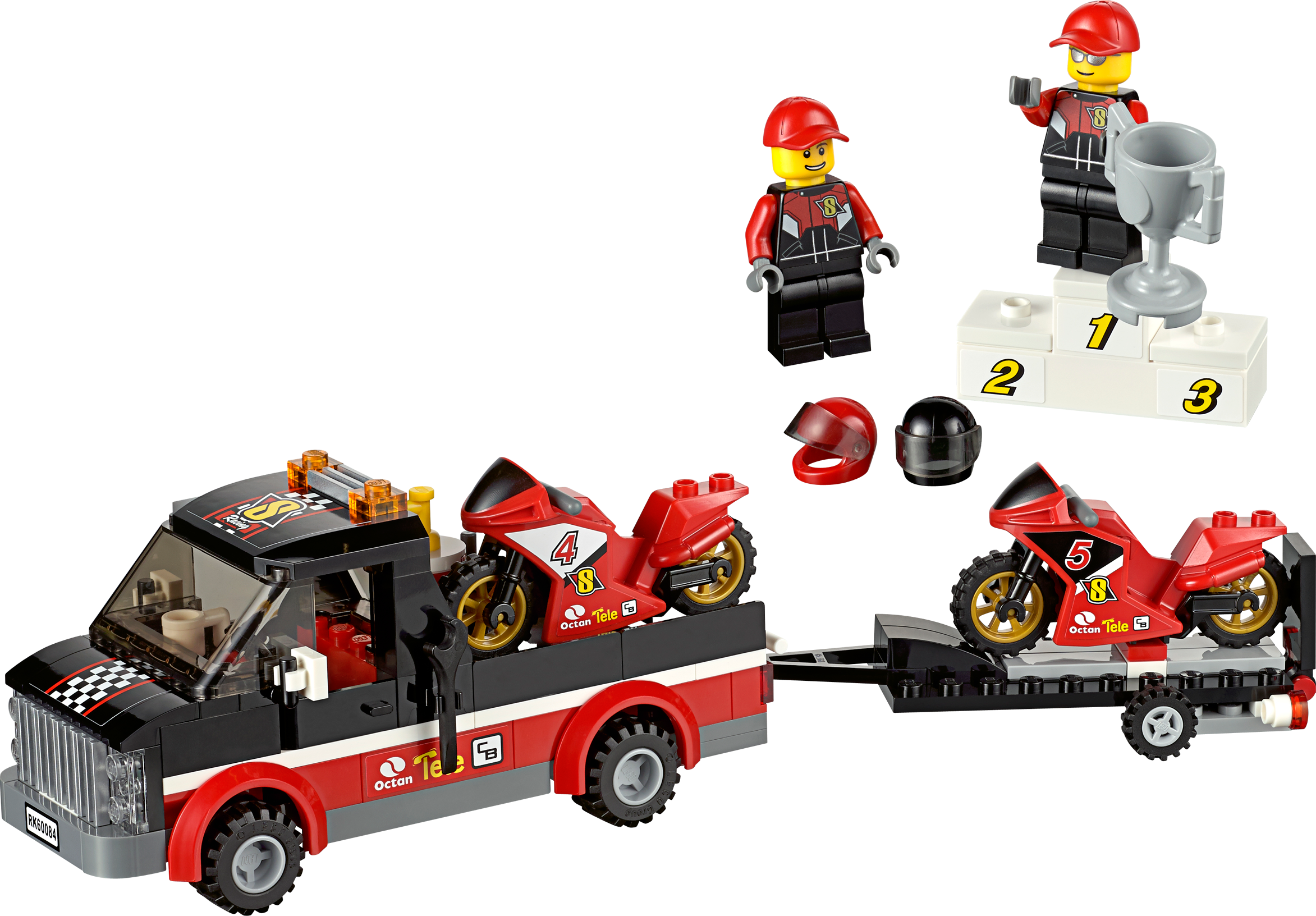 The LEGO® City motorbike race team is heading to the stadium for the final race of the motorbike championships! Join the ace riders aboard the awesome Racing Bike Transporter together with their high-speed race bikes. When you arrive at the stadium, help unload the bikes and head for the circuit. The crowd is ecstatic, it’s going to be a heck of a race! Who will take top spot on the podium and lift the championship trophy? Includes 2 race driver minifigures with assorted accessories.