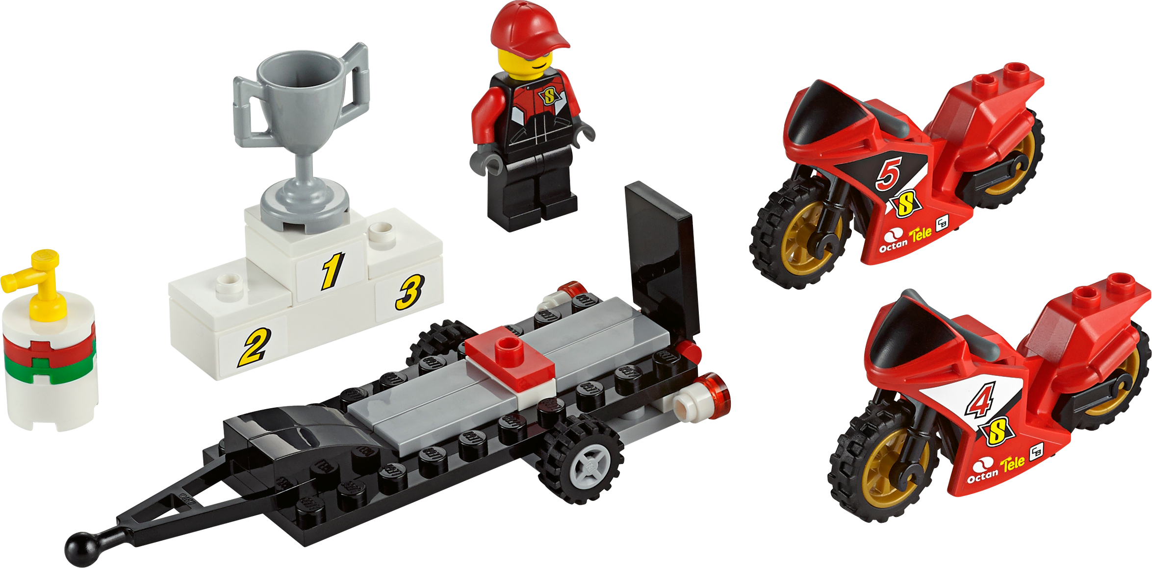 Features a pickup with ramp, trailer with folding ramp, 2 race bikes, podium and a trophy