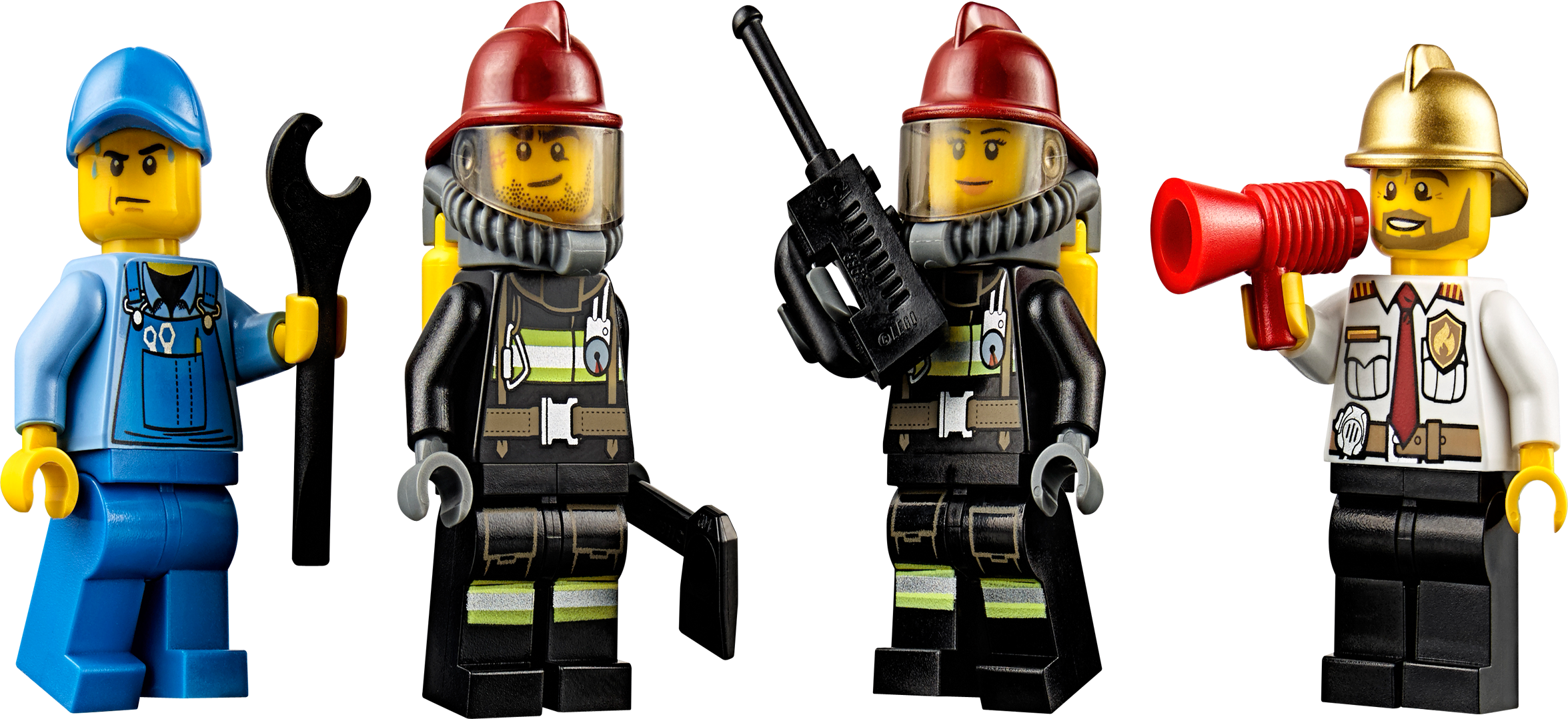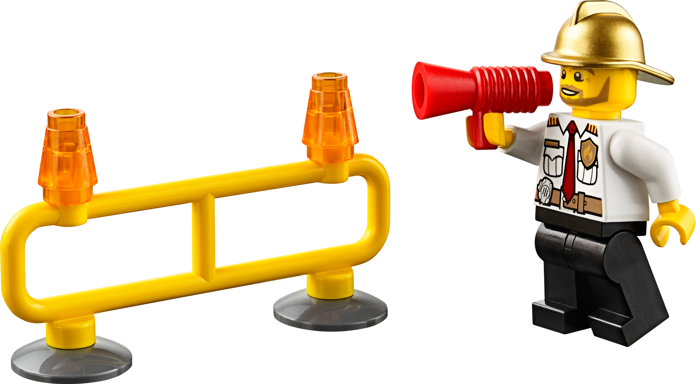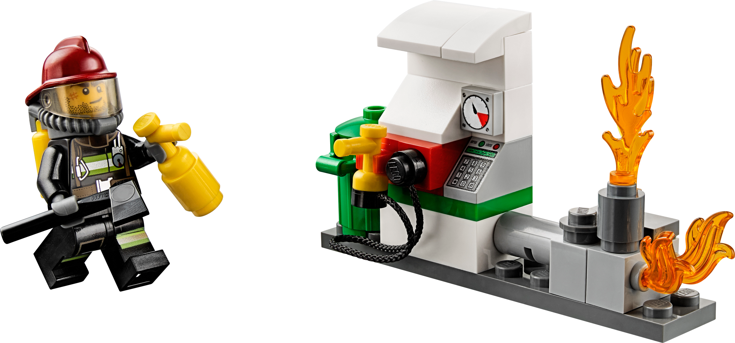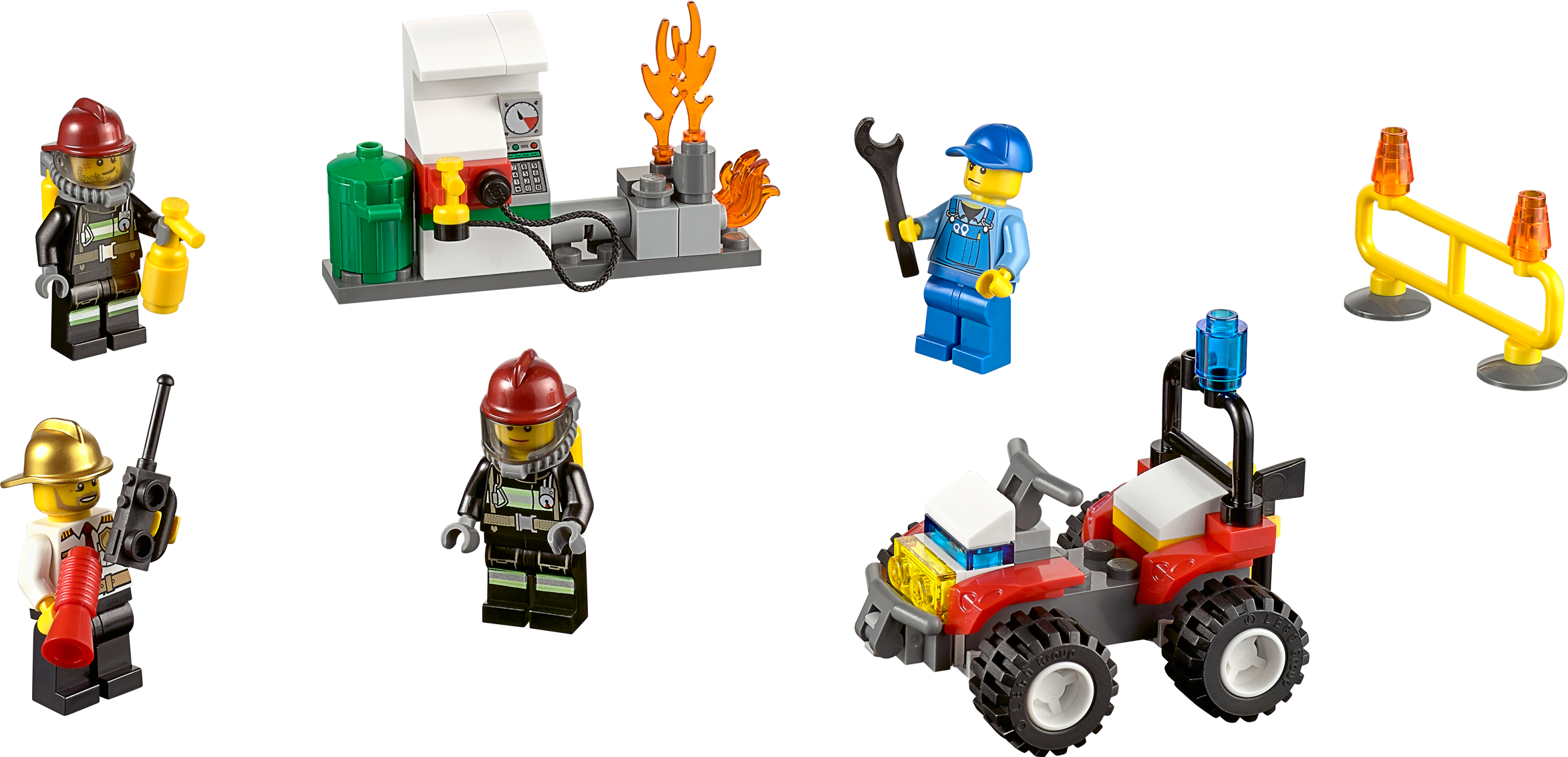 Join the firefighters at the gas station blaze! Help! The pump attendant has been trying to mend the broken fuel pump, but something’s gone wrong and the pipeline is on fire! Grab the fire extinguisher and help the firefighter race to the scene on the super-fast fire ATV. Set up a traffic diversion, help the firefighters tackle the blaze and save the day! Includes 4 minifigures with assorted accessories: a pump attendant, 2 firefighters and a fire chief. Includes 4 minifigures with assorted accessories: a pump attendant, 2 firefighters and a fire chief Features a fuel pump, pipe with flames, and a fire ATV Accessories include a barrier, megaphone, wrench, axe, 2 fire extinguishers and a walkie-talkie Call the firefighters Race to the scene on the super-fast fire ATV Extinguish the flames! Fire ATV measures over 1” (4cm) high, 2” (7cm) long and 1” (4cm) wide