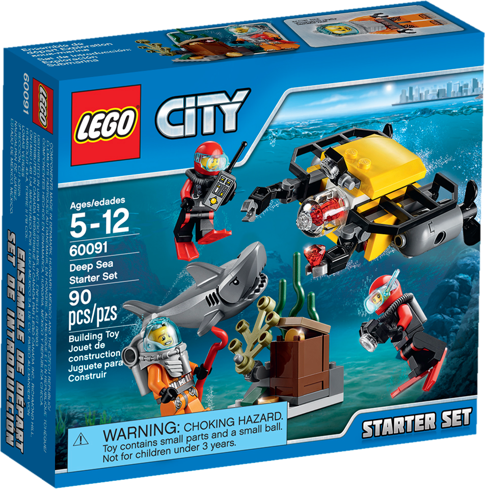 Explore the ocean’s depths with the Deep Sea Starter Set! Join the LEGO® City deep-sea explorers on their search for lost treasure with the Deep Sea Starter Set! The diver has spotted a mysterious chest on the seabed and needs your help to free it from the seaweed. Take control of the remote sub and use its powerful robotic arms to release the chest and reveal the secret treasures hidden inside. But watch out for the snappy shark lurking in the dark water! Includes 3 minifigures: a deep-sea diver and 2 scuba divers. Includes 3 minifigures with assorted accessories: a deep-sea diver and 2 scuba divers Features a remote sub, seaweed and a shark Remote sub features spinning propellers and 2 movable robotic arms Accessory elements include a remote control, camera, crowbar, chest, 3 gold coins and a ruby Find the sunken treasure! Join the deep-sea exploration team Steer the sub into the depths Watch out for the snappy shark! Remote sub measures over 1” (4cm) high, 3” (8cm) long and 2” (7cm) wide