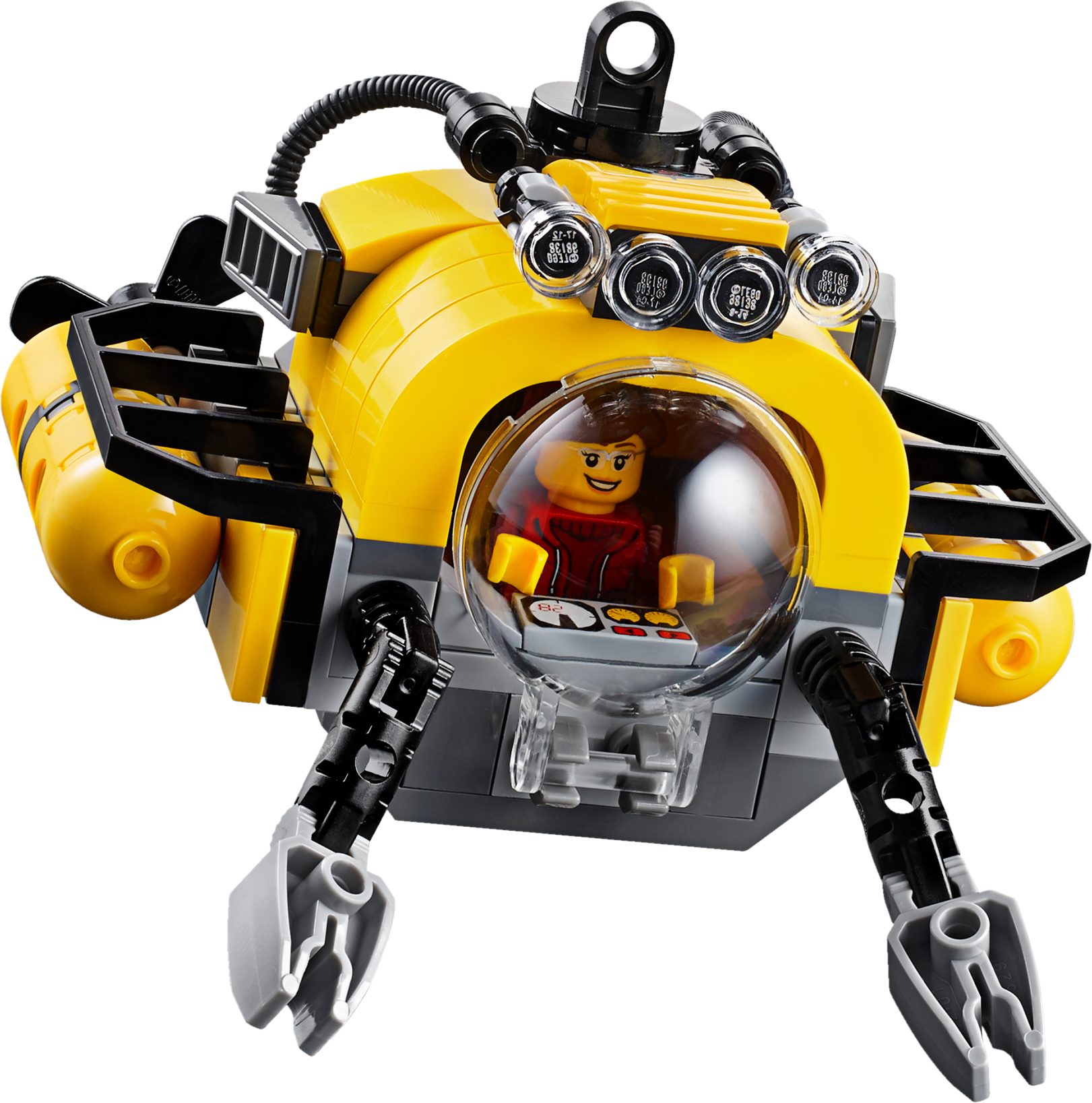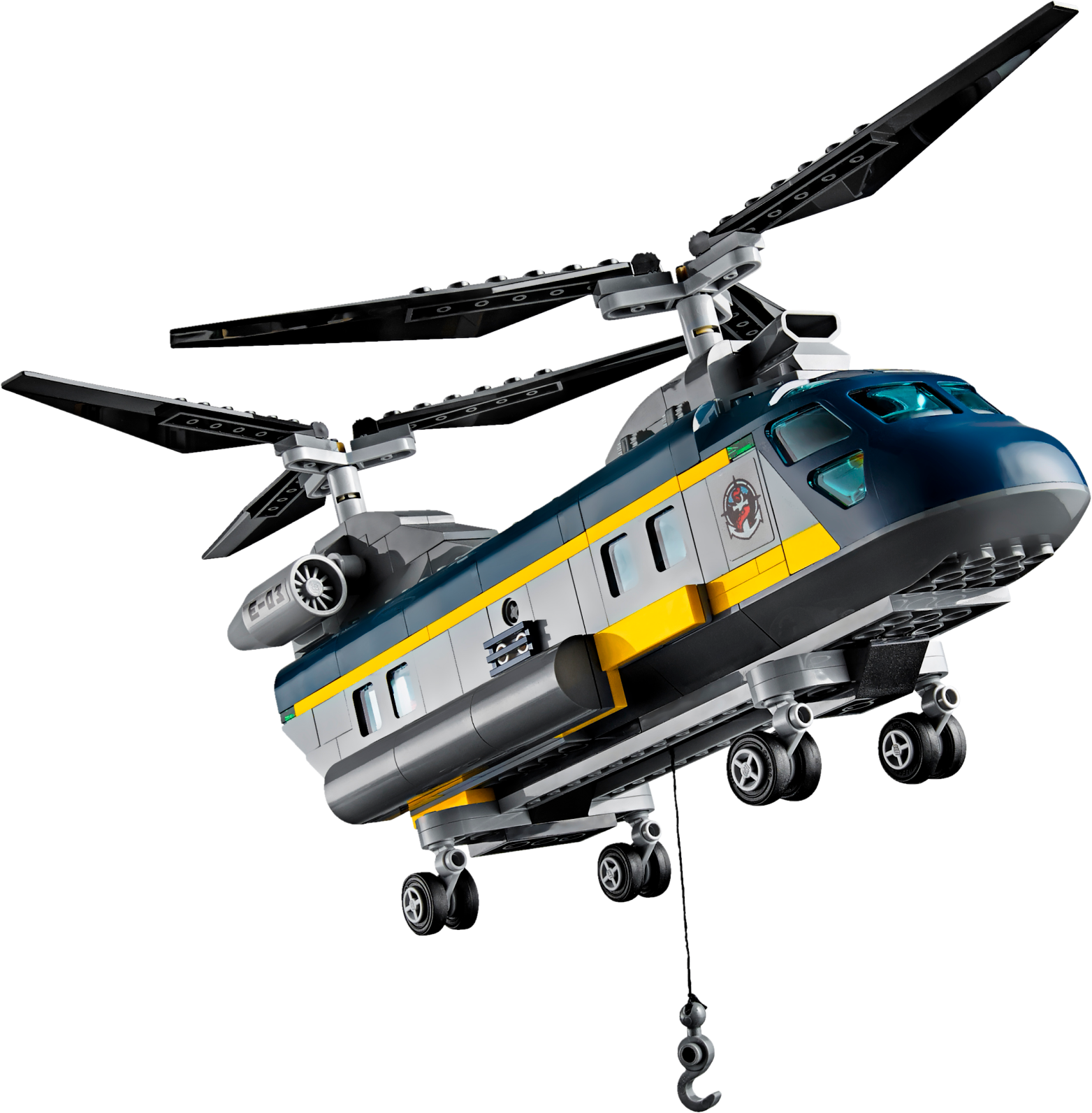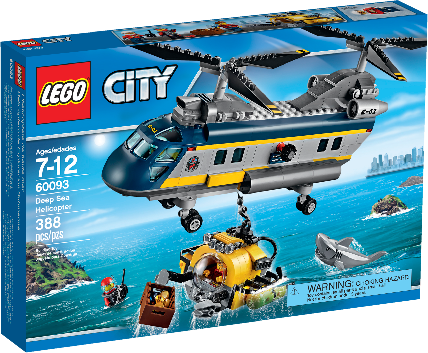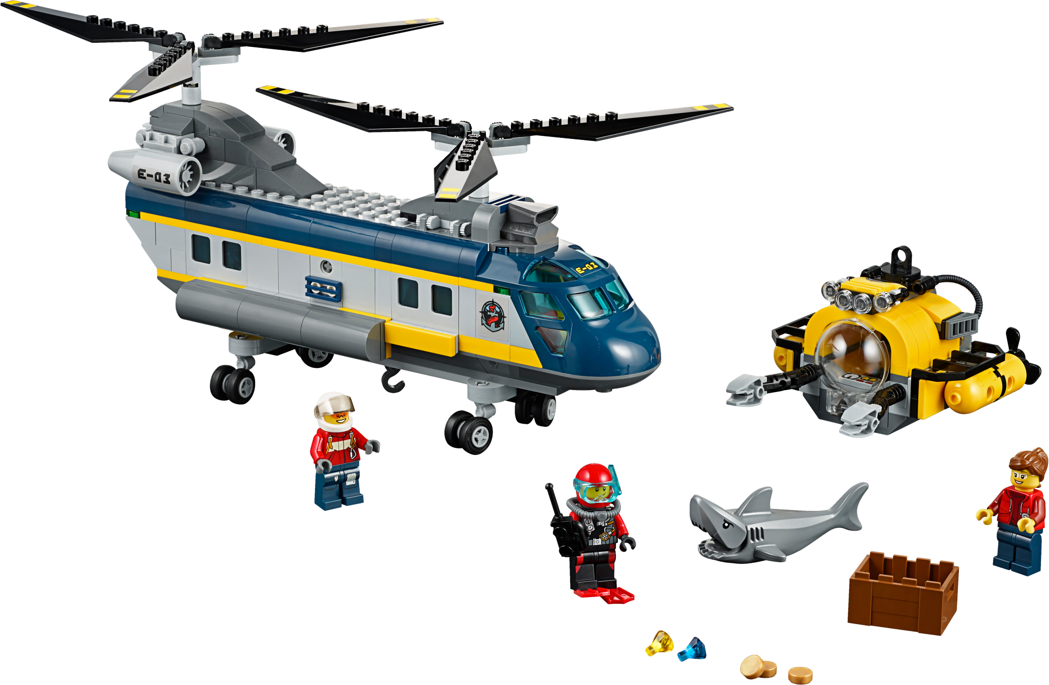 Rescue the stricken divers with the Deep Sea Helicopter! Emergency! The deep-sea explorers in their submarine are being attacked by a shark and need your help! Jump aboard the awesome Deep Sea Helicopter, spin the powerful twin rotors and thunder over the ocean at breakneck speed! When you reach the scene, lower the winch, hook up the submarine and head for the safety of land. It’s just another day for a LEGO® City helicopter hero! Includes 3 minifigures with assorted accessories: a submariner, pilot and a scuba diver. Includes 3 minifigures with assorted accessories: a submariner, pilot and a scuba diver Features a helicopter, submarine and a shark Helicopter features a large cockpit, spinning twin rotors, working winch and an opening loading bay Accessory elements include a walkie-talkie, box, 3 gold coins and a yellow and blue diamond Explore the ocean’s depths! Spin the rotors Race to the scene in the Deep Sea Helicopter! Lower the winch Hoist up the submarine! Helicopter measures over 4” (12cm) high, 9” (24cm) long and 3” (8cm) wide Submarine measures over 2” (6cm) high, 4” (12cm) long and 3” (10cm) wide