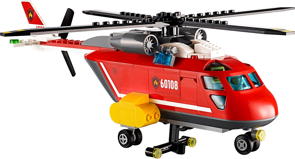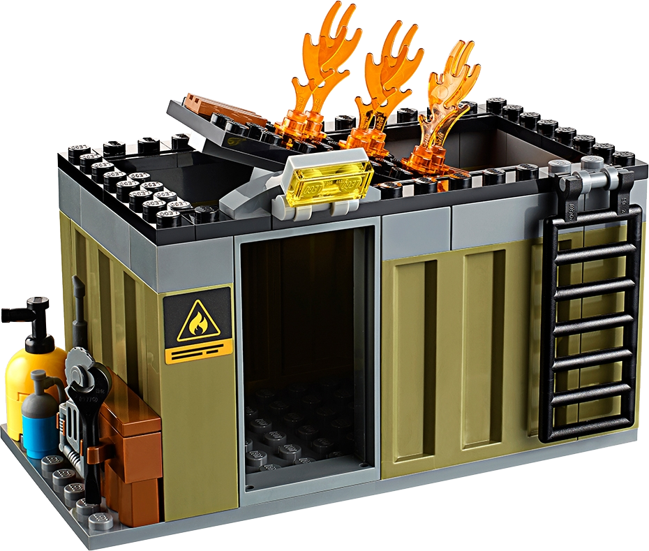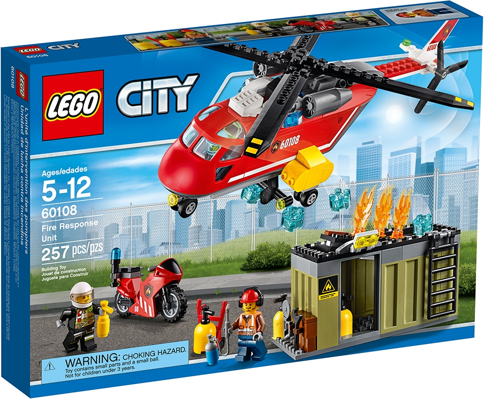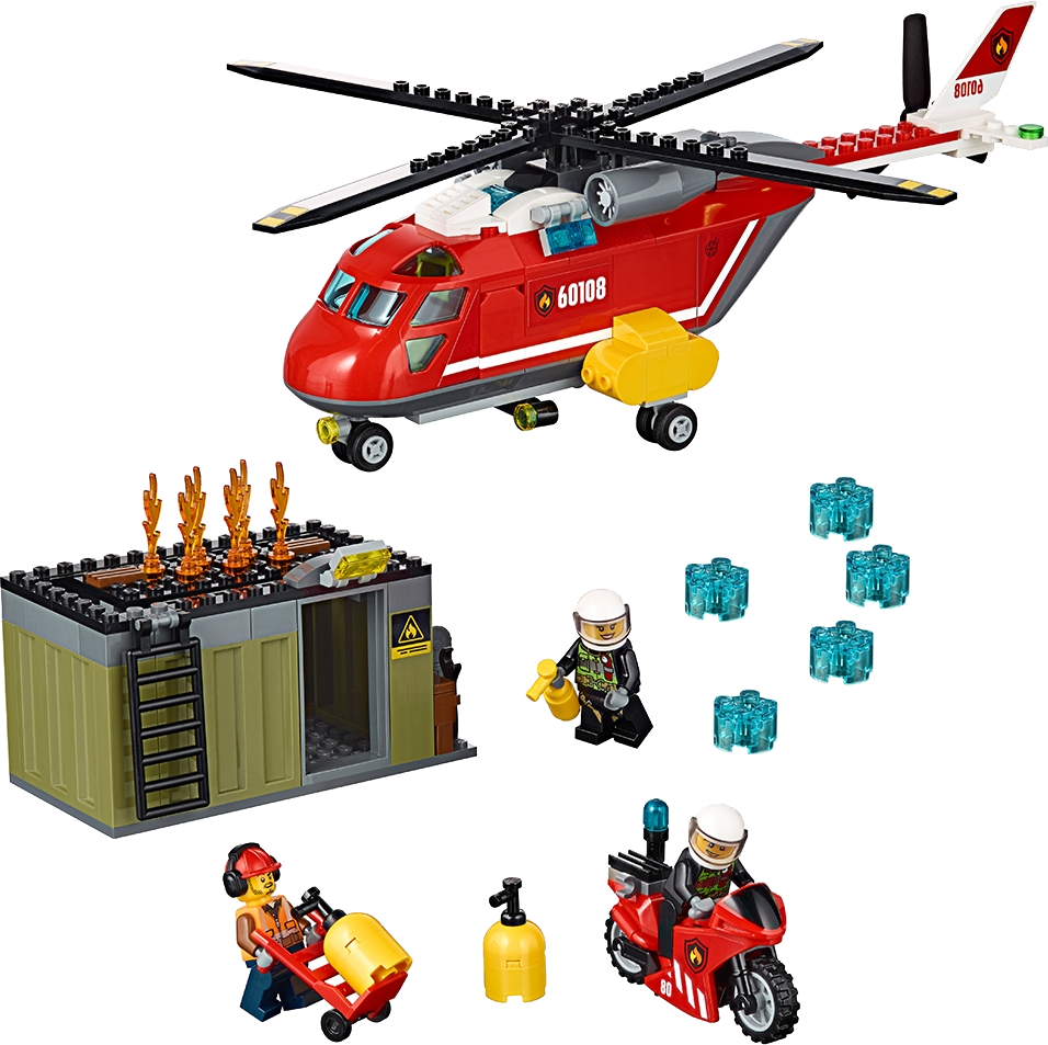 Call the Fire Response Unit for help! Race to the scene where a worker calls for help! Zoom in on your motorcycle to fight the flames. If you can't reach the fire, call in the Fire Response Unit helicopter and help the firefighters put out the container fire with a tank full of water. It’s another job well done! Includes 3 minifigures: a pilot, firefighter and a worker. Features a helicopter with rotating blades and cargo doors that open, and a motorcycle with space for a fire extinguisher. Fly the helicopter over the container to release the water elements and turn the container roof element, putting out the fire. Accessory elements include a welder, 2 gas canisters, trolley, fire extinguisher, wrench, 5 water bricks and a saw. Helicopter measures over 3” (10cm) high, 12” (33cm) long and3” (8cm) wide. Motorcycle measures over 1” (4cm) high, 2” (7cm) long and under 1” (2cm) wide. Container with flames down measures over 2” (6cm) high, 4” (12cm) wide and 2” (6cm) deep.