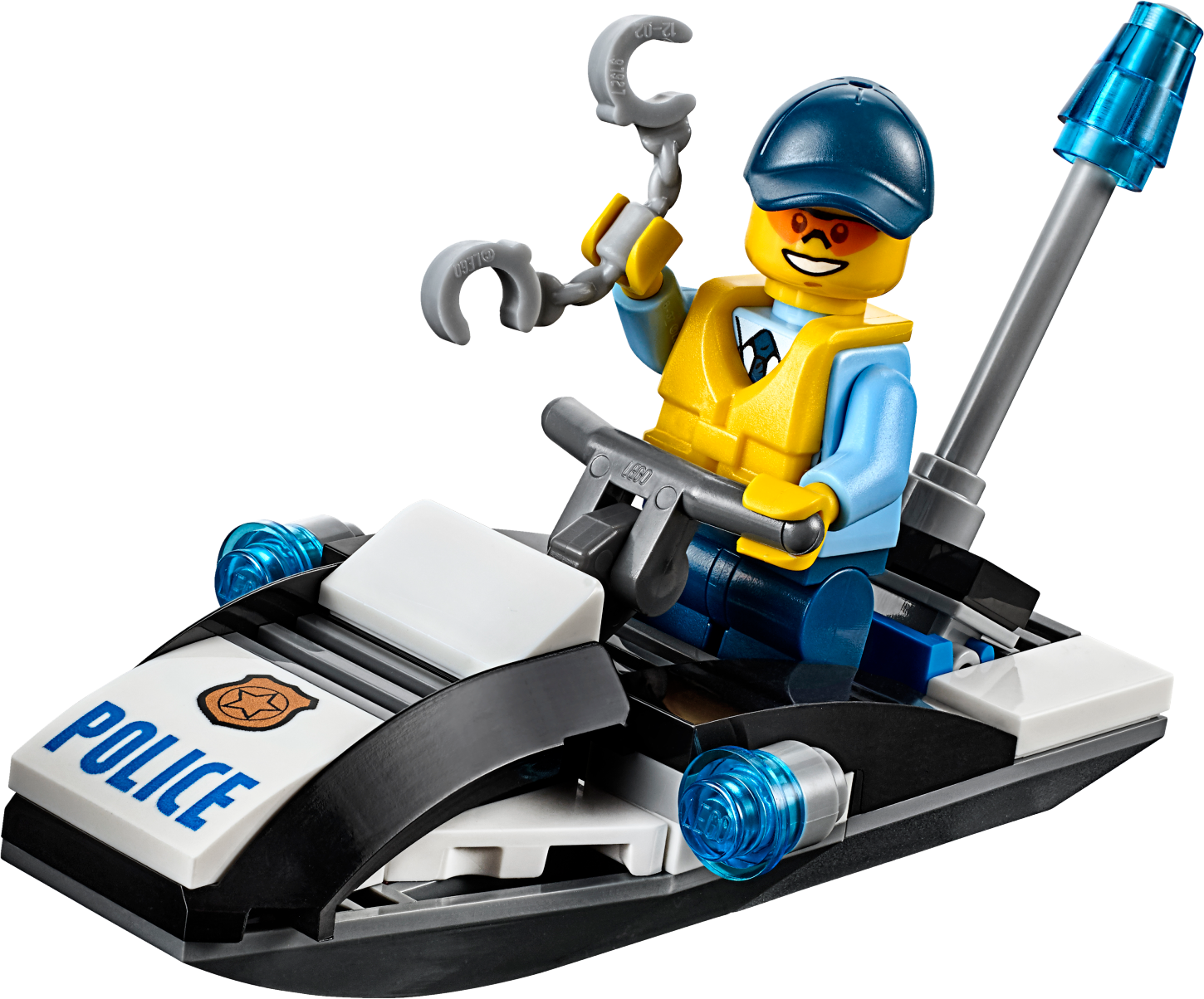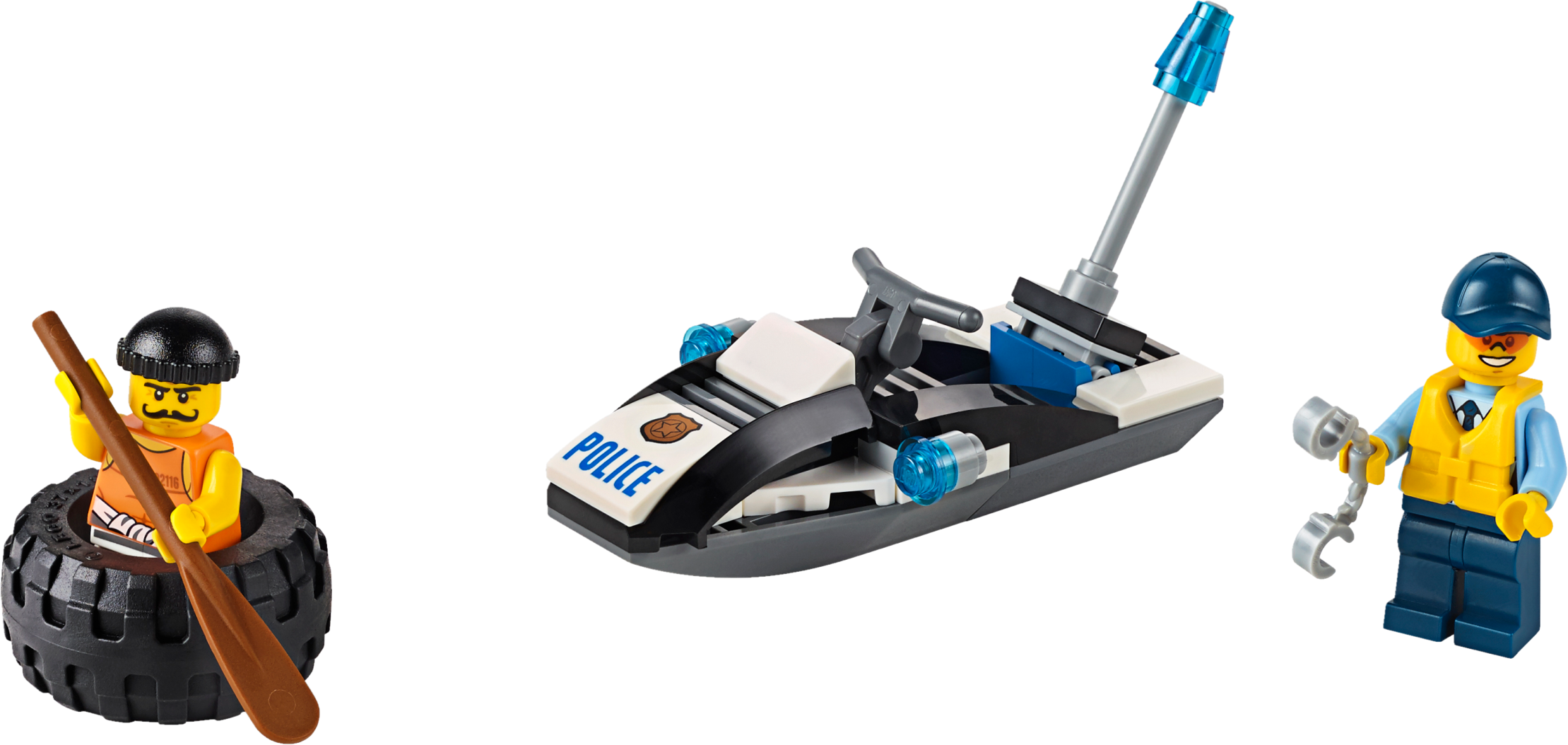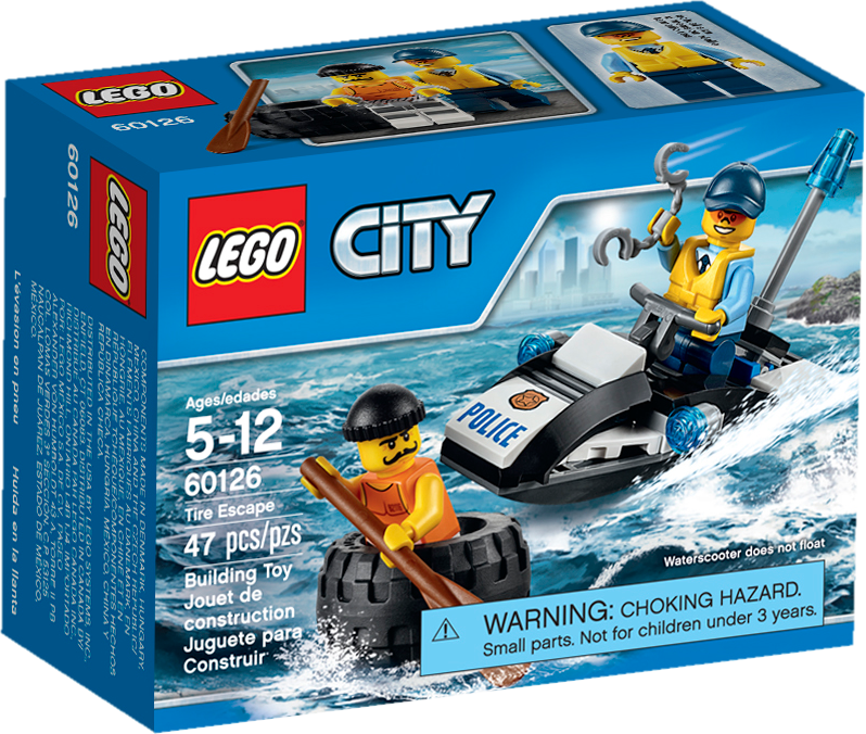 Catch the crook before he floats away! Patrol the waters of LEGO® City on the police water scooter! Respond to the call that a crook is paddling away on a tire. Race after him and catch him before he gets away, then slap the handcuffs on him and toss him back into lockup on Prison Island. Help keep the city safe!Includes 2 minifigures: a crook and a police officer.Features a police water scooter, tire and a paddle.Get on the police water scooter and keep the LEGO City waters safe.Also includes handcuffs.Police water scooter measures over 1” (5cm) high, 3” (9cm) long and 1” (3cm) wide.Tire measures over 1” (3cm) long, 1” (3cm) deep and under 1” (1cm) high.