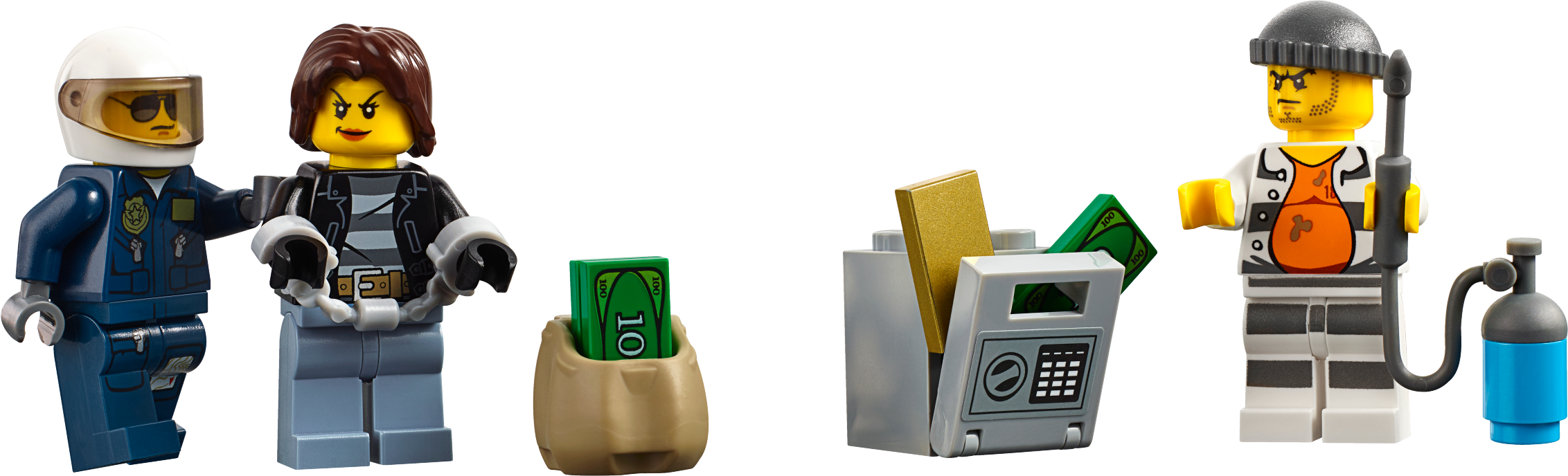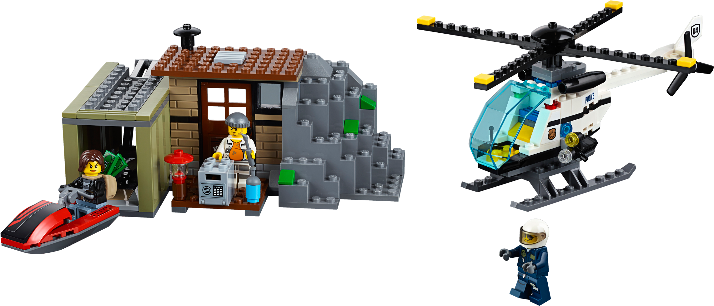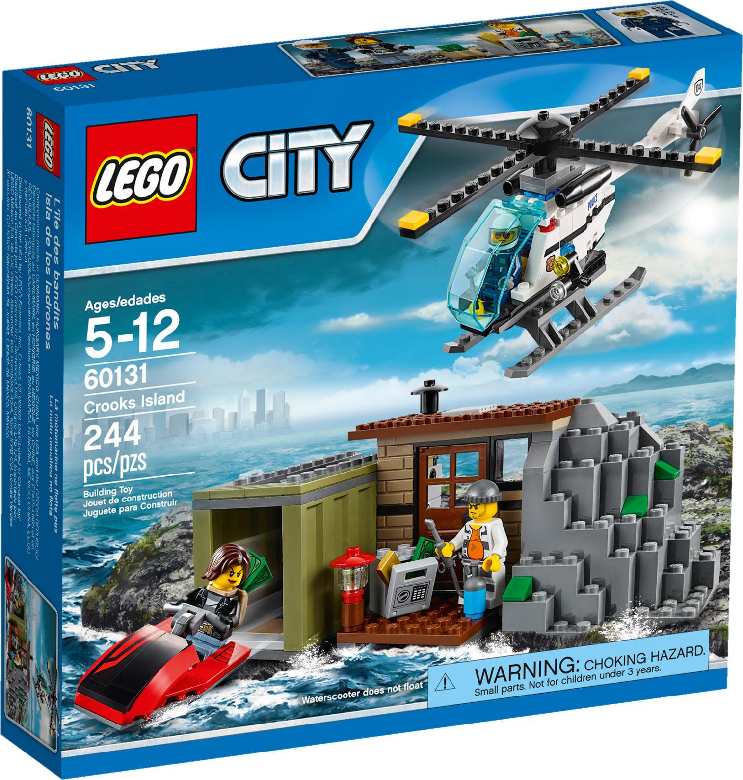 Keep your loot safe on Crooks Island! Help the crooks stash their loot in the hideout! Get the welding torch and work on the safe while your partner checks out the wanted poster to see how good you look. Wait, what’s that noise? You’d better hide the loot and make a quick getaway on the hidden water scooter before the police fly in with their helicopter and catch you! Includes 3 minifigures: a police pilot, female crook and a male crook. Crooks Island features a container hideout, police helicopter and a water scooter for the crooks. Container hideout features a rock wall hiding space and an escape launch function for the water scooter Police helicopter features spinning propellers, opening cockpit and a surveillance camera Use the welding torch to break into the safe and get the gold bar. Put the loot in the hideout’s secret stash place to keep it hidden from the police. Use the water scooter launch function in the container to escape. Accessory elements include a fireplace, wanted poster, watch, table, mug, flashlight, handcuffs, backpack, 2 banknotes, welding torch, gold bar and a safe. Container hideout measures over 3” (9cm) high, 6” (17cm) wide and 3” (9cm) deep. Police Helicopter measures over 3” (9cm) high, 6” (17cm) long and 1” (4cm) wide. Crooks’ water scooter measures over 2” (6cm) long, 1” (3cm) wide and under 1” (2cm) high.