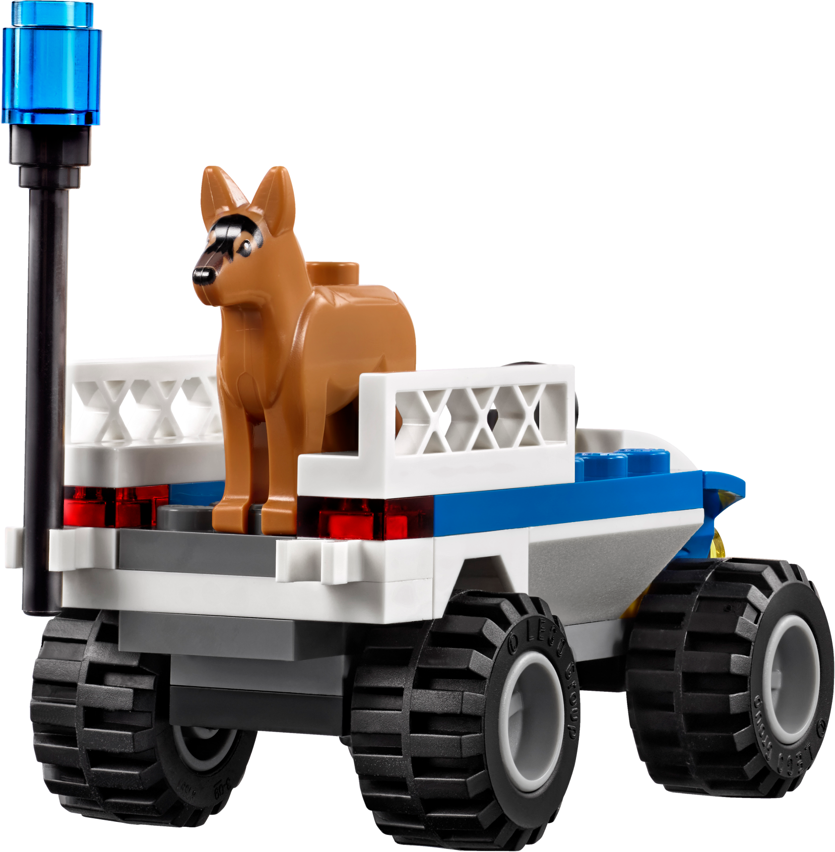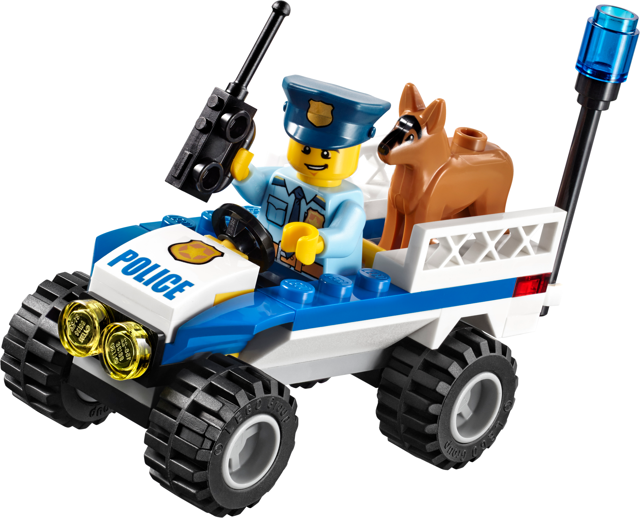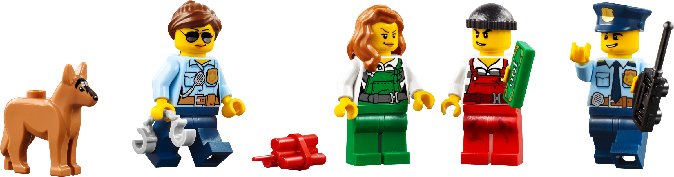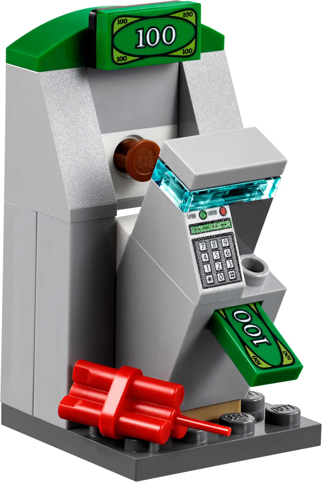 Be part of the action with the LEGO® City police as they stop the crooks from getting away with the money from the ATM, featuring a police ATV that includes a radio and a set of handcuffs, plus an ATM with breakout function and opening door on the back, money bills, dynamite and a jackhammer. Includes four minifigures plus a police dog figure. Includes four minifigures: two police officers and two crooks, plus a police dog figure. Features a police ATV with room for the dog figure in the back. Also includes a wall section with ATM breakout function, opening door on the back and space to hold money bills. Break out the ATM with the dynamite and crack it open with the jackhammer. Use the police radio to call for help from the police officer and his dog. Accessory elements include two money bills, a walkie-talkie, handcuffs, dynamite, backpack and a jackhammer. This set offers an age-appropriate build and play experience for ages 5-12. ATM measures over 1” (5cm) high, 1” (3cm) wide and 1” (3cm) deep. ATV measures over 2” (7cm) high, 3” (8cm) long and 1” (4cm) wide.