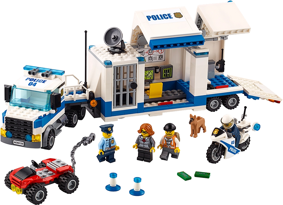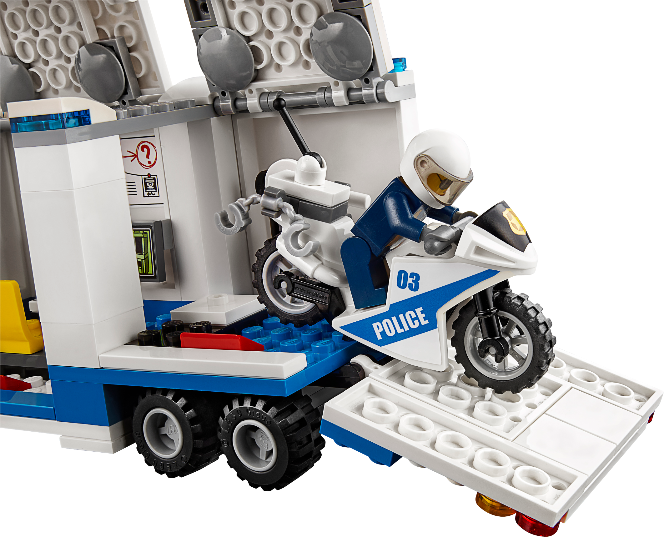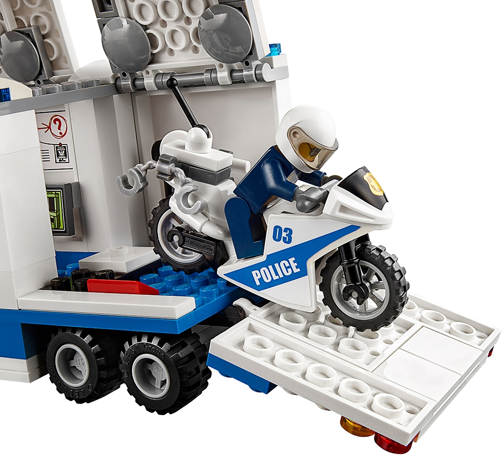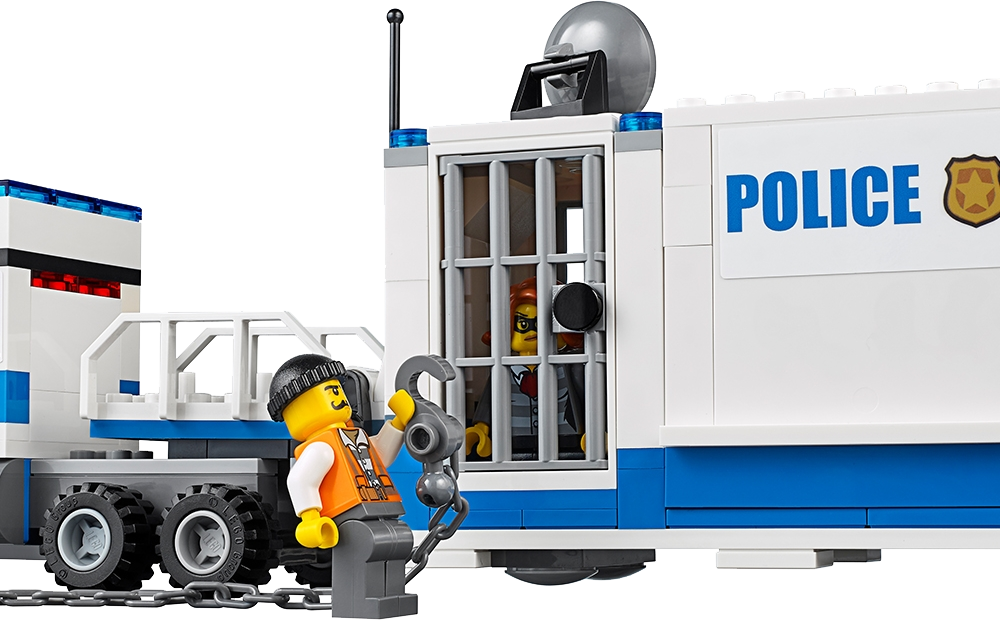 Be part of the action with the LEGO® City police as they stop the crook’s escape from the jail cell in the Mobile Command Center, featuring a detachable truck cab, room for two minifigures, monitoring room with screens, satellite dish, opening roof, side doors and rear ramp, storage area for the motorbike and tools and a jail cell breakout feature, plus the crooks’ ATV. Includes four minifigures and a police dog figure. Includes four minifigures: two police officers and two crooks, plus a police dog figure. Features a Mobile Command Center, police motorbike and crook’s ATV. Mobile Command Center features a detachable cab, jail cell with breakout feature and room for two minifigures, monitoring room with screens, satellite dish on the roof, desk, seat and storage area for the motorbike and tools at the back of the trailer. Crooks' ATV features a chain and hook. Attach the ATV's hook and chain to the jail cell door bars to break out the crook. Set up the Mobile Command Center and unload the police motorbike. Catch the crooks and lock them back up in the cell. Accessory elements include a mug, backpack, two money bills, two cones, wrench, walkie-talkie, lollypop stop sign and a set of handcuffs. This set offers an age-appropriate build and play experience for ages 6-12. Truck cab measures over 3” (8cm) high, 5” (13cm) long and 2” (7cm) wide. Mobile Command Center measuresover 4” (11cm) high, 9” (23cm) long and 2” (6cm) wide. ATV measures over 1” (3cm) high, 2” (7cm) long and 1” (5cm) wide. Motorbike measures over 1” (3cm) high, 2” (7cm) long and under 1” (2cm) wide.