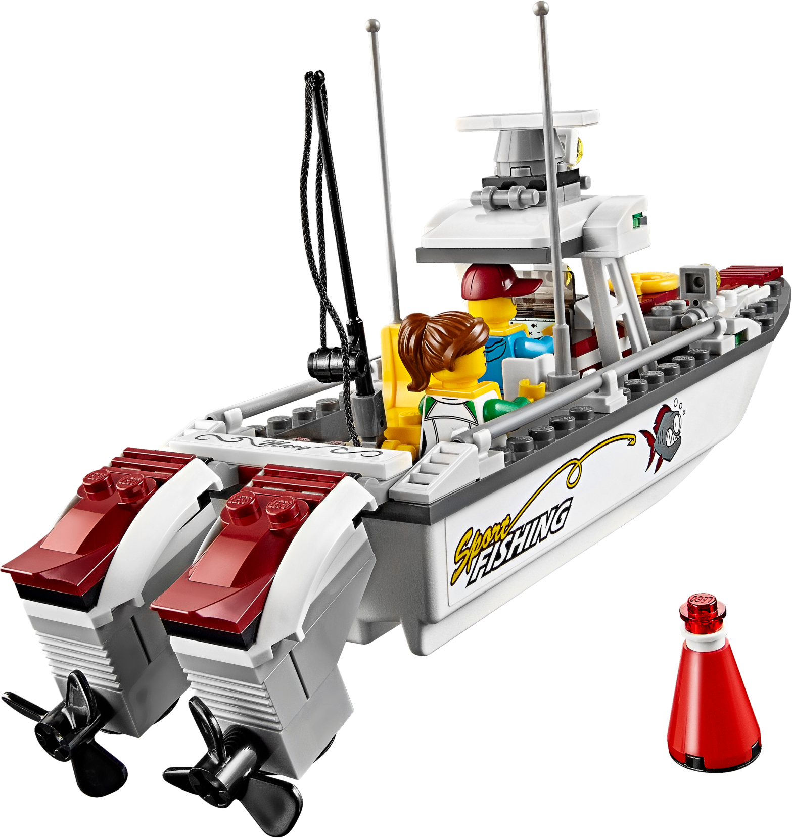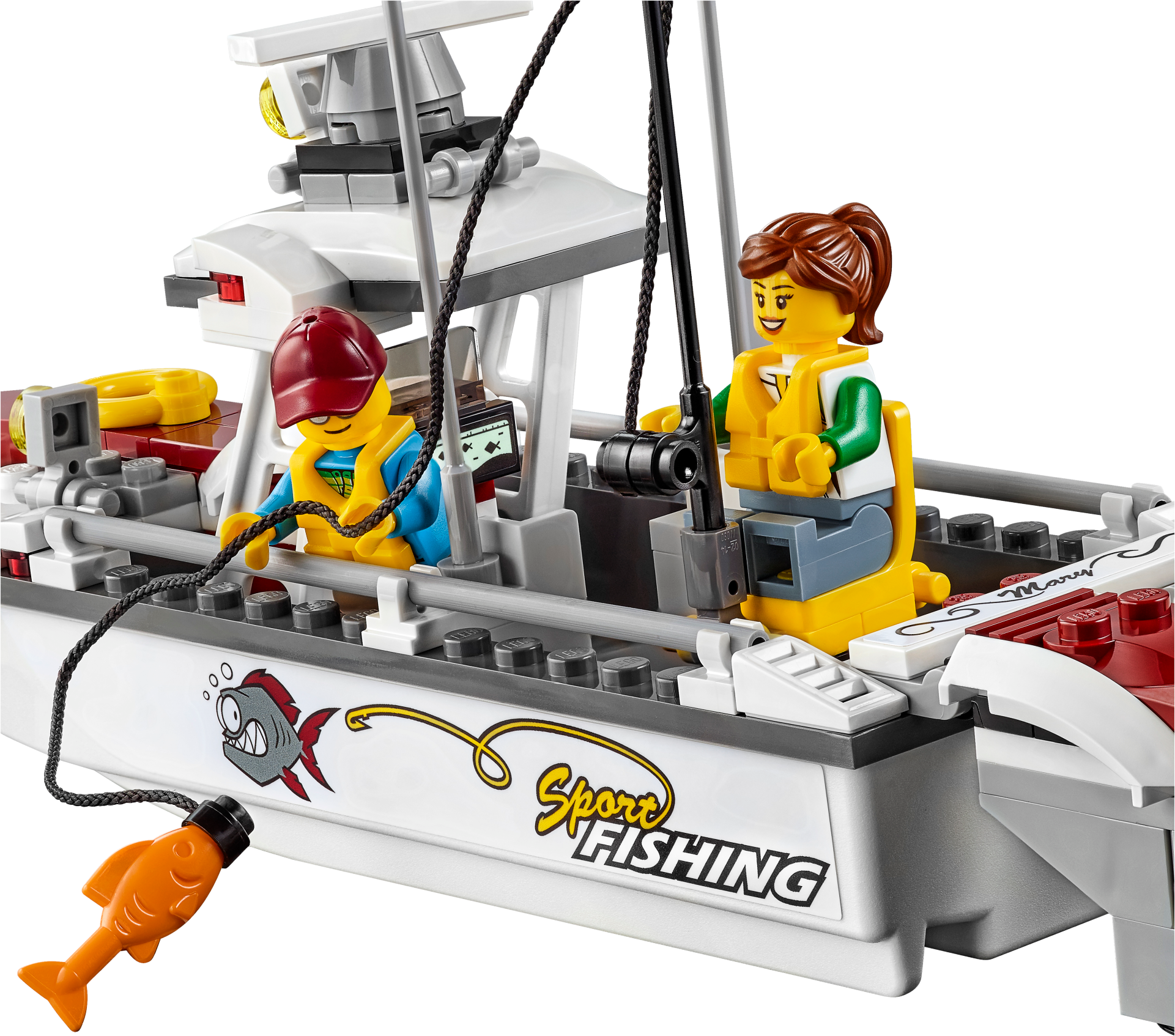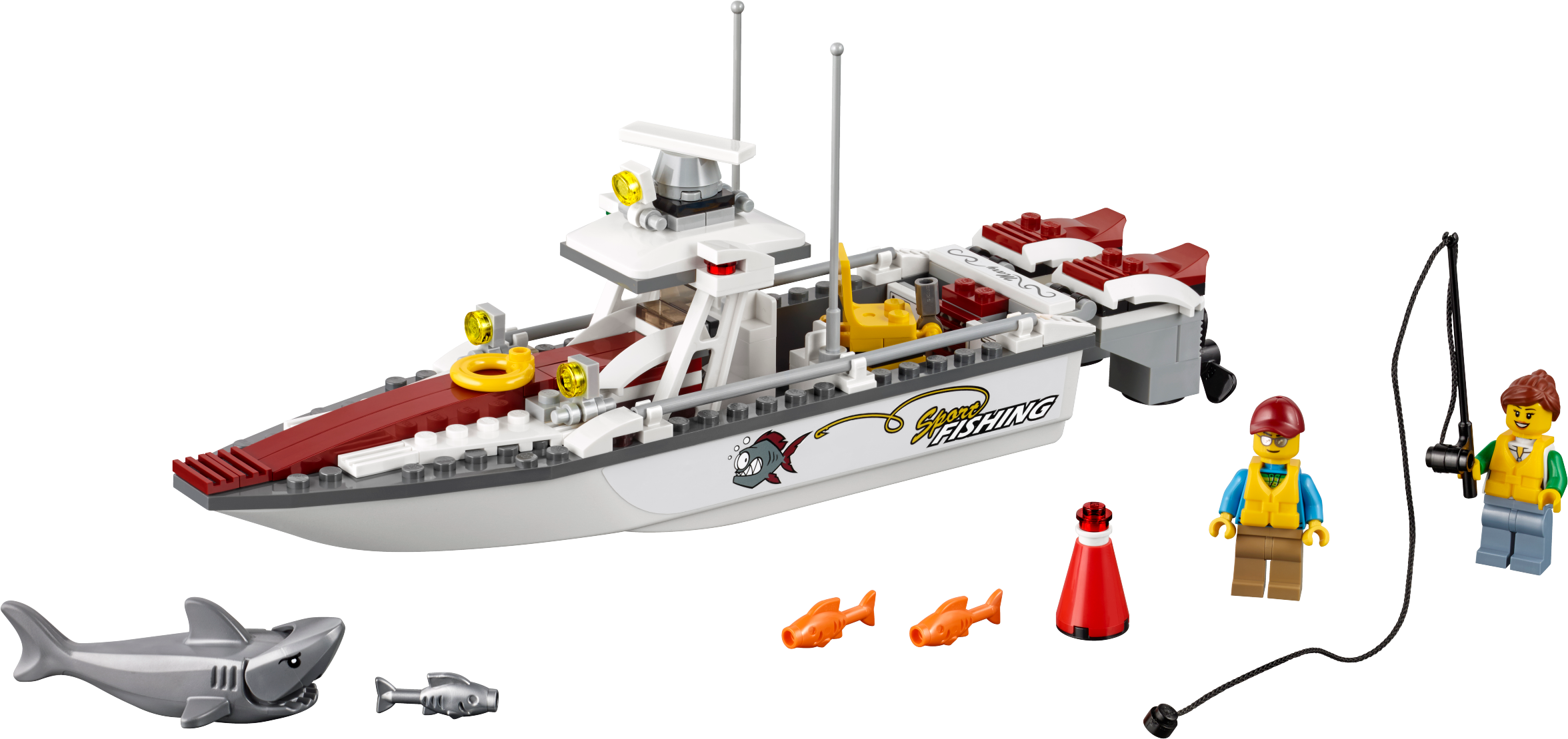 Accessory elements include two life vests, one grey fish, two orange fish, fishing rod and a buildable buoy.