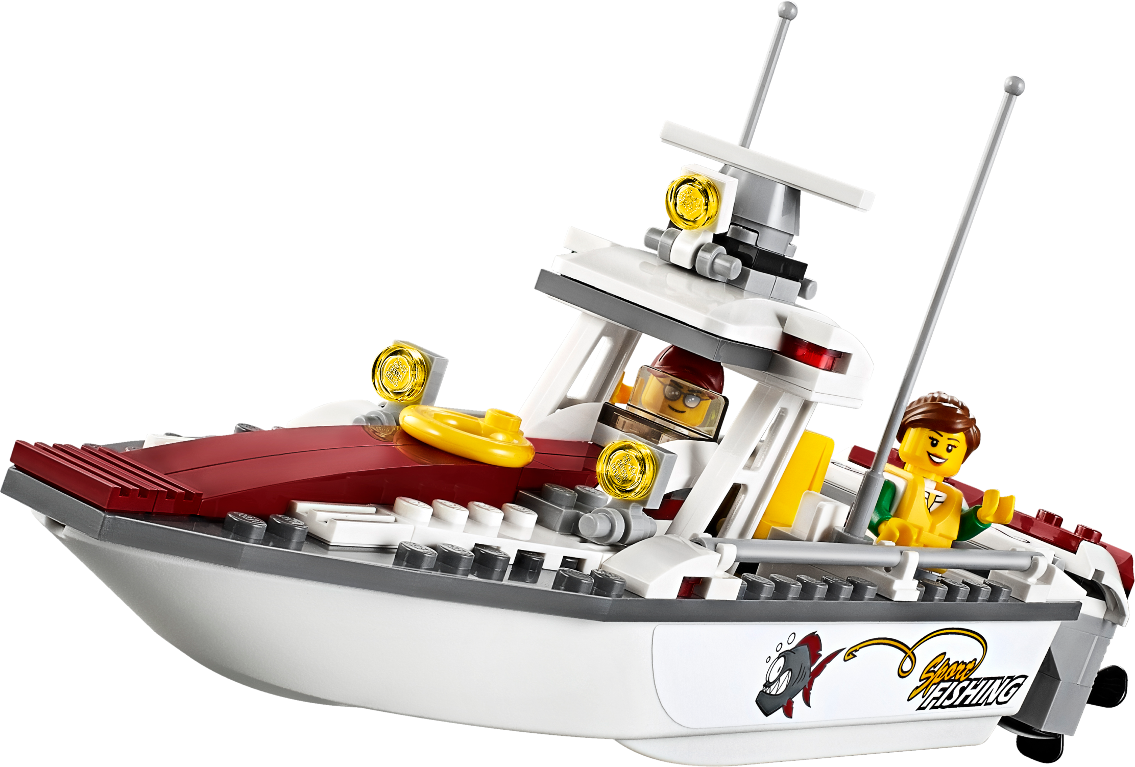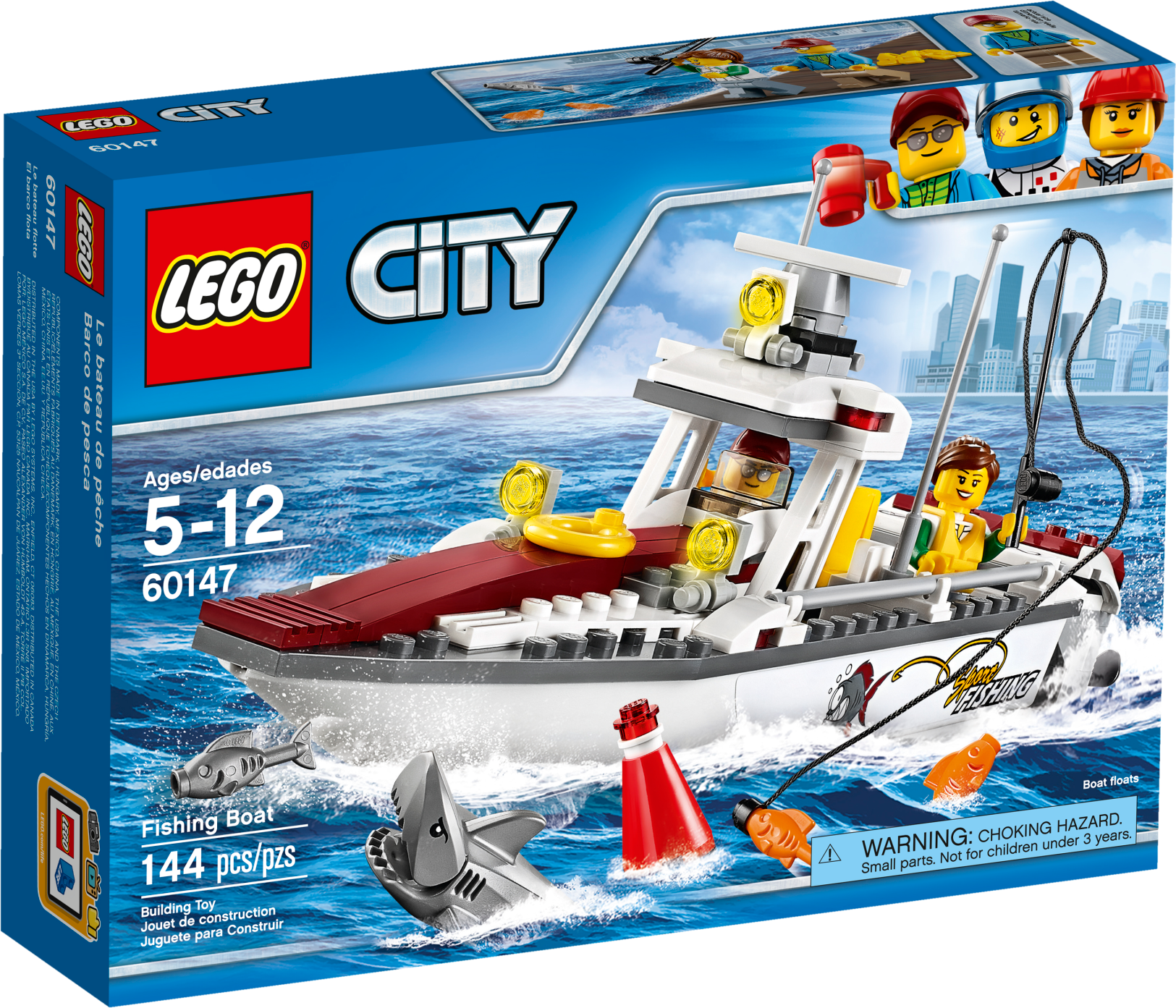 Get behind the controls of the LEGO® City Fishing Boat, featuring two motors with spinning propellers, swiveling chair with a hook for the fishing rod, canopy with driver’s console, plus three fish, a shark figure with an opening mouth and a buoy. Includes two minifigures.