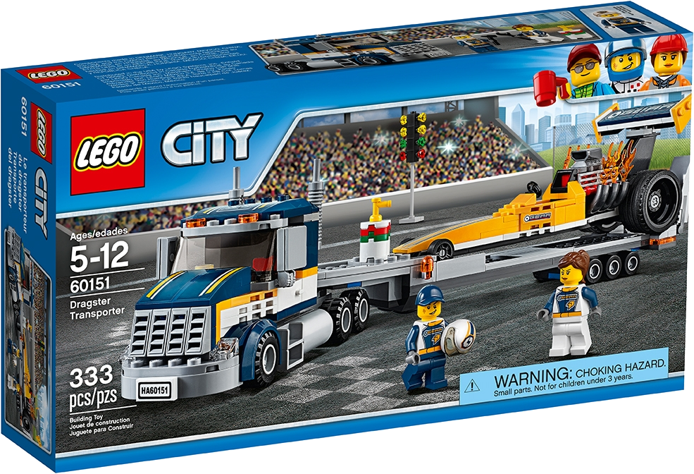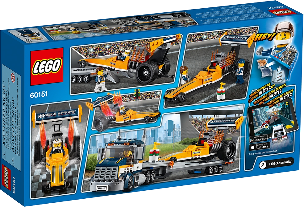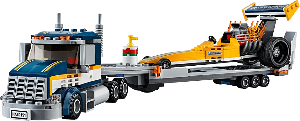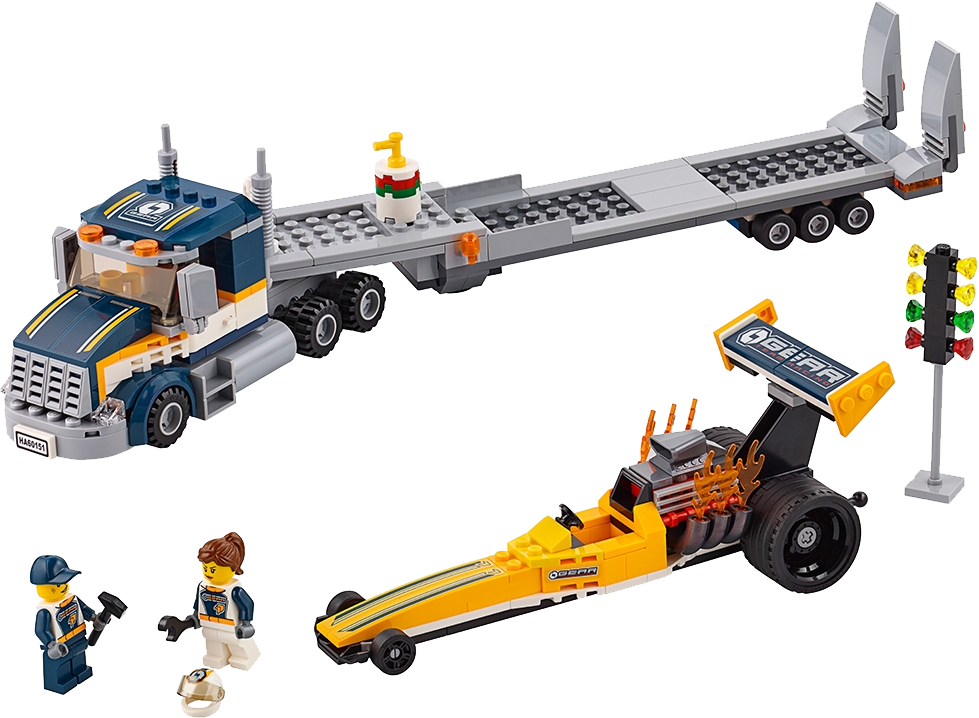 Join the racing crowd with the LEGO® City Dragster Transporter, featuring a transporter truck with detachable trailer, a dragster with extended wing and flames coming from the engine and a light signal. Includes two minifigures.