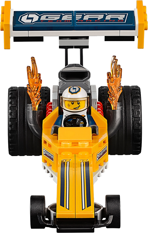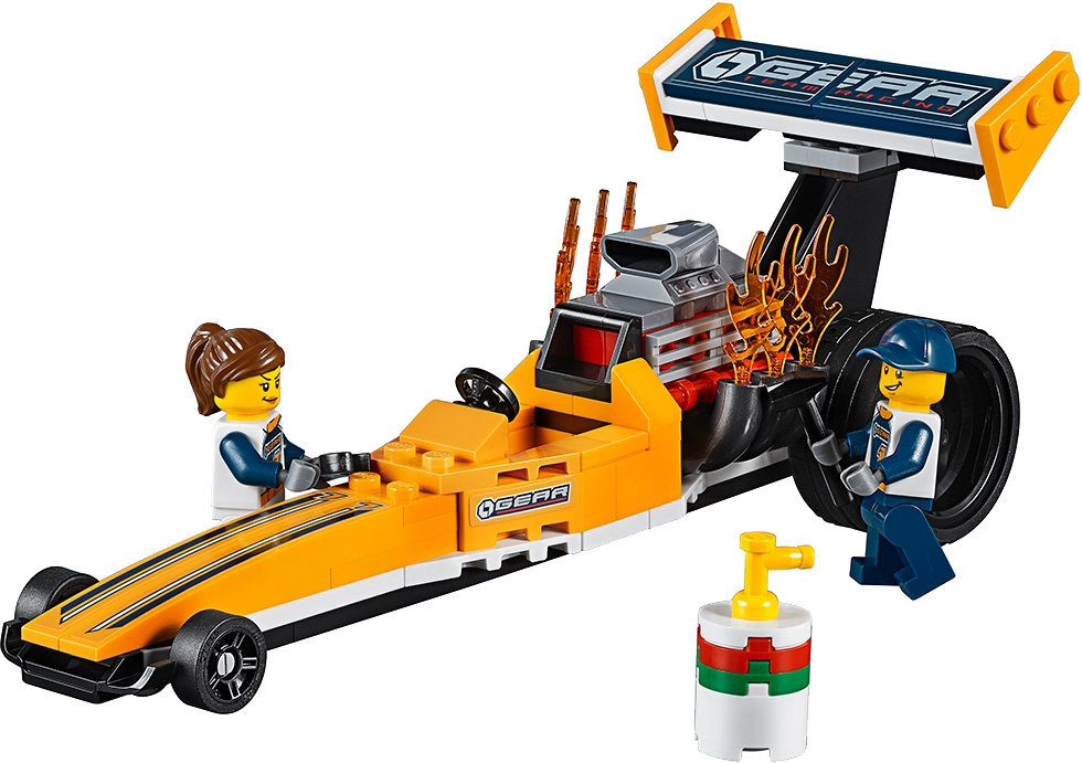 Includes two minifigures: a truck driver and dragster driver.