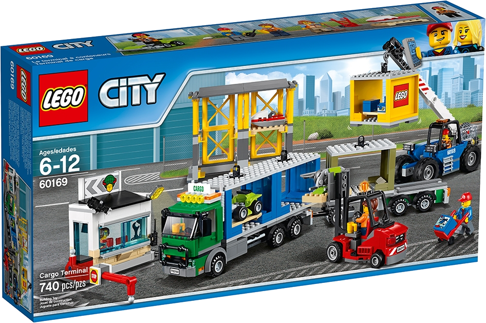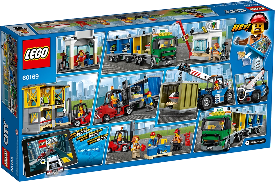 Join the crew keeping the citizens of LEGO® City supplied with goods from the Cargo Terminal, featuring a truck with trailer, forklift with moving blades, telehandler with an opening cockpit and telescopic arm, gatehouse with raising barrier and sliding window, and a pallet storage rack plus 4 pallets of items, including a lawnmower and water scooter, and other fun accessories. Includes 4 minifigures.