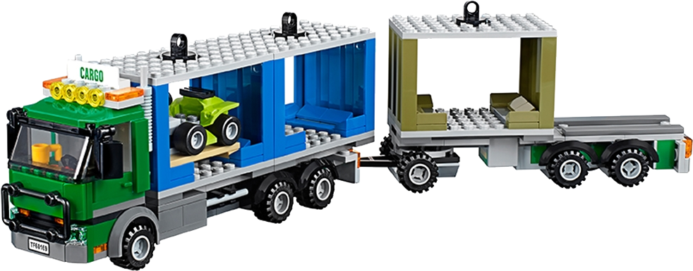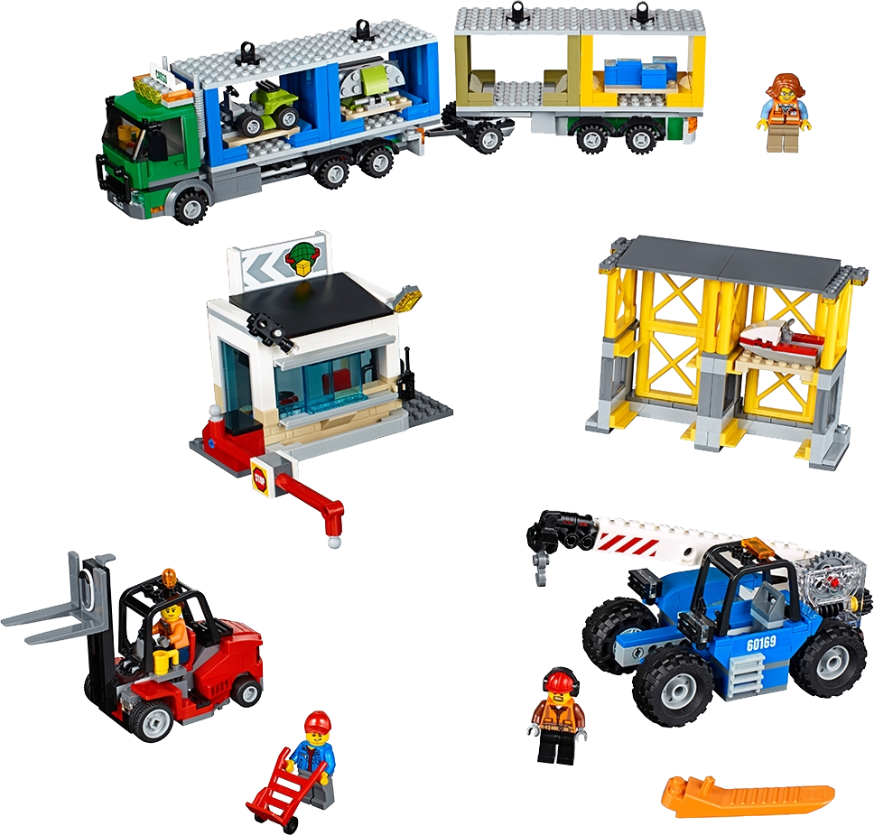 Features a truck with minifigure cab, trailer and space for 4 containers, a working forklift with minifigure cab and a telehandler with rotating, telescopic arm and minifigure cab.
