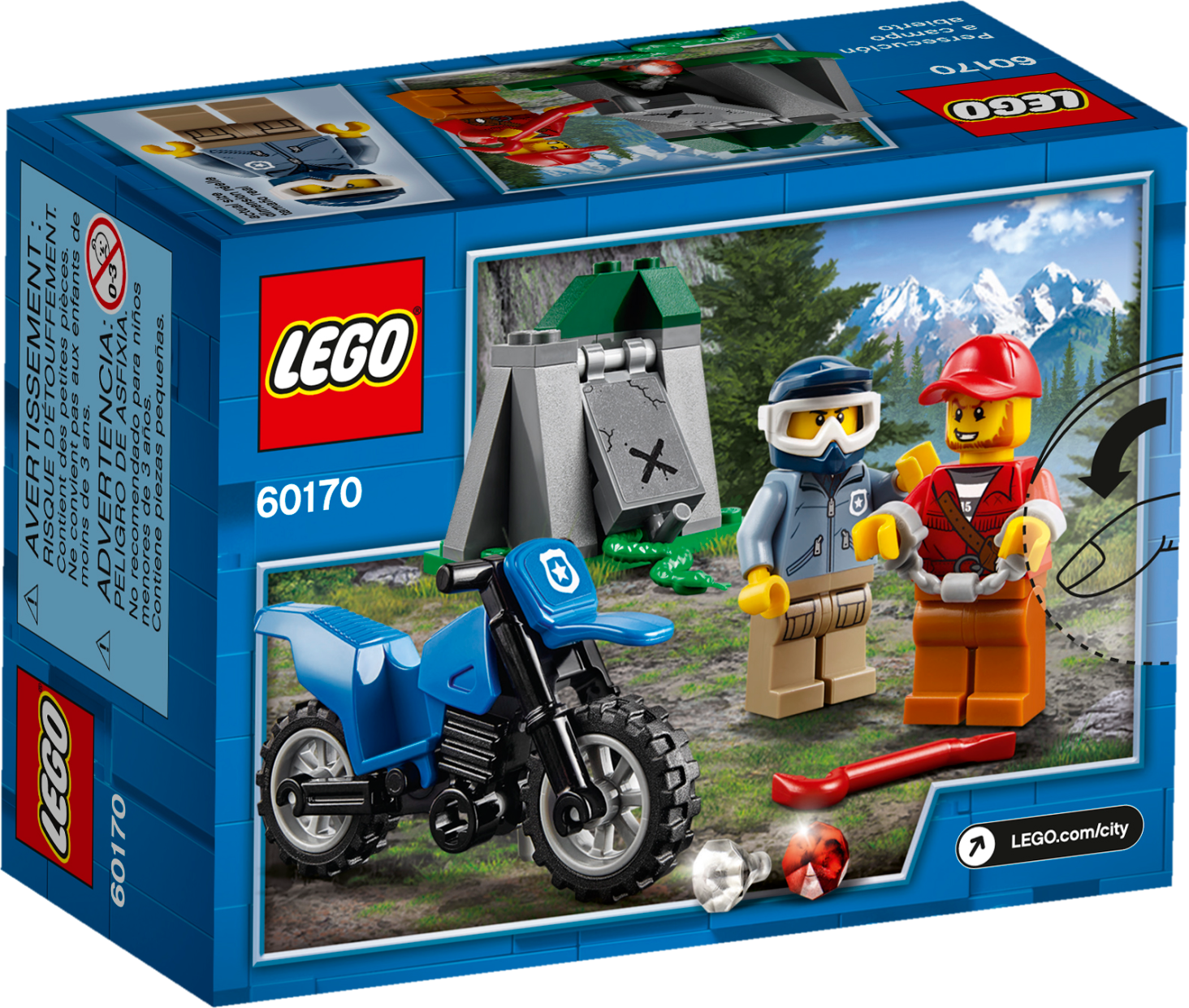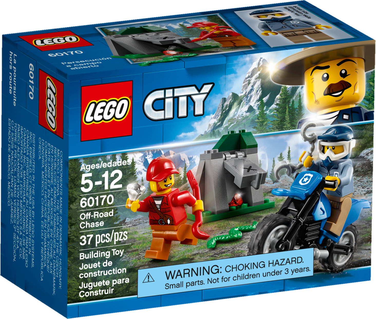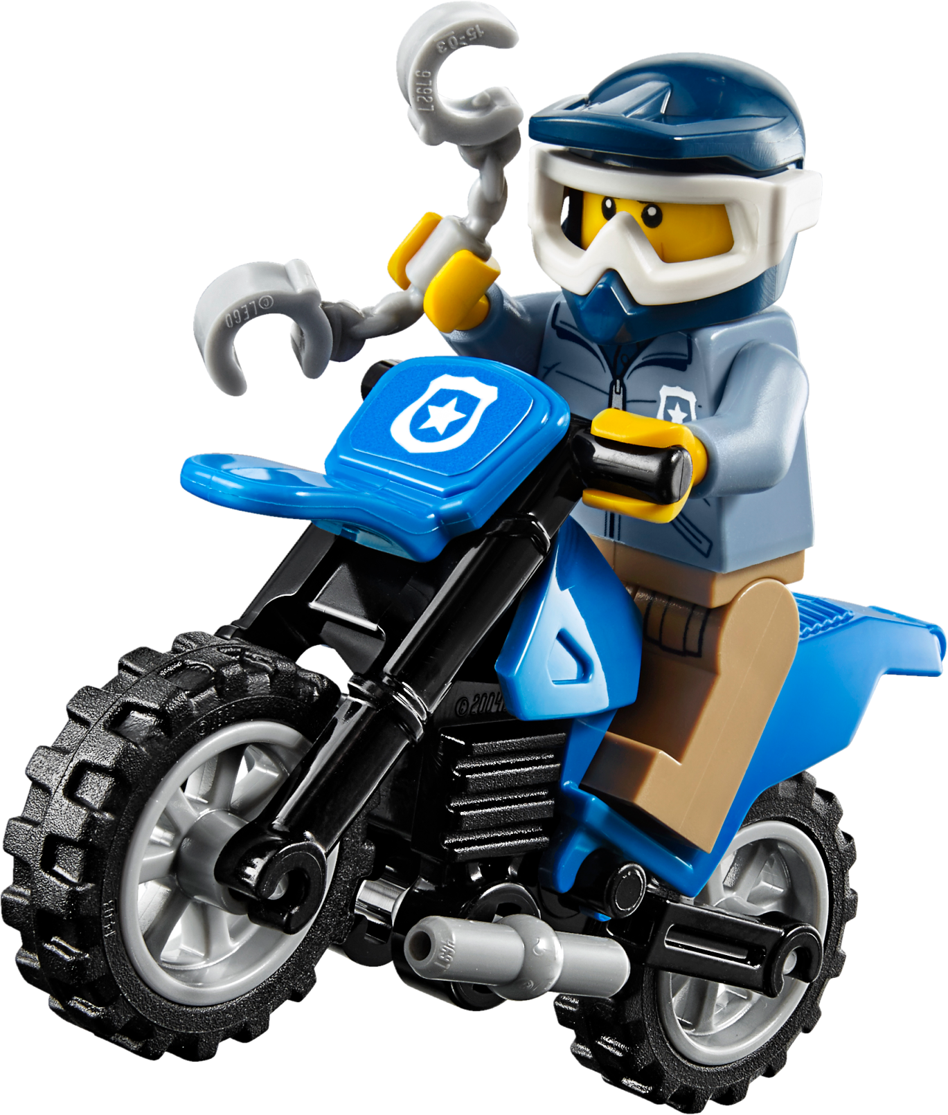 Pick up your badge and join the LEGO® City Mountain Police officer on an Off-Road Chase to help stop the crook! This fun building toy set features a crook’s hideout with space for loot and greenery and a police motocross bike with off-road tires and kickstand. Includes 2 minifigures and a snake figure.