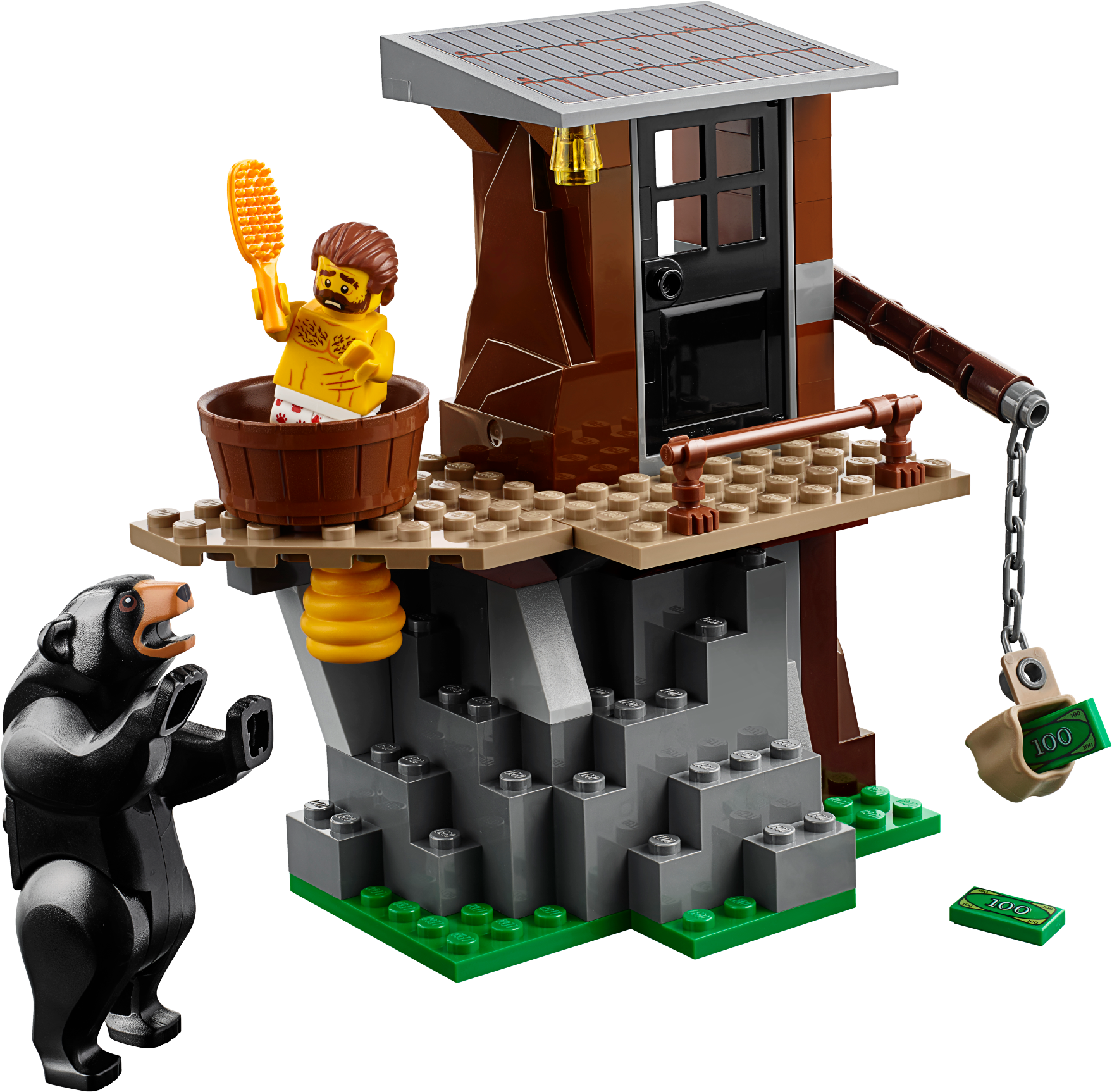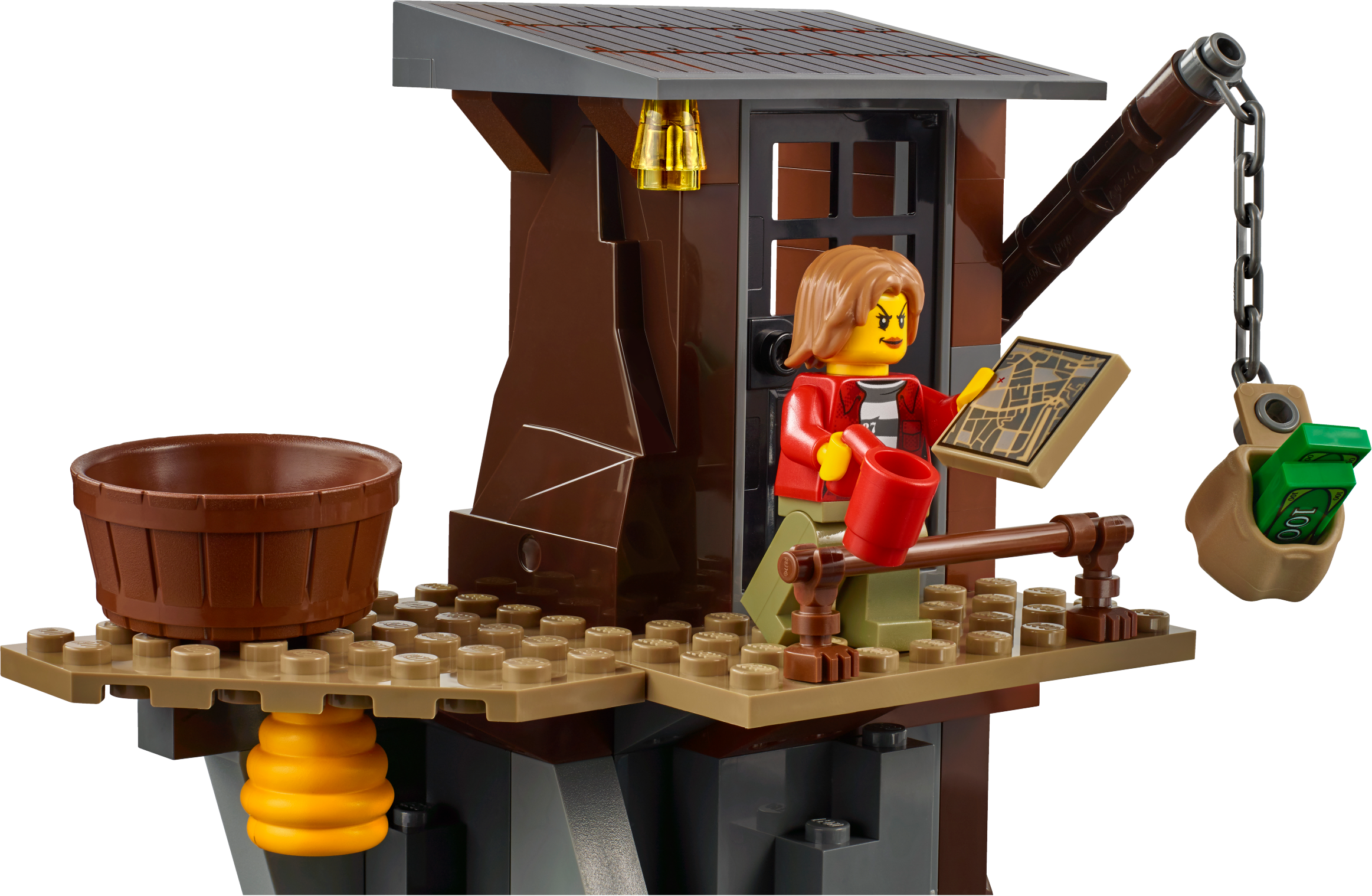 Features a 2-level crooks’ hideout with bathtub, opening door, beehive and crane with chain.
